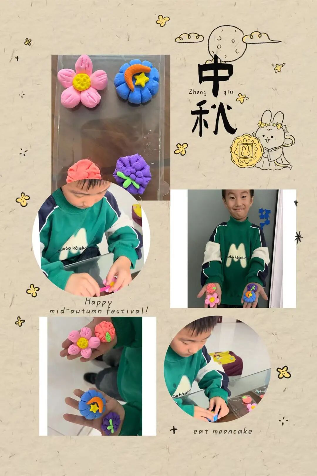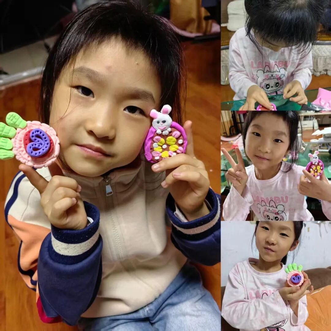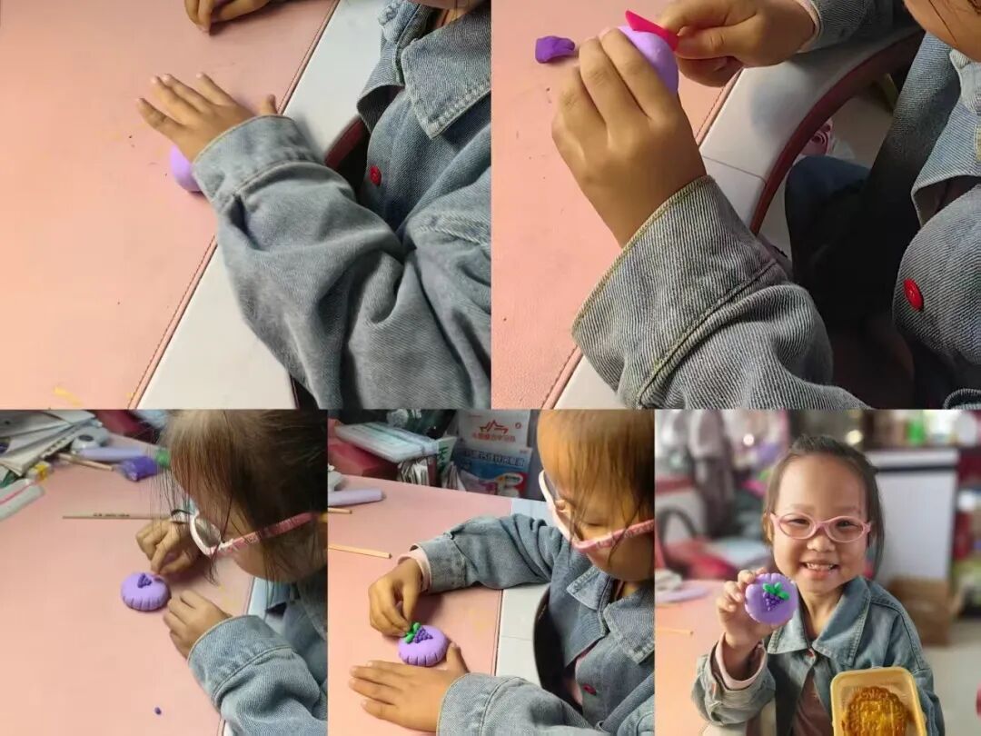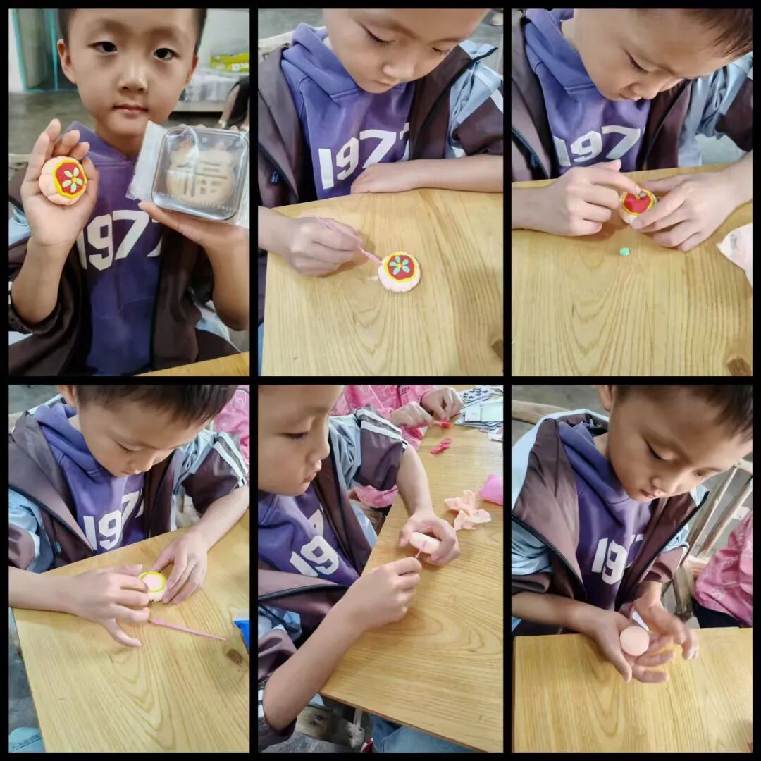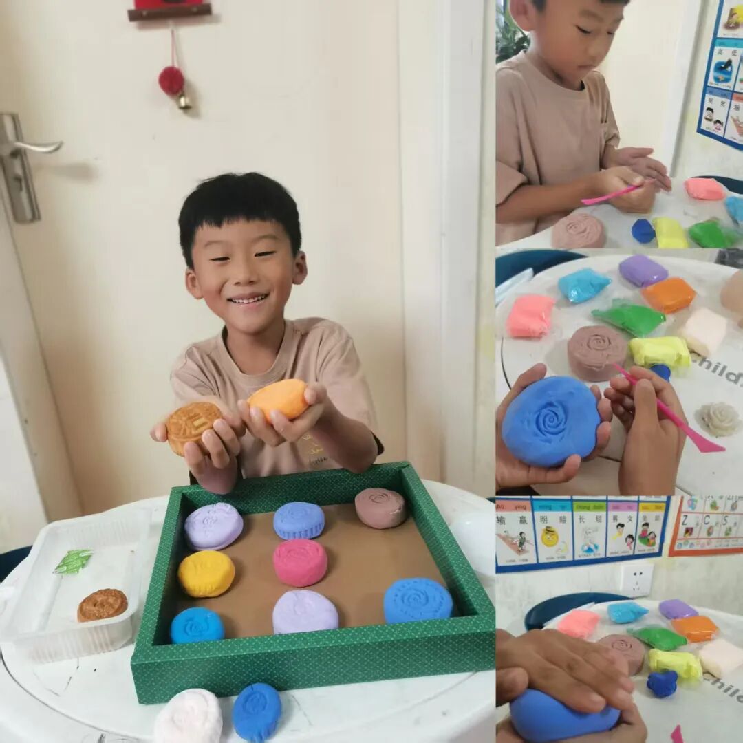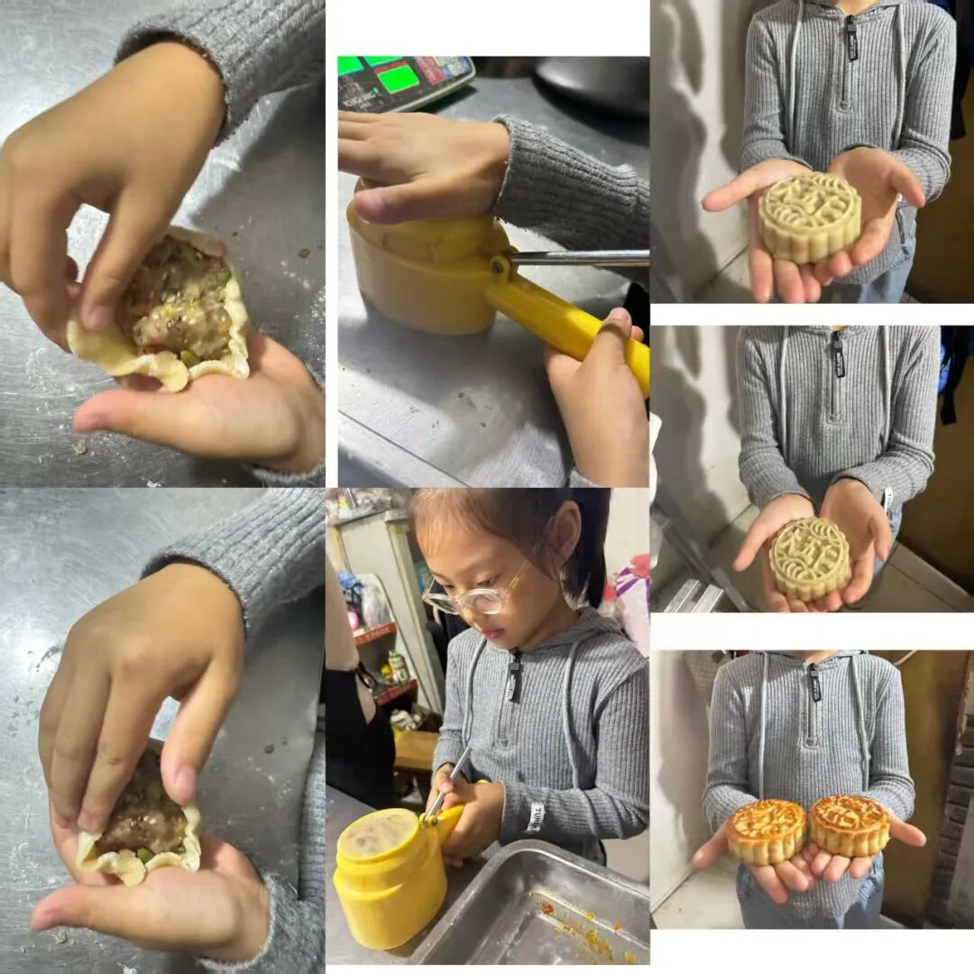 家长与孩子默契合作,开启了一场趣味十足的“月饼创作之旅”。有的用粘土捏出憨态可掬的卡通月饼,有的用冰皮和馅料制作出软糯香甜的真实月饼。揉、捏、压、包,每一个步骤都充满欢声笑语,孩子们不仅记录下制作过程,还与自己的“中秋作品”合影,定格这份动手的快乐与节日的甜蜜。
