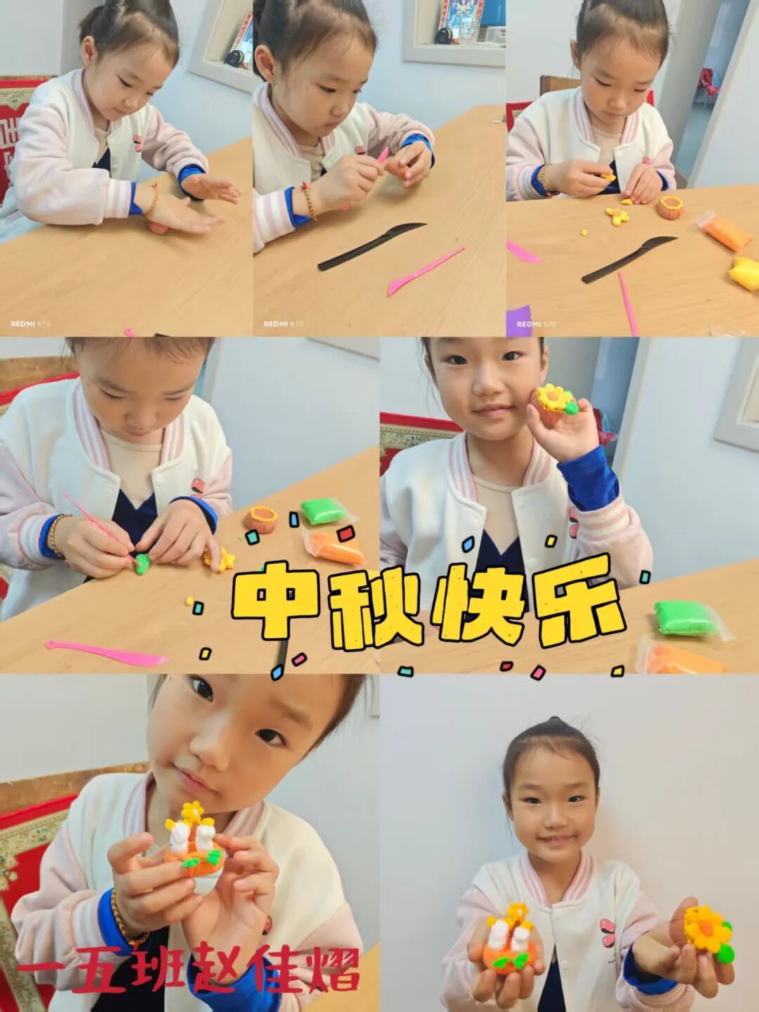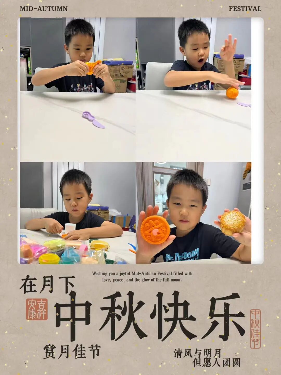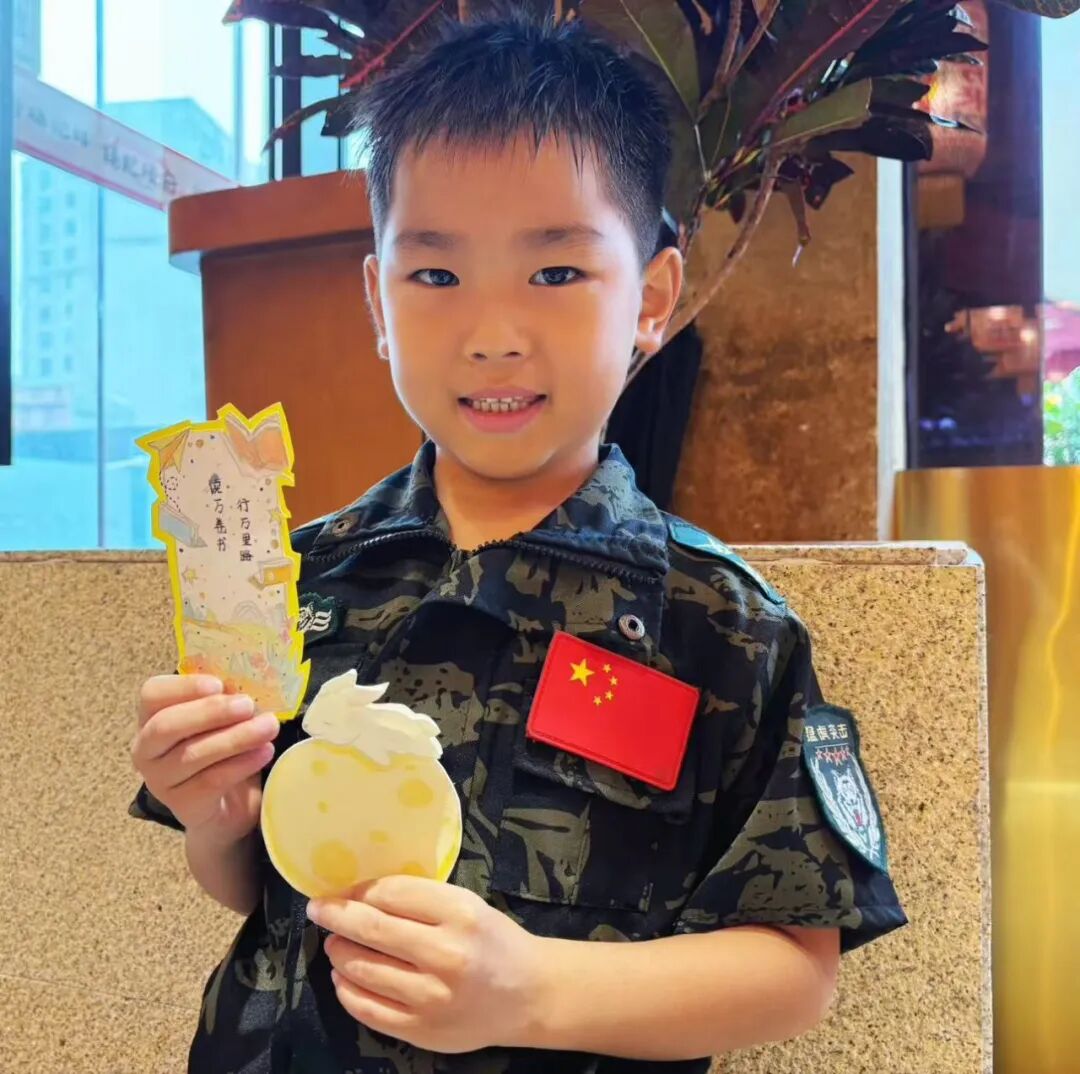 中秋的温暖,藏在一顿热气腾腾的团圆饭里。孩子们与家人围坐餐桌,共享美味佳肴,用相机拍下温馨合影,留住幸福瞬间。此外,他们还精心制作祝福书签,将对家人的爱意与中秋祝福写在上面,亲手送给家人,让这份节日的温暖在亲情间传递。