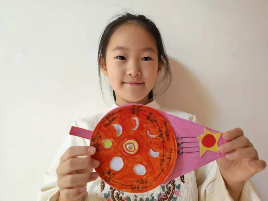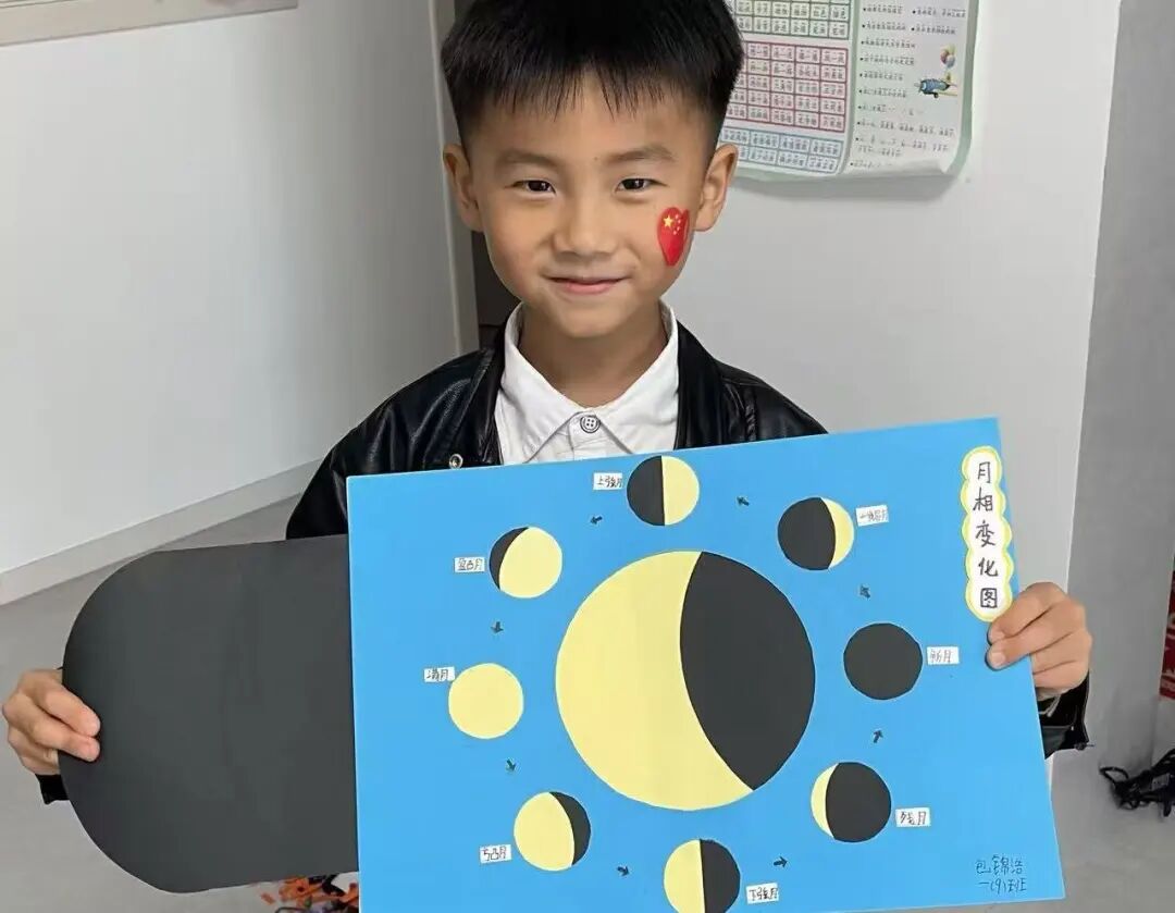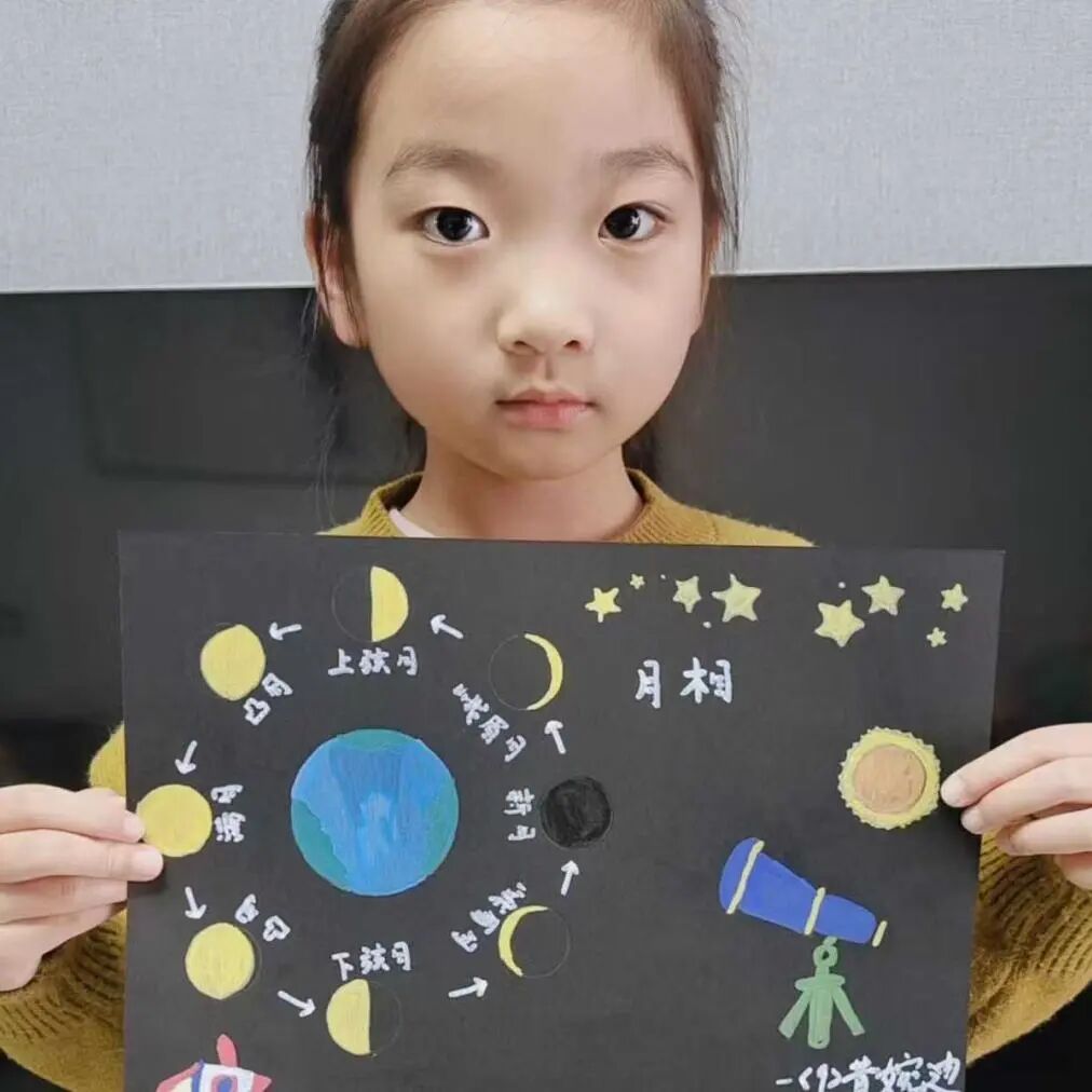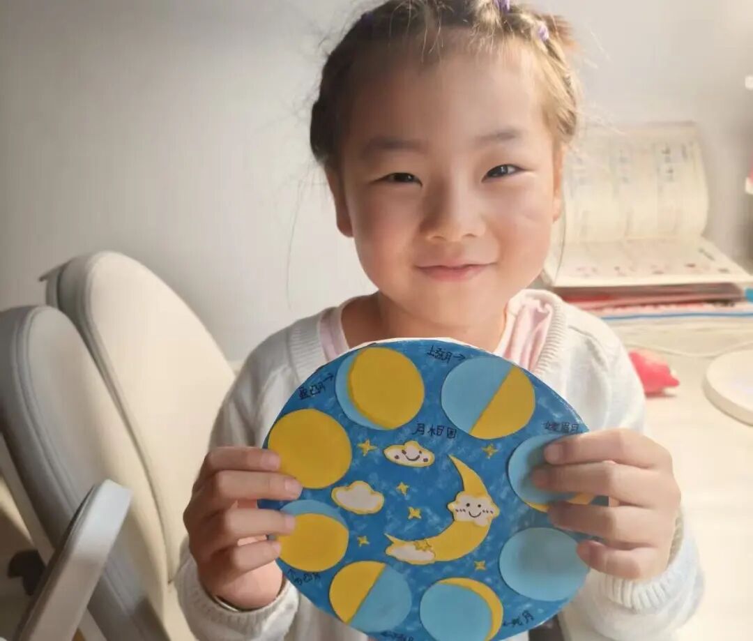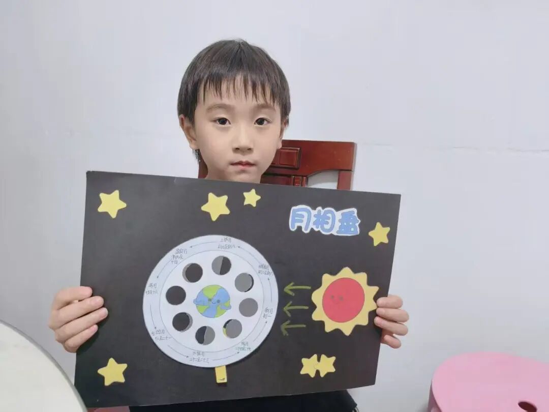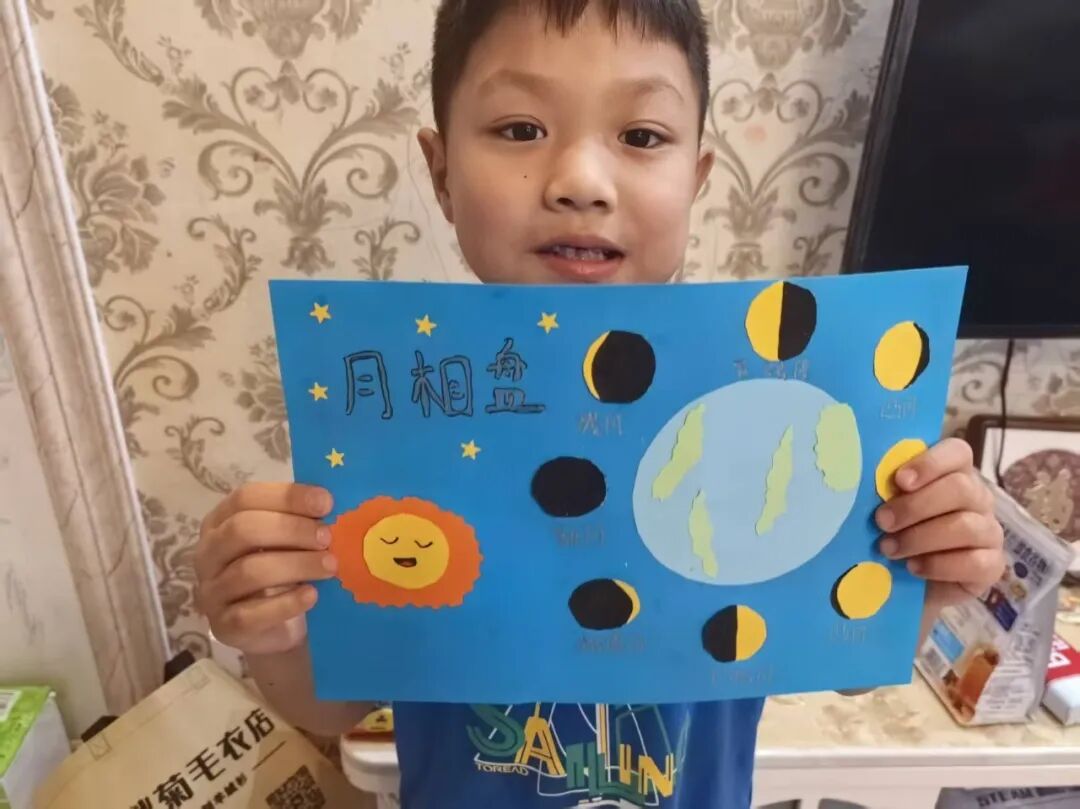 “月亮为什么有时候像小船,有时候像圆盘?”带着对月亮的好奇,孩子们动手制作月相盘。他们以圆形卡纸为底,将剪好的新月、上弦月、满月等月相一一上色,再按顺序精心粘贴,最后用彩笔添上星星、云朵装饰。一个个色彩鲜艳、排布准确的月相盘诞生,孩子们在动手实践中轻松掌握了月相变化的科学知识,感受着中秋与科学碰撞的乐趣。