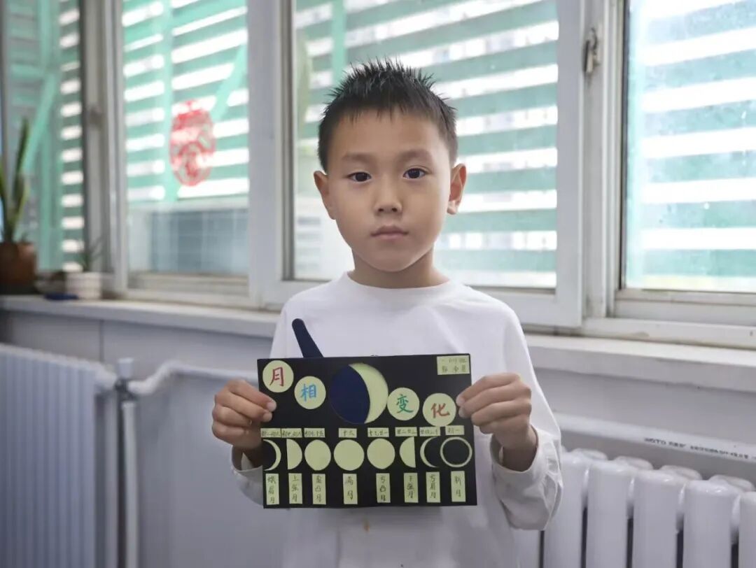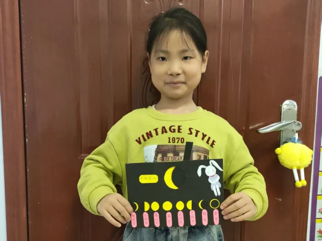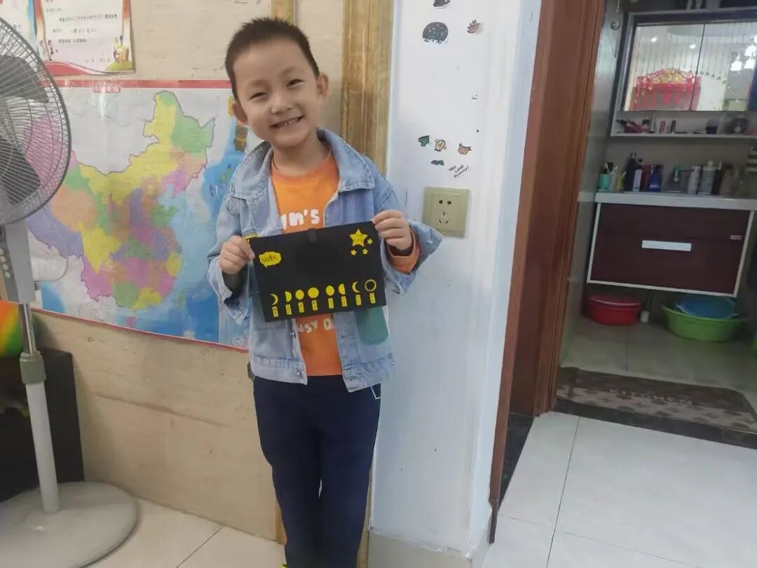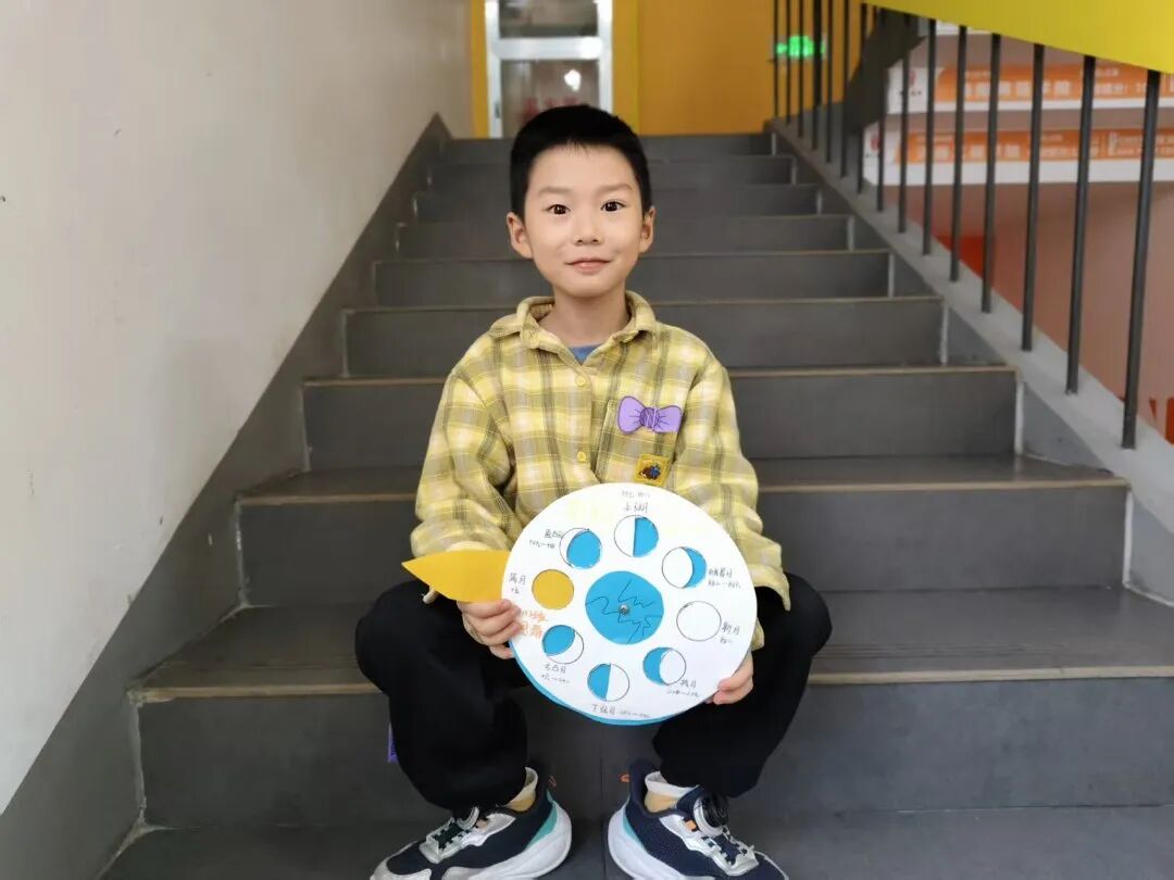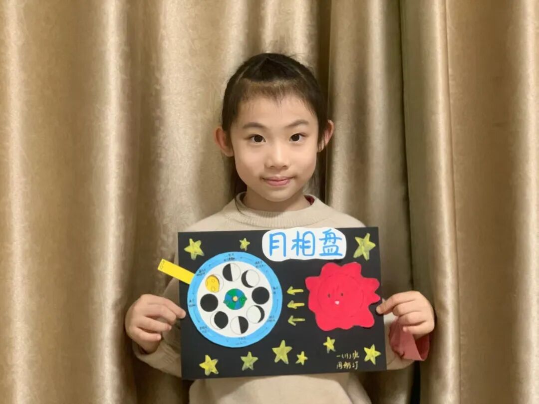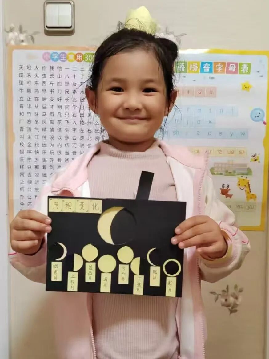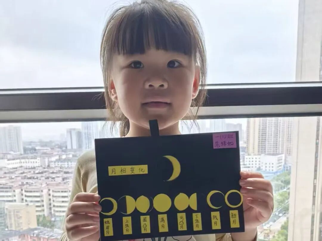 “月亮为什么有时候像小船,有时候像圆盘?”带着对月亮的好奇,孩子们动手制作月相盘。他们以圆形卡纸为底,将剪好的新月、上弦月、满月等月相一一上色,再按顺序精心粘贴,最后用彩笔添上星星、云朵装饰。一个个色彩鲜艳、排布准确的月相盘诞生,孩子们在动手实践中轻松掌握了月相变化的科学知识,感受着中秋与科学碰撞的乐趣。