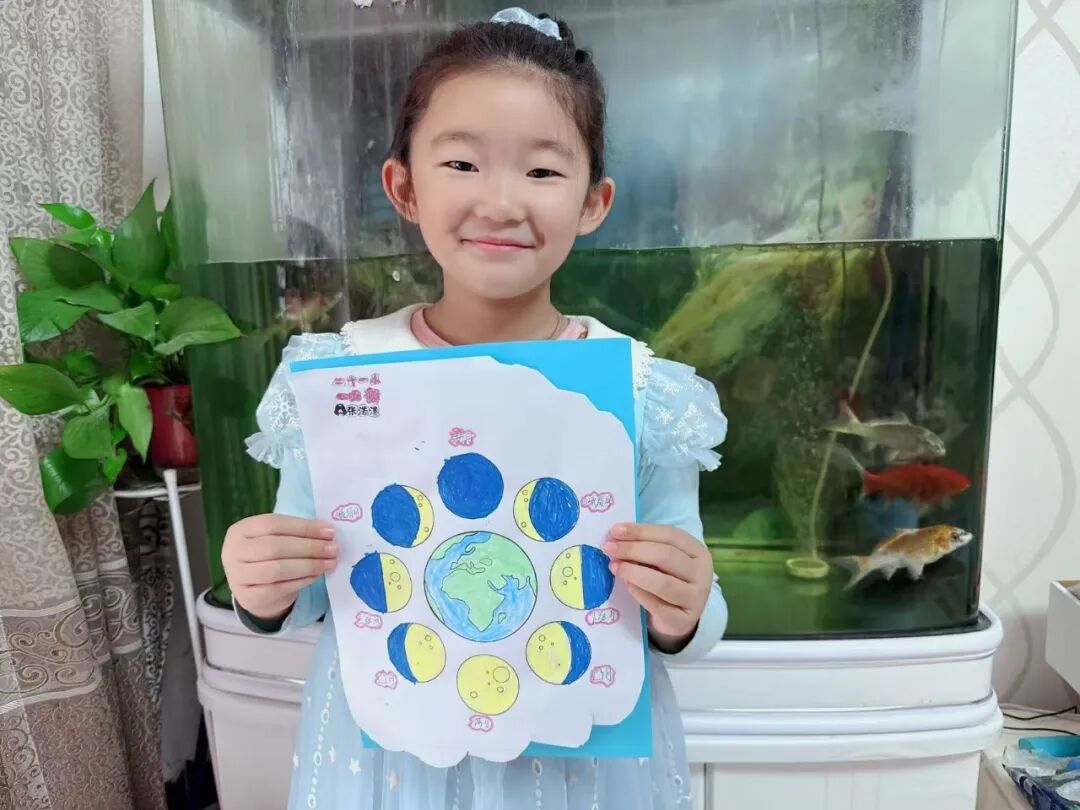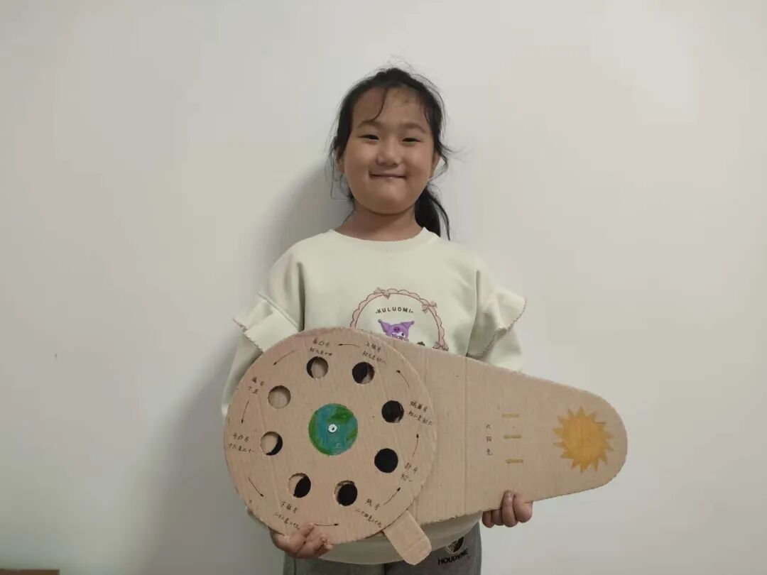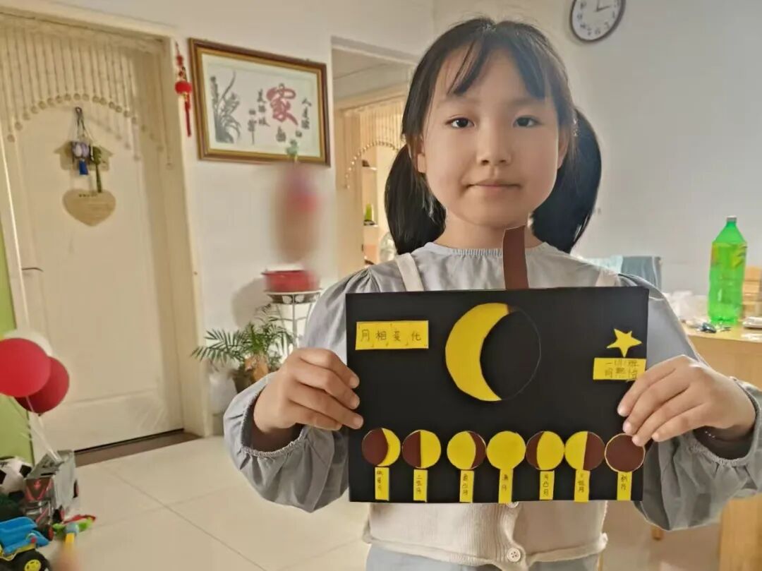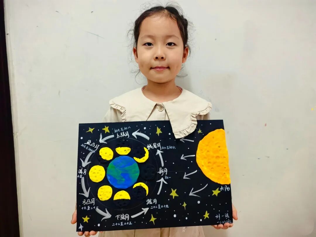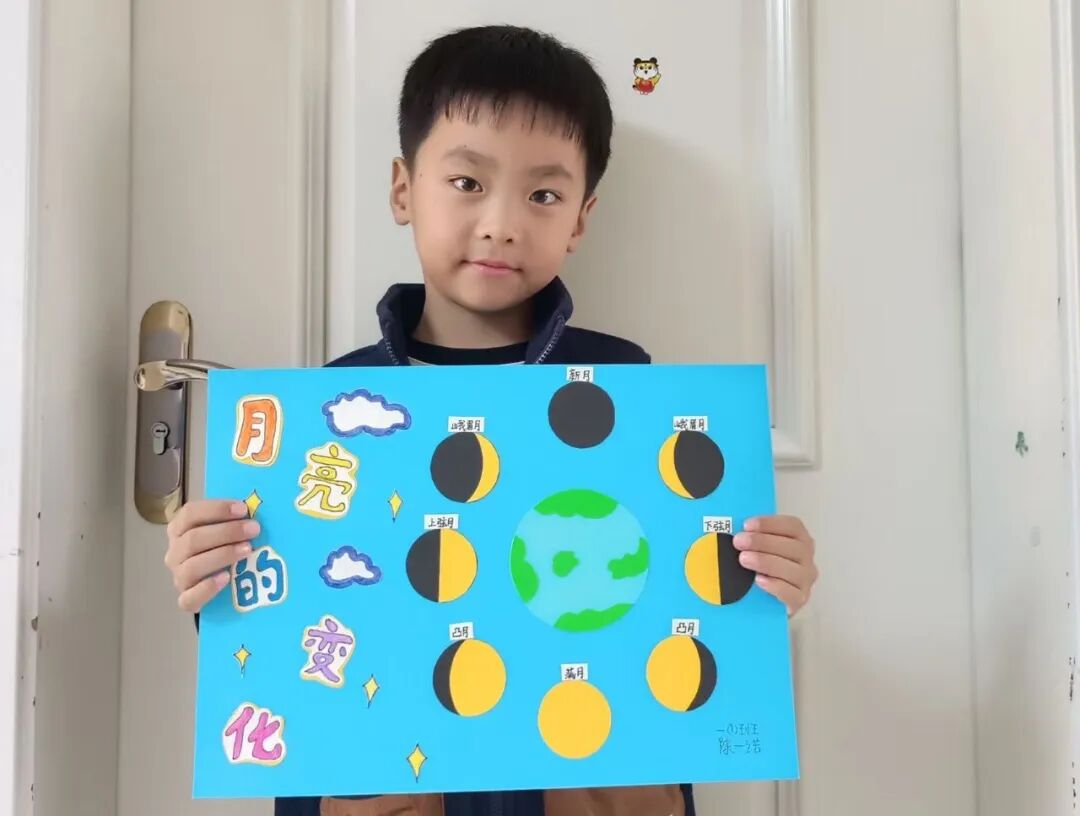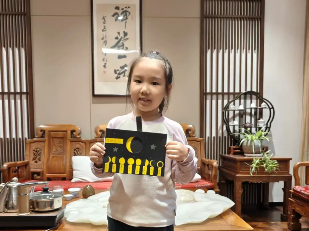 “月亮为什么有时候像小船,有时候像圆盘?”带着对月亮的好奇,孩子们动手制作月相盘。他们以圆形卡纸为底,将剪好的新月、上弦月、满月等月相一一上色,再按顺序精心粘贴,最后用彩笔添上星星、云朵装饰。一个个色彩鲜艳、排布准确的月相盘诞生,孩子们在动手实践中轻松掌握了月相变化的科学知识,感受着中秋与科学碰撞的乐趣。