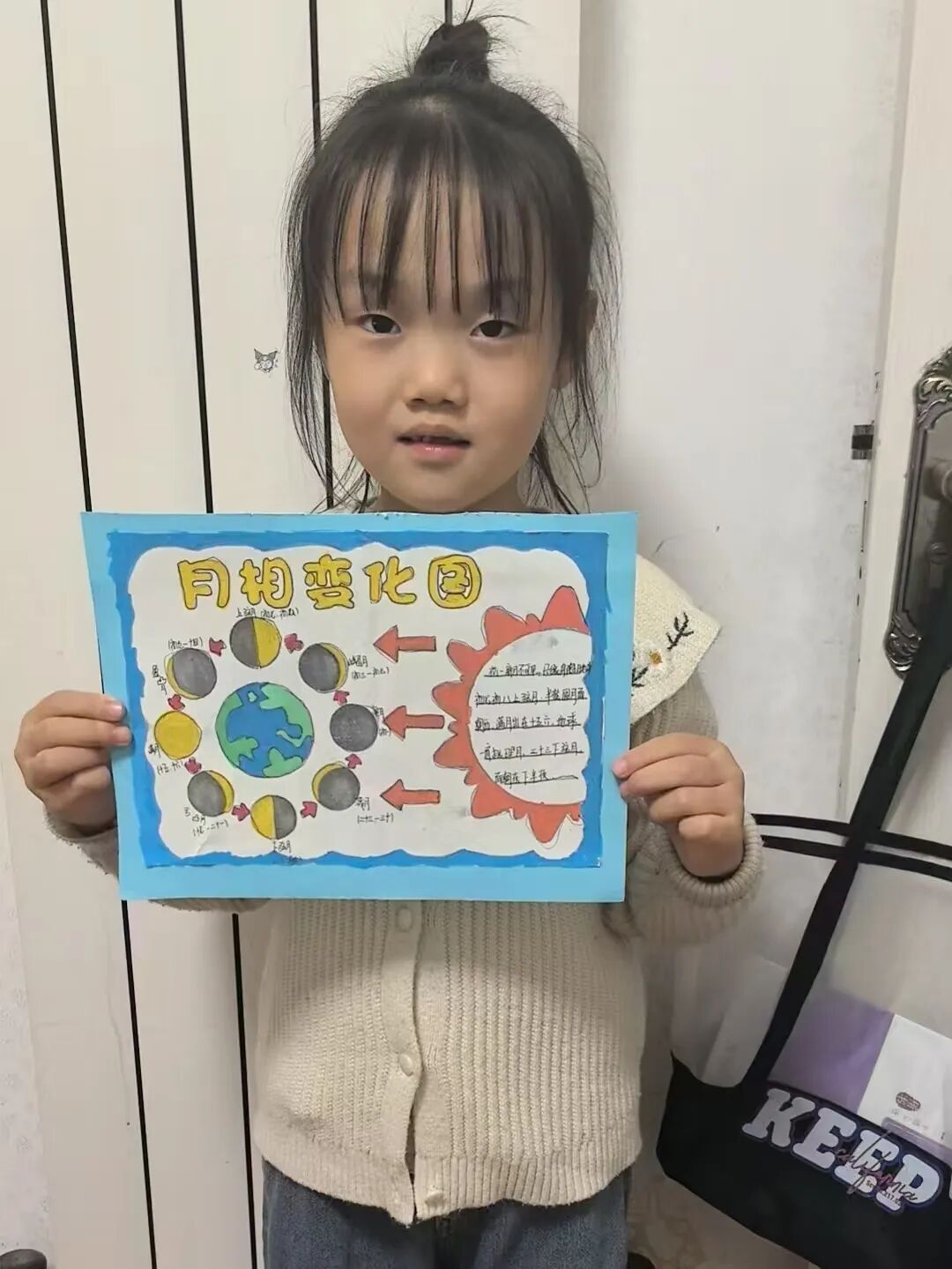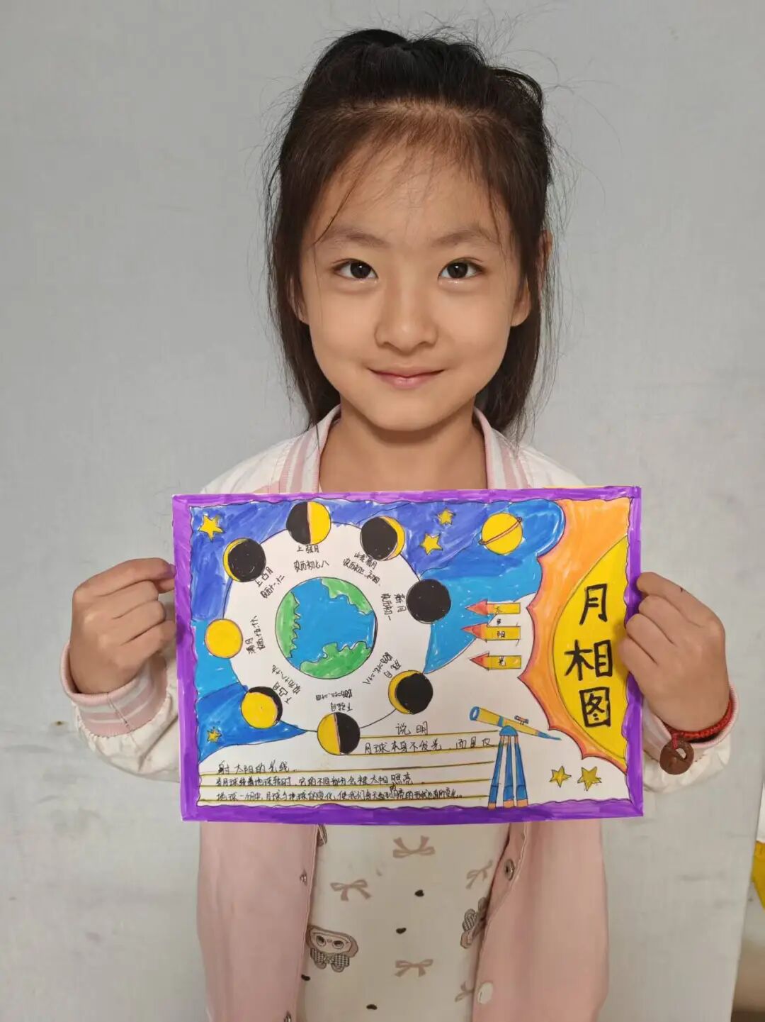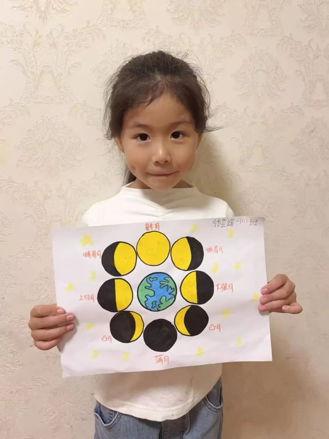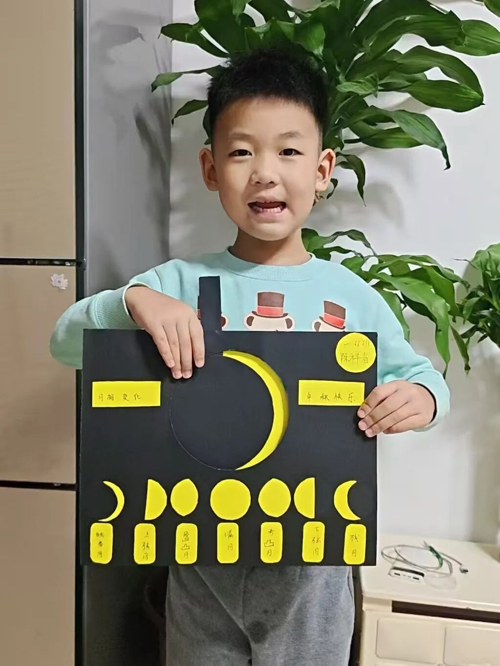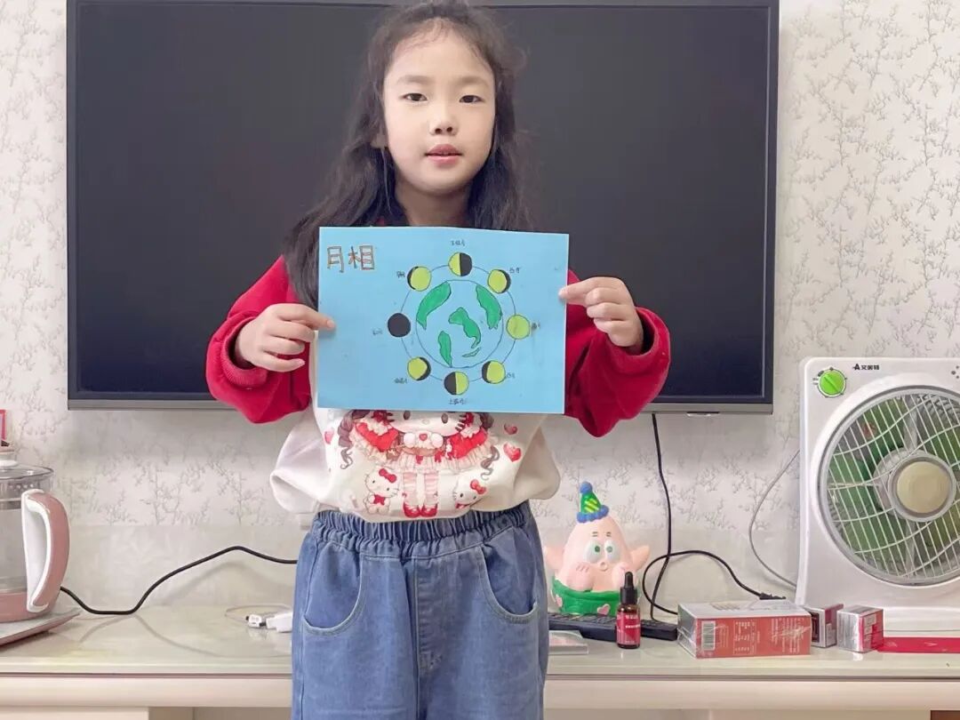 “月亮为什么有时候像小船,有时候像圆盘?”带着对月亮的好奇,孩子们动手制作月相盘。他们以圆形卡纸为底,将剪好的新月、上弦月、满月等月相一一上色,再按顺序精心粘贴,最后用彩笔添上星星、云朵装饰。一个个色彩鲜艳、排布准确的月相盘诞生,孩子们在动手实践中轻松掌握了月相变化的科学知识,感受着中秋与科学碰撞的乐趣。