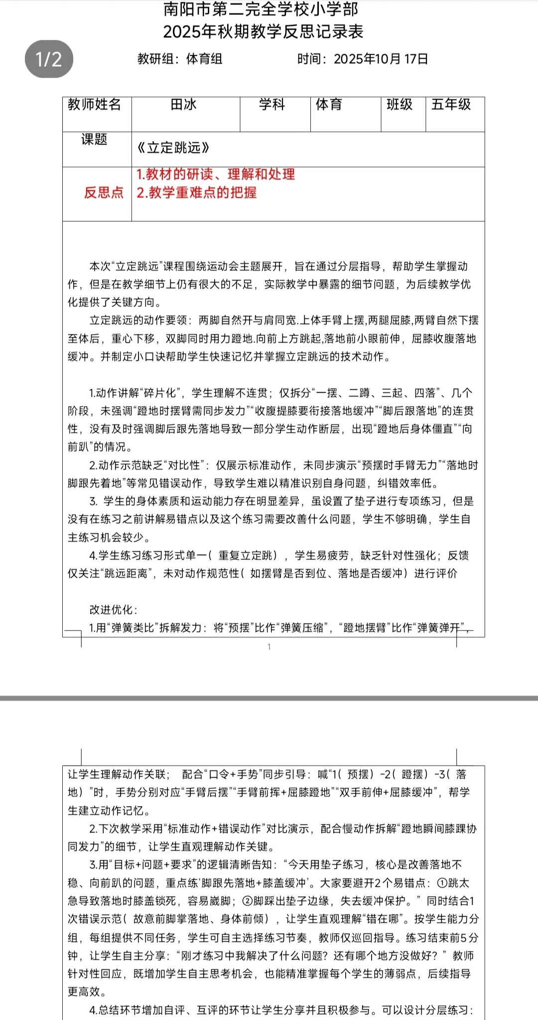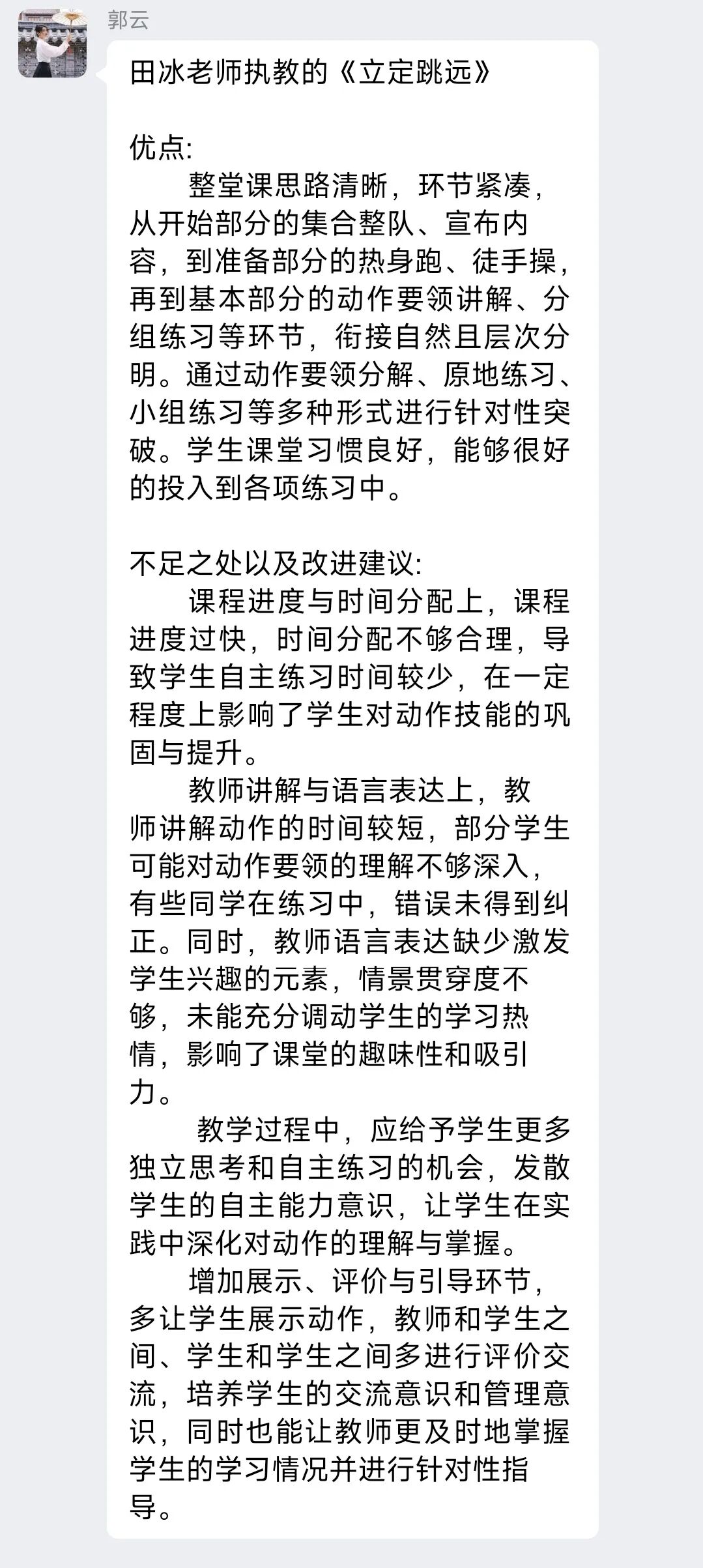 田冰老师执教的《立定跳远》一课,整堂课思路清晰,环节紧凑,从集合整队、宣布内容,到热身跑、徒手操,再到基本动作要领讲解、分组练习等环节,衔接自然且层次分明,学生很快就掌握了立定跳远的动作和技巧。