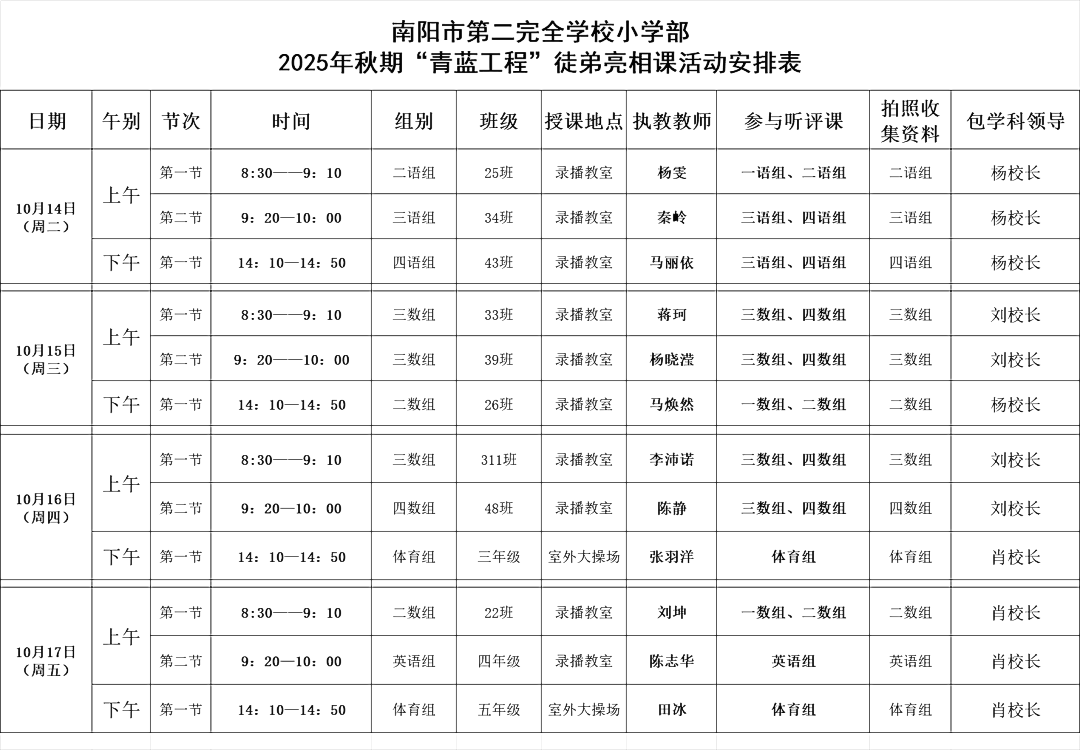 凡学百艺,莫不有师;青蓝结对,薪火相传。为更好地发挥骨干教师的传、帮、带作用,进一步促进青年教师快速成长,打造一支高素质的师资队伍,2025年10月14日至10月17日,南阳市第二完全学校小学部开展了为期一周的“青蓝工程”徒弟亮相课活动。