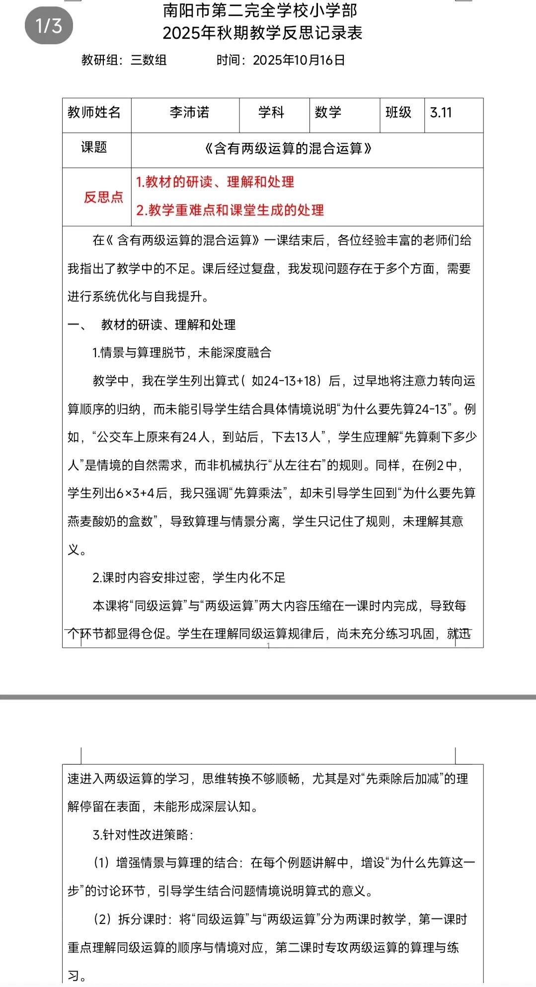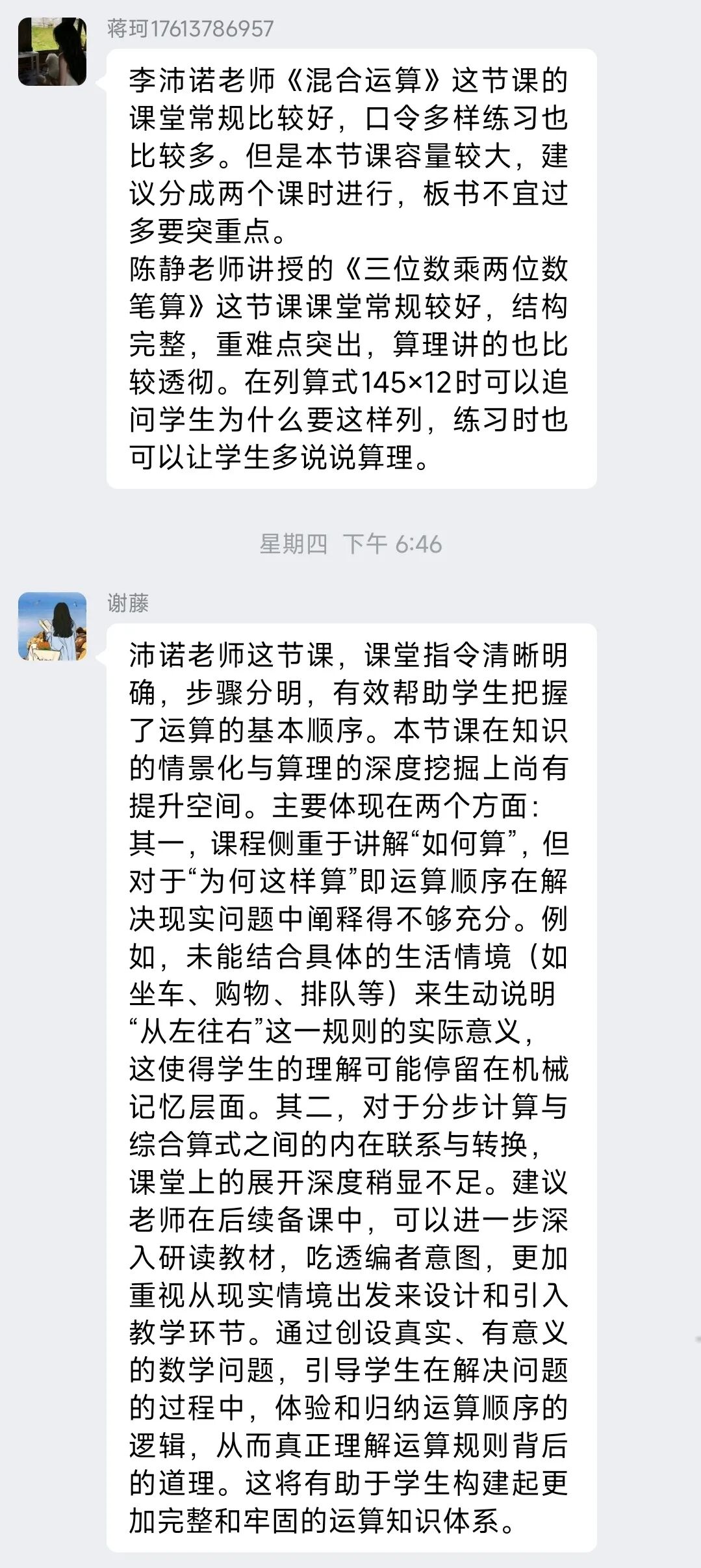 李沛诺老师执教的《混合运算》一课,课堂常规口令运用熟练,在教学时通过练习、纠错等活动,使学生牢固掌握含有两级运算的混合运算计算方法。