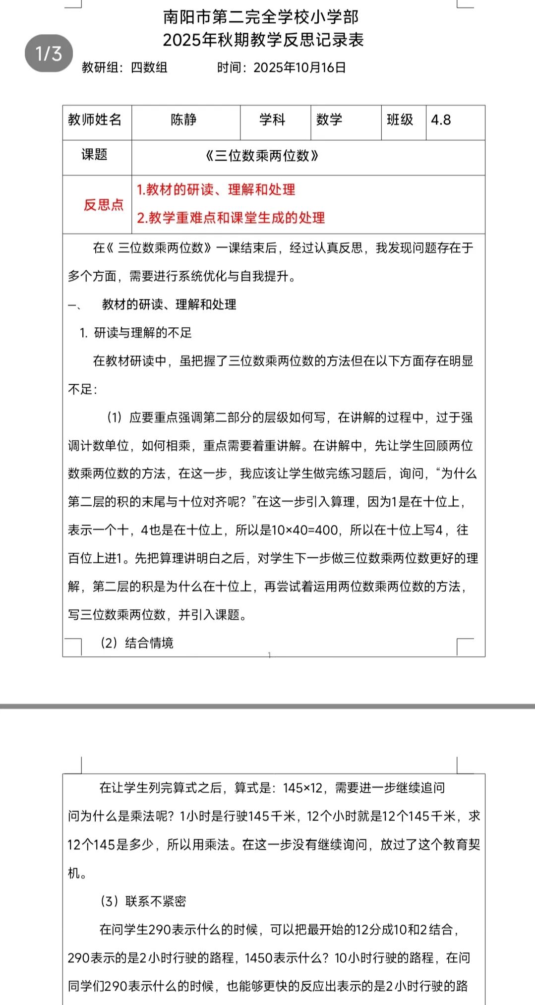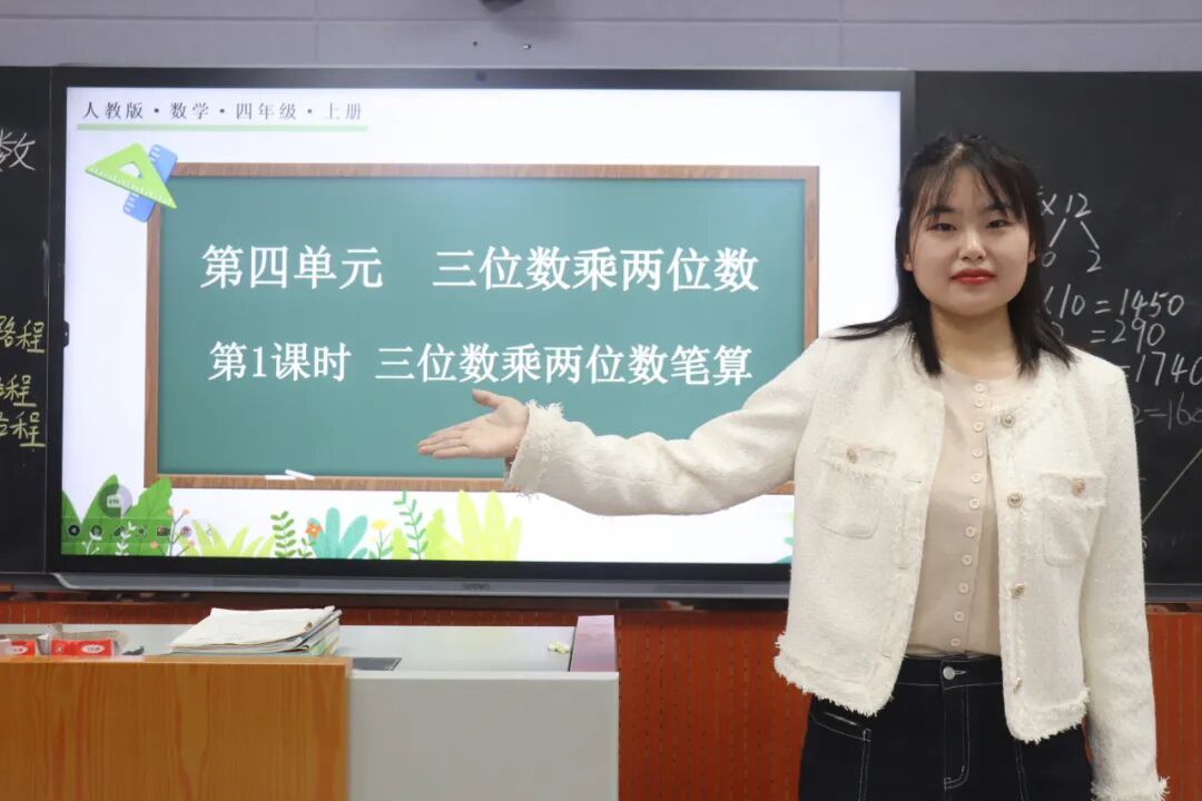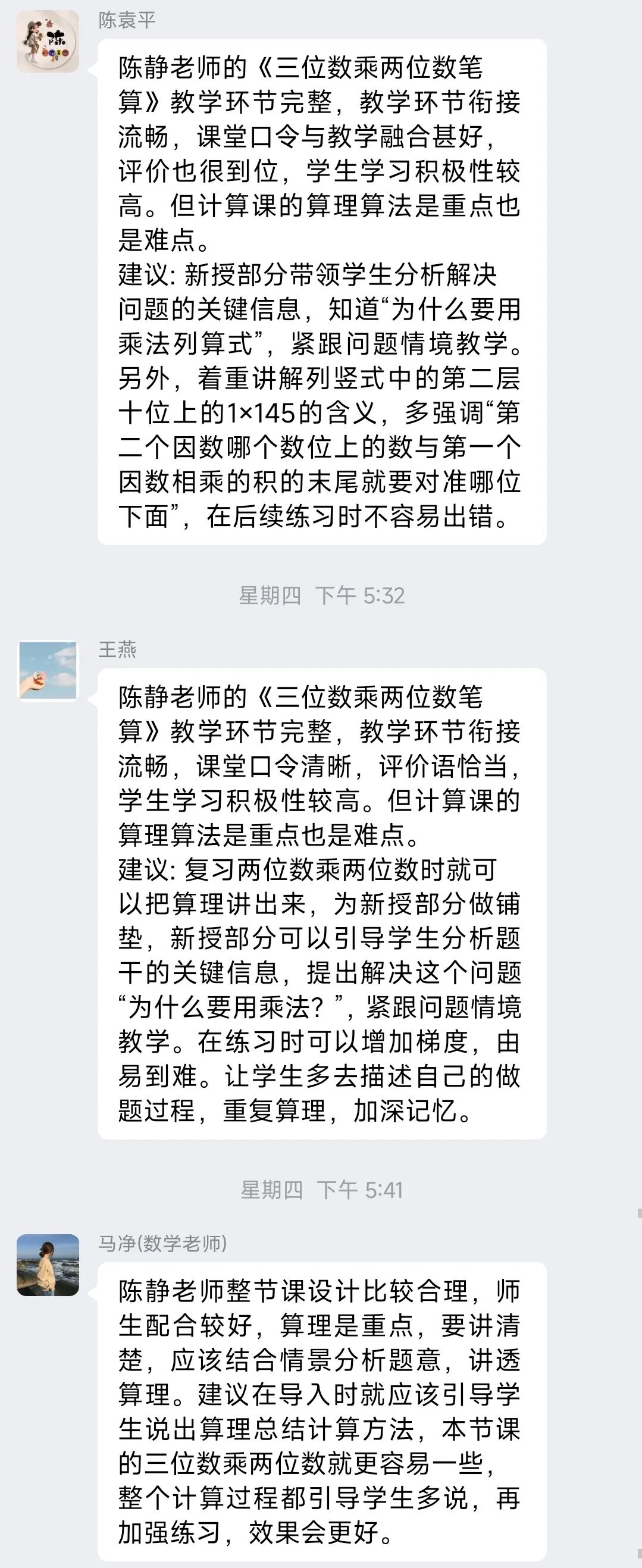 陈静老师执教的《三位数乘两位数笔算》一课,设立了两个目标,课堂教学紧扣目标,层层递进,条理清晰,训练扎实。通过一节课的学习,孩子们都熟练地掌握了三位数乘两位数笔算的技巧和方法。