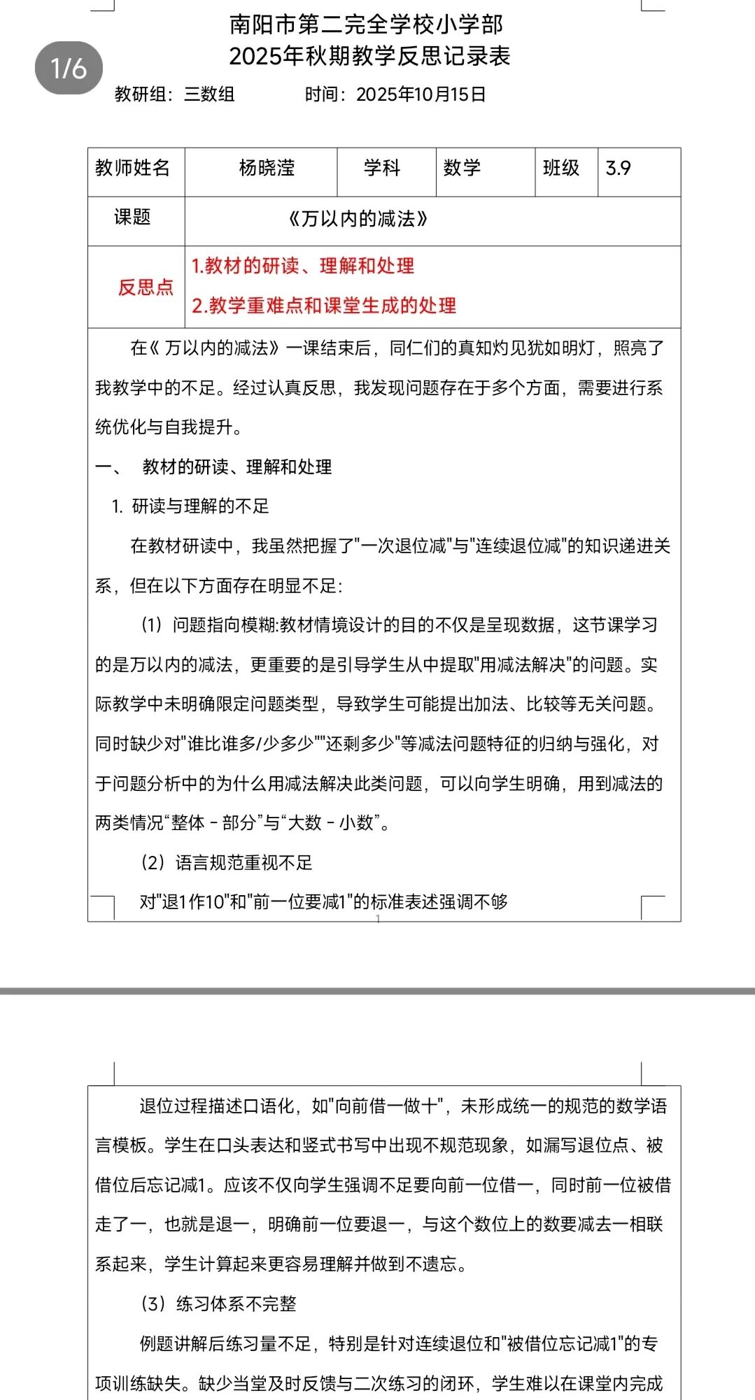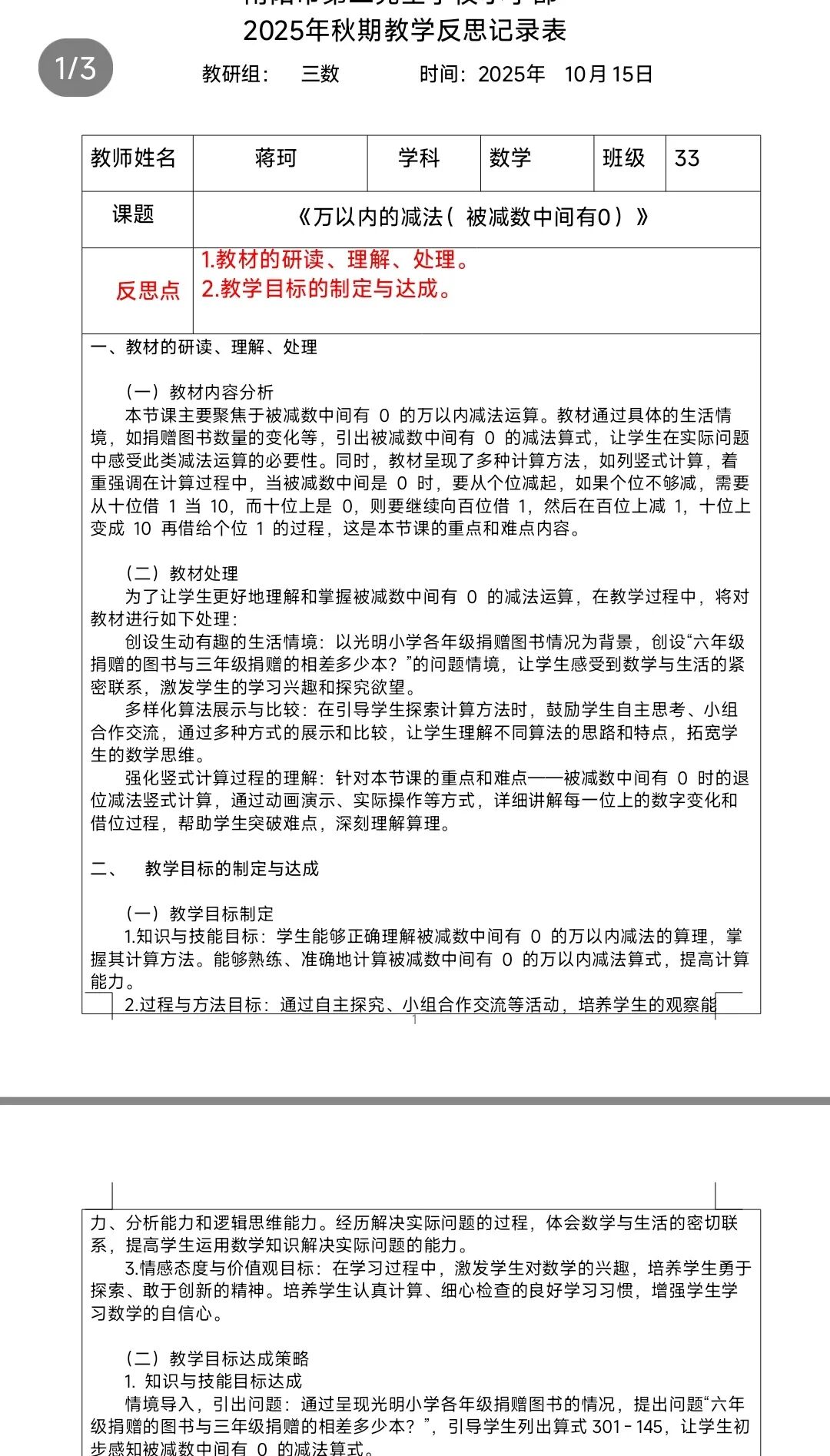 蒋珂老师执教的《万以内的减法》一课,教学结构完整,衔接流畅。用“计数器演示算理”,将抽象的“退位”过程具象化,突破了核心难点。