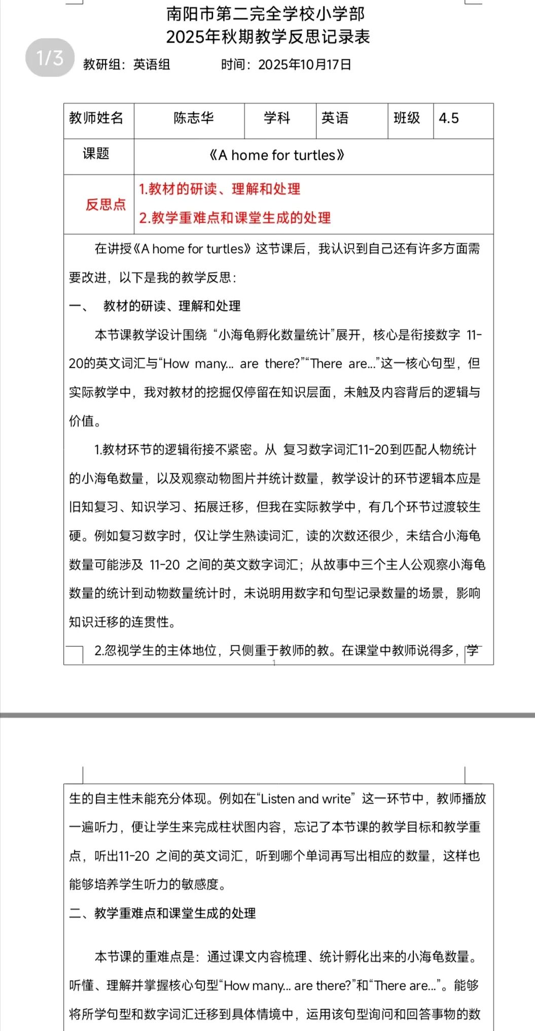 陈志华老师执教的《A home for turtles》一课,围绕 “小海龟孵化数量统计”展开,衔接数字11-20的英文词汇与“How many…are there?""There are…”这一核心句型。通过创设“数海龟”的场景、设计互动性强的课堂活动,让学生在沉浸式体验中突破语言障碍,课堂氛围活跃高效。