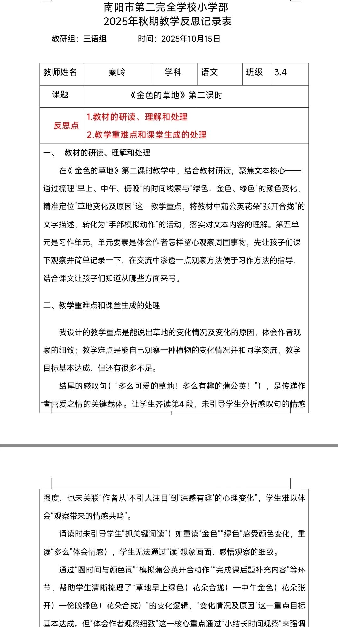 秦岭老师执教的《金色的草地》一课,教学思路清晰,语言流畅。通过梳理“早上、中午、傍晚”的时间线索与“绿色、金色、绿色”的颜色变化,精准定位“草地变化及原因”这一教学重点。