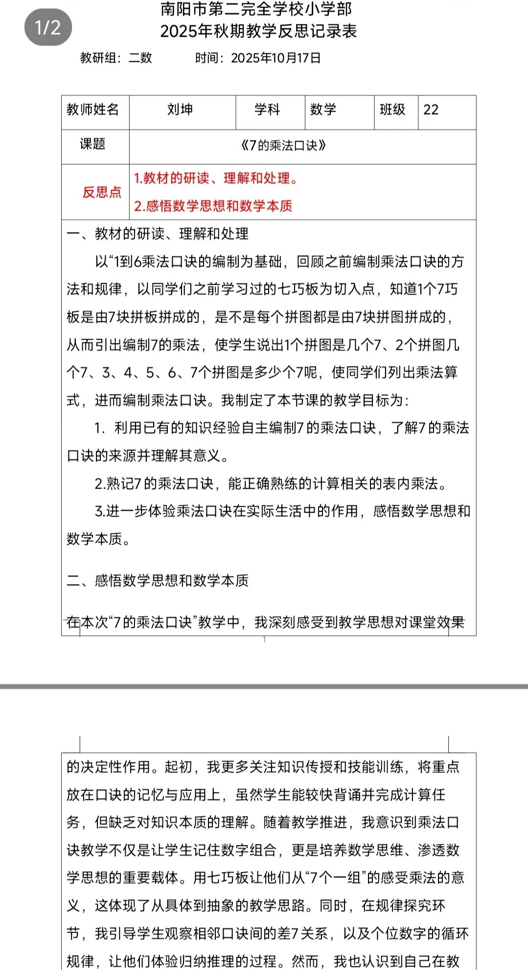 刘坤老师执教的《7的乘法口诀》一课,教学目标明确,教学思路清晰,教学设计巧妙。整节课刘老师循循善诱、因势利导、注重创设情景,将7的乘法口诀和日常生活问题紧密联系在一起。学生兴趣盎然,取得了极好的教学效果。