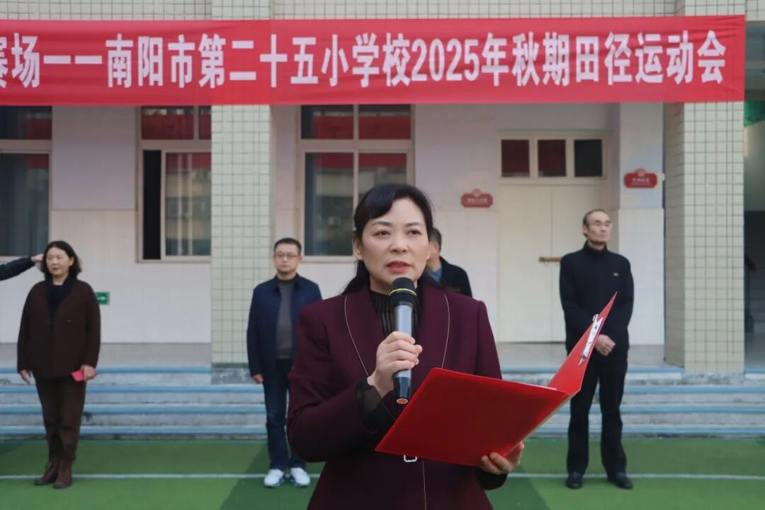 南阳市第二十五小学校党支部书记、校长勇梅首先向运动会的举办表示热烈祝贺,向精心筹备运动会的全体工作人员致以诚挚感谢,向即将踏上赛场的运动员们送上殷切期许。勇校长强调,体育是力量的角逐,是智慧的较量,更是精神的展现,希望同学们在赛场上勇于挑战自我、超越自我、遵守规则,在运动中收获快乐、锤炼意志、增进友谊。