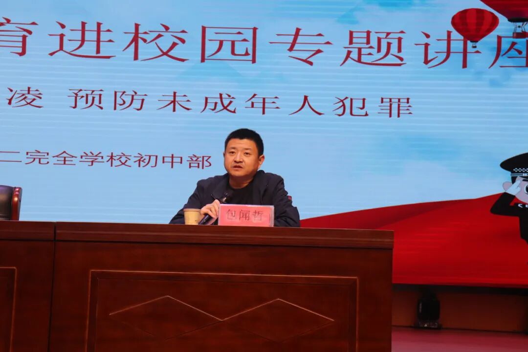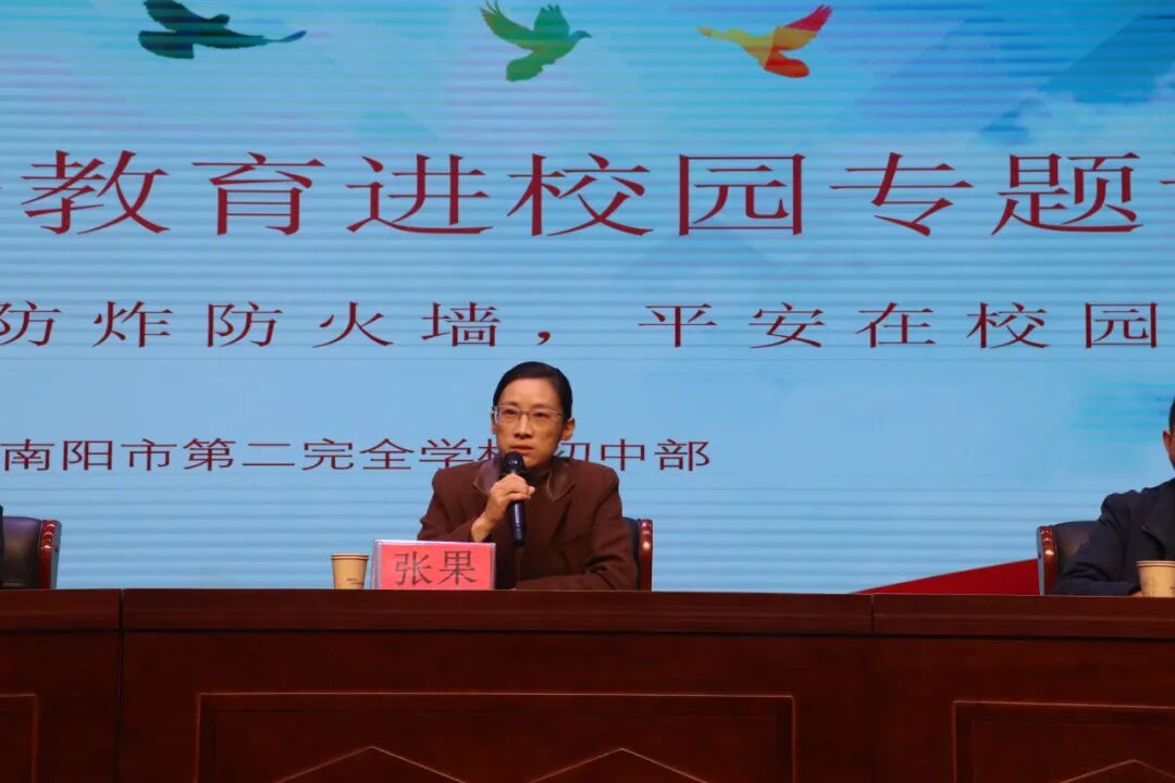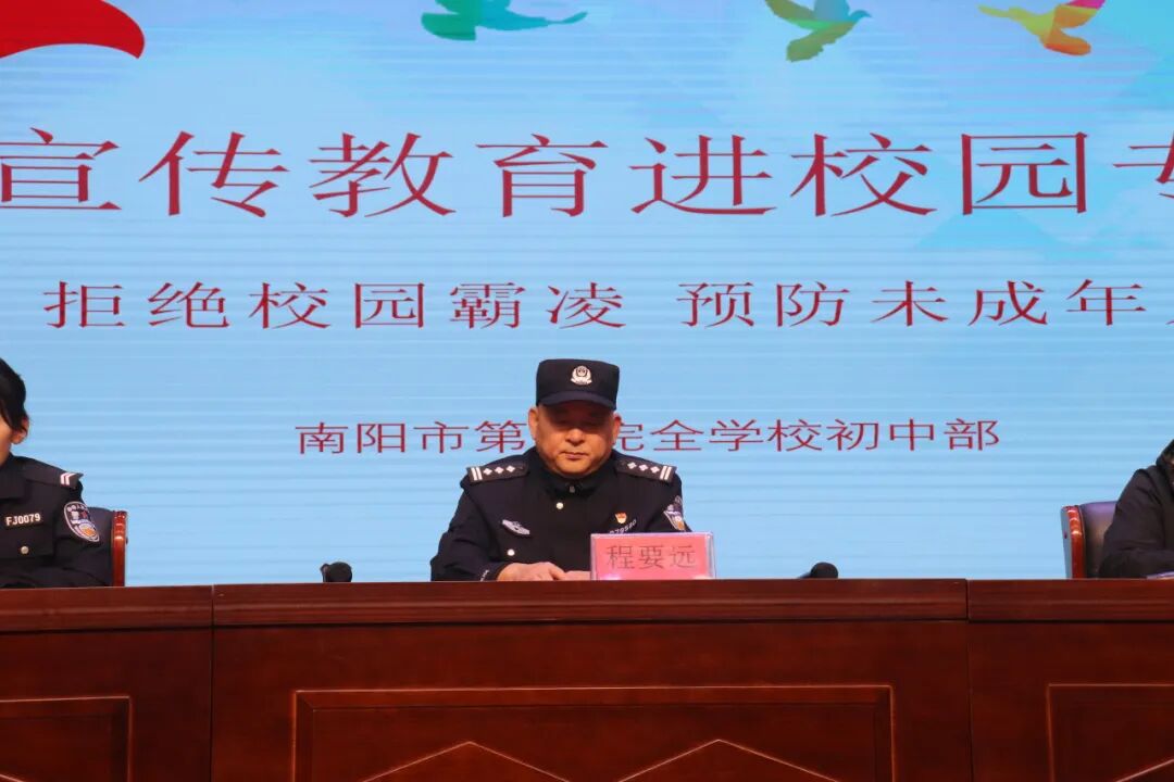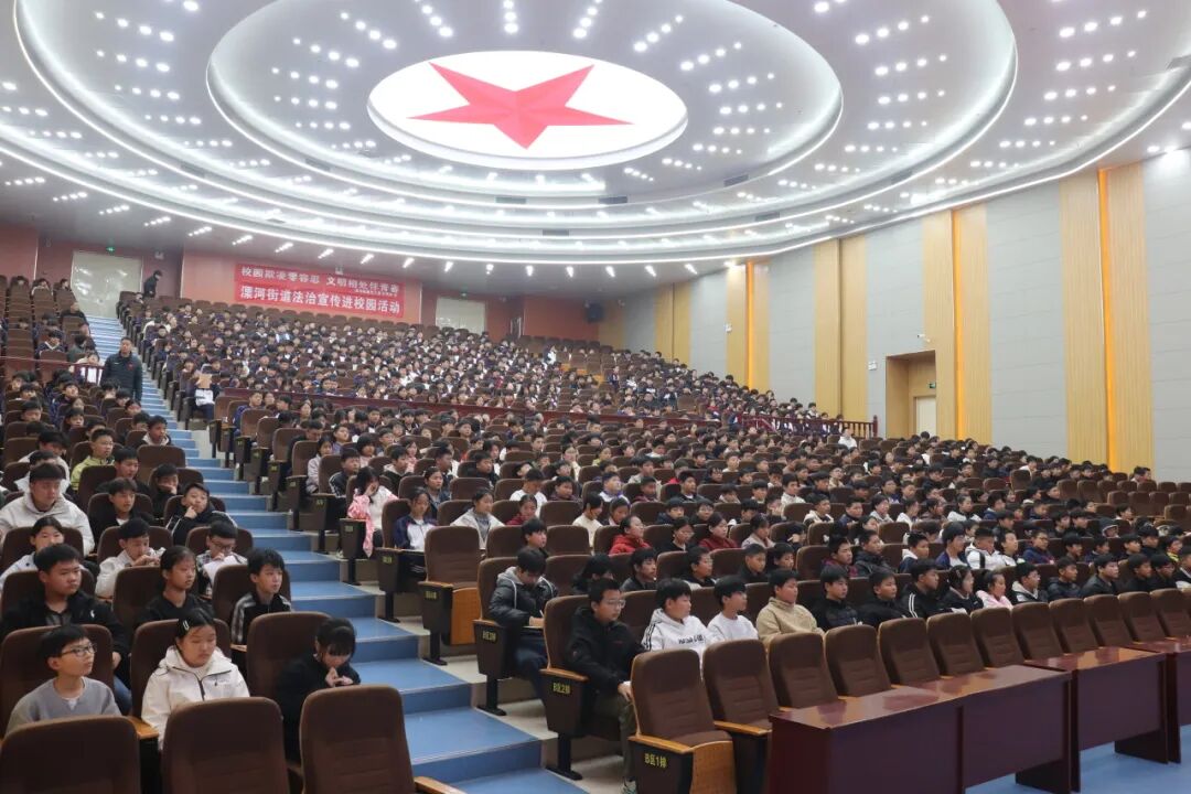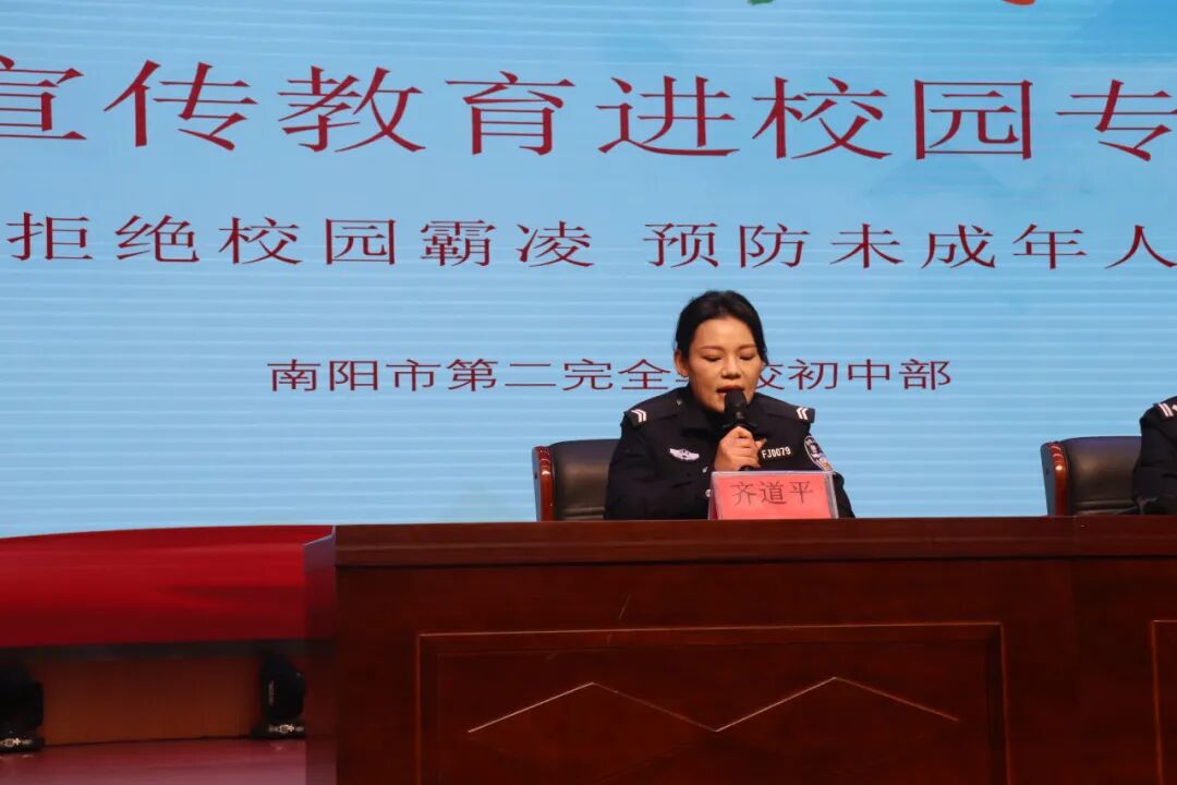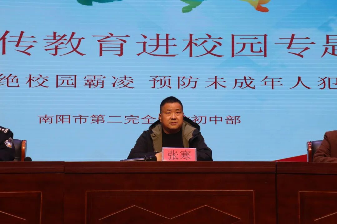 为筑牢校园安全防线,营造和谐、友善的学习环境,2025年11月13日,溧河街道综治办主任张寒、溧河司法所所长张果、溧河派出所民警程要远、齐道平、河南两相律师事务所包闻哲律师来到南阳市第二完全学校初中部,为全体师生带来一场主题为“校园欺凌零容忍 文明相处伴青春”的法治专题讲座。