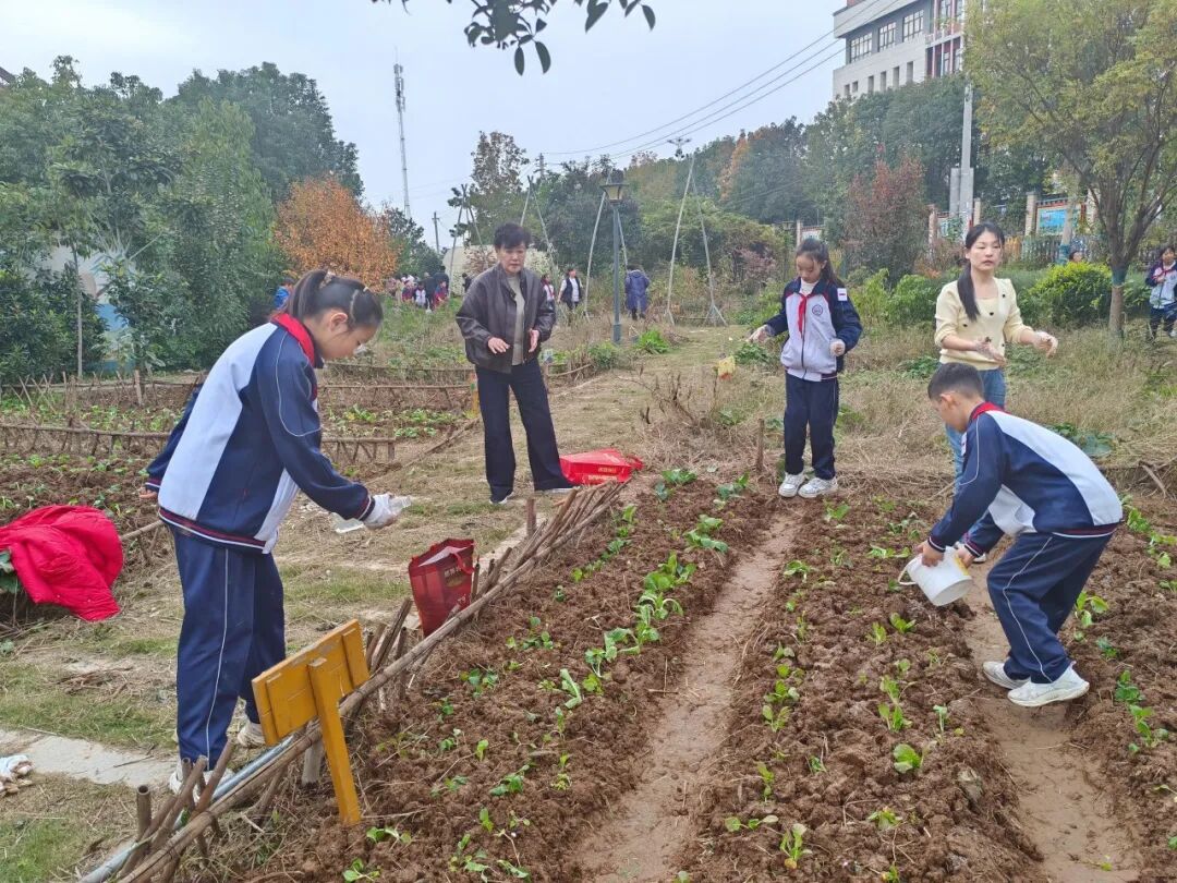 土地准备好后,便是播撒希望的时刻。孩子们小心翼翼地捧起秋日的菜苗。他们专注地挖坑、播种、栽苗、覆土、浇水,每一个步骤都做得一丝不苟。一双双小手,种下的不仅是一棵小苗,更是对成长、对收获的一份美好期盼。