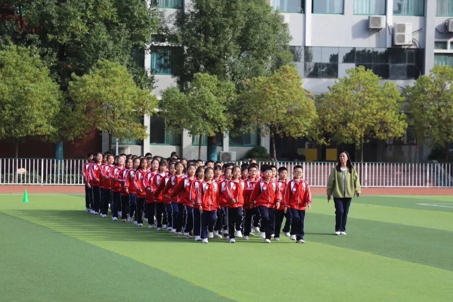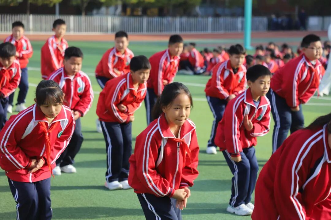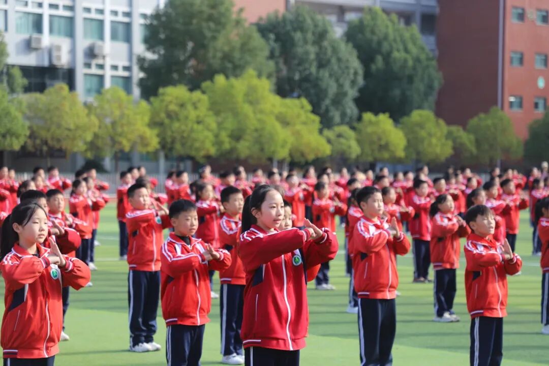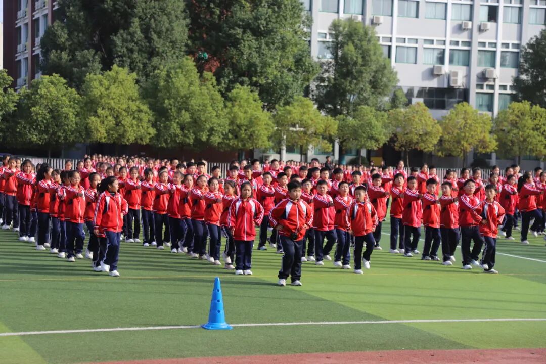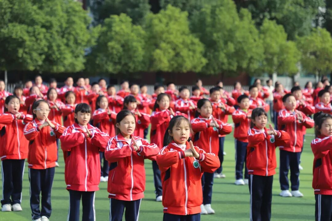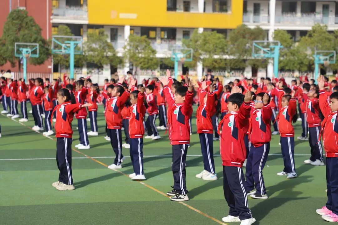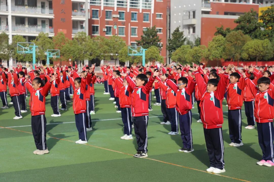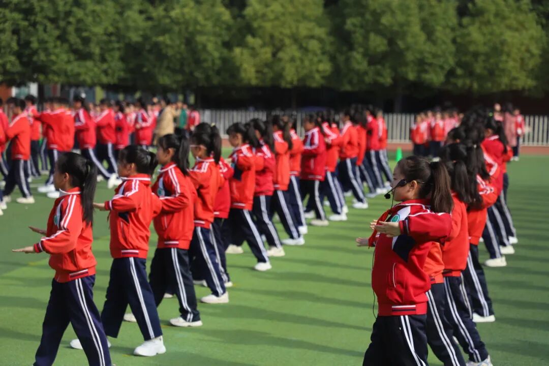 昂扬的旋律回荡在校园,一张张笑脸洋溢着童年的欢乐与活力。他们伸展、跳跃、旋转、拍手……动作到位,整齐划一,热情奔放,张弛有度,舒展优美,举手投足间体现了运动的力与美,如同一幅幅流动的画卷,展现着孩子们积极向上的精神风貌。