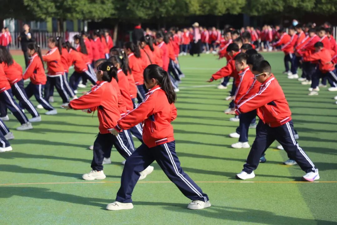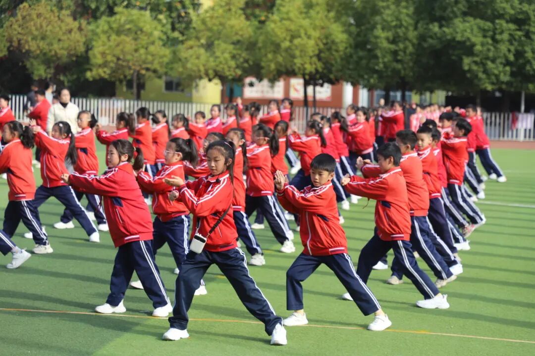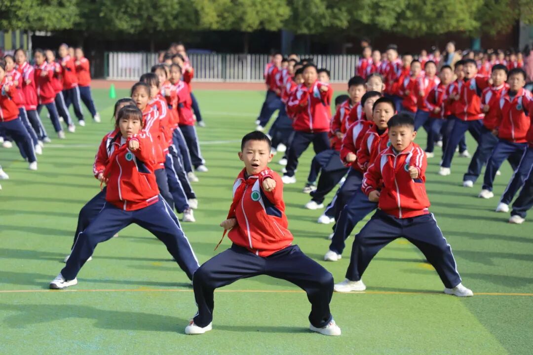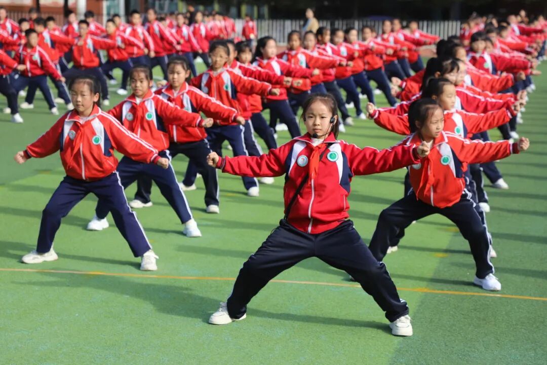 孩子们的脸上洋溢着自信的笑容,他们的眼神明亮又坚定,用整齐划一的动作、刚劲有力的姿态,生动诠释了“台上一分钟,台下十年功”的深刻内涵。当武术操最后一个招式利落收势,整个操场爆发出雷鸣般的掌声。