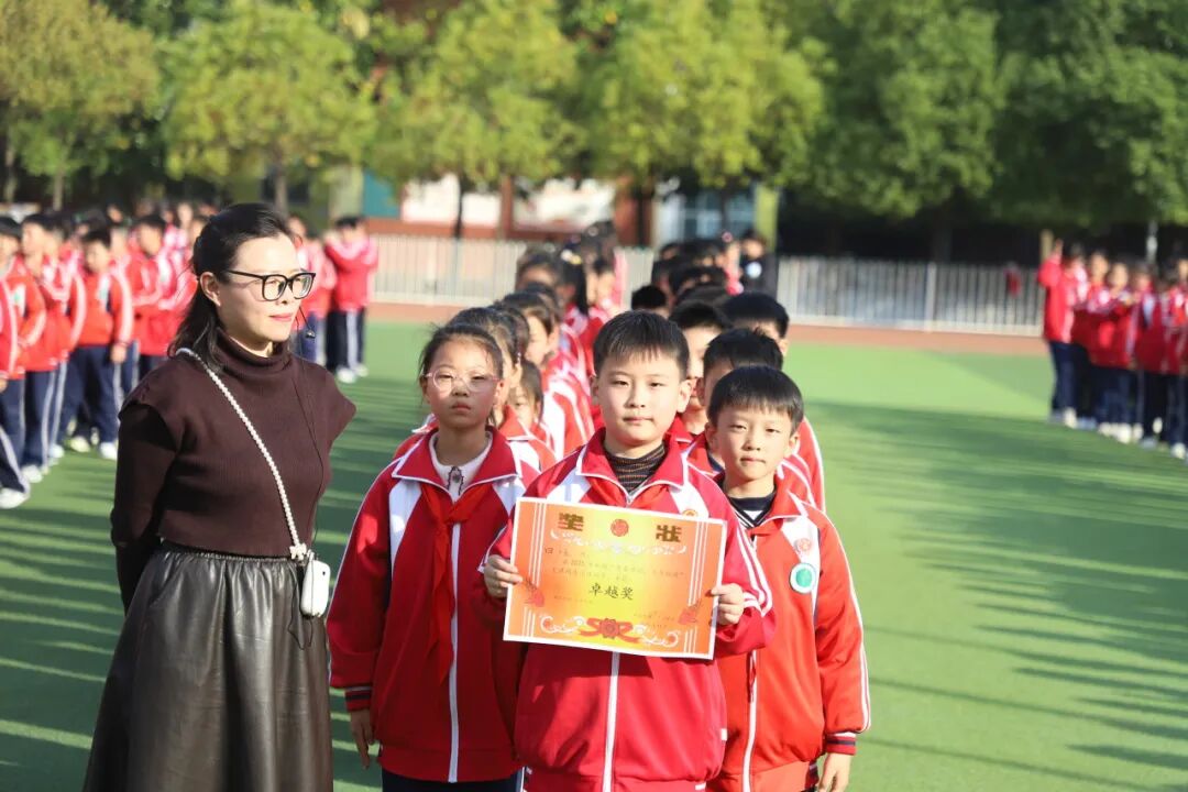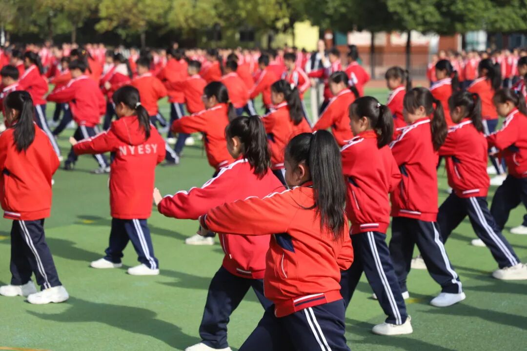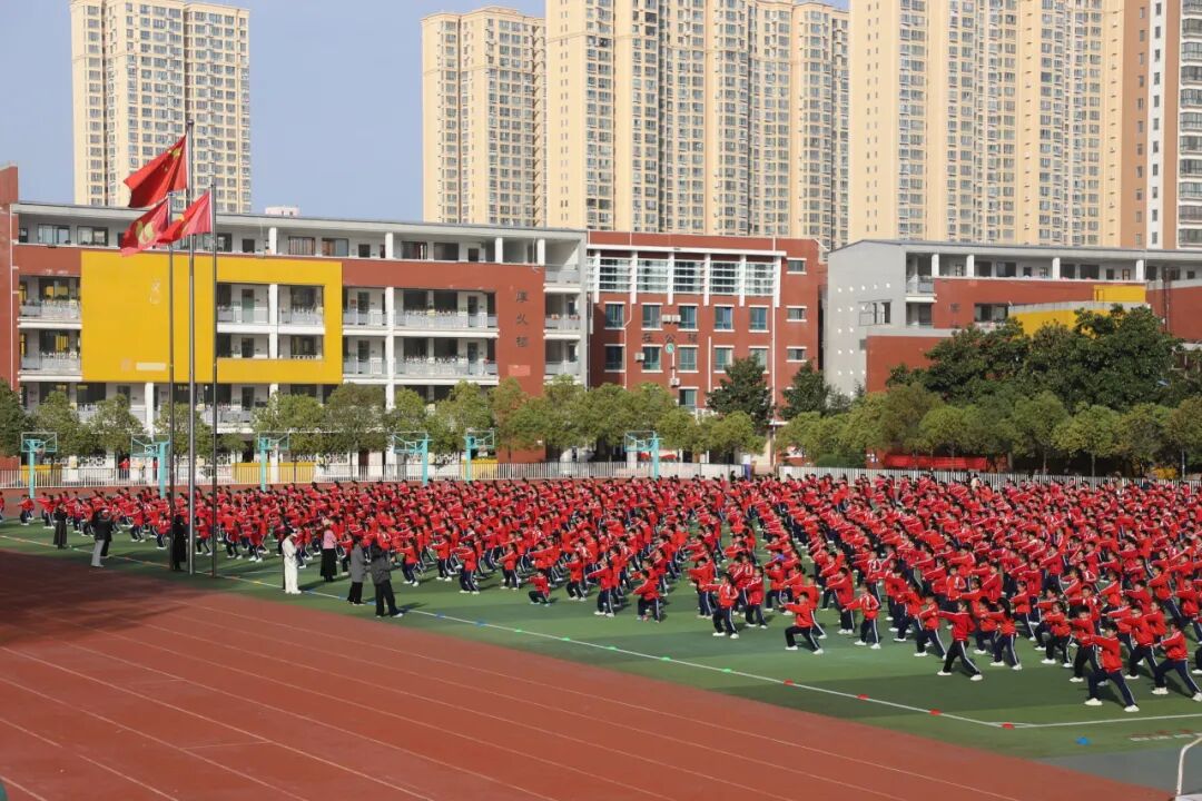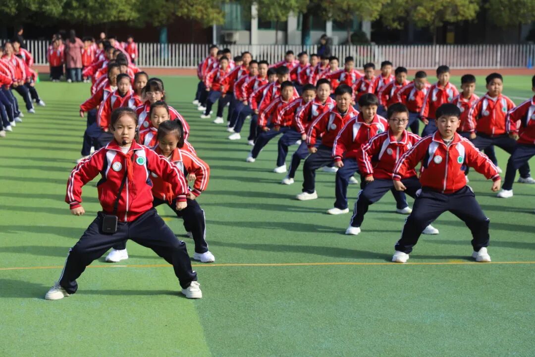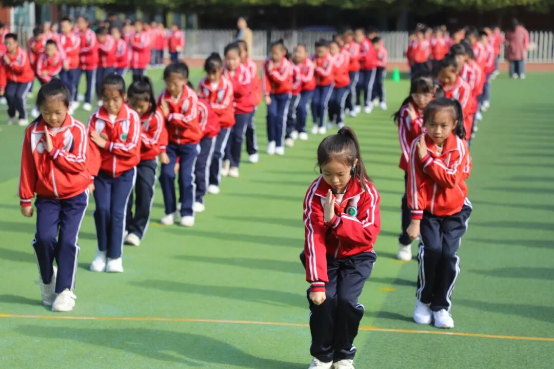 孩子们的脸上洋溢着自信的笑容,他们的眼神明亮又坚定,用整齐划一的动作、刚劲有力的姿态,生动诠释了“台上一分钟,台下十年功”的深刻内涵。当武术操最后一个招式利落收势,整个操场爆发出雷鸣般的掌声。