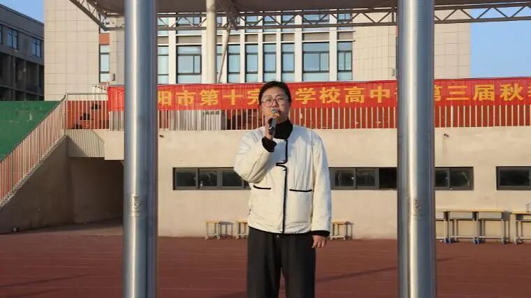 在庄严的国歌声中,开幕式正式拉开帷幕,五星红旗冉冉升起,全体师生肃立注目。南阳市第十完全学校高中部副校长武捷在致辞中表示,学校始终坚守“健康第一”的教育理念,践行“无运动不十全,无运动不青春”的体育宗旨,将体育融入“三力”德育体系,本次运动会既是对学校体育教学成果的集中检阅,更是培养学子奋发向上意志与顽强拼搏精神的重要平台。她寄语全体运动员,要在赛场上恪守规则、尊重对手,以“友谊第一,比赛第二”为准则,赛出风格、赛出水平,在运动中锤炼意志、收获成长。