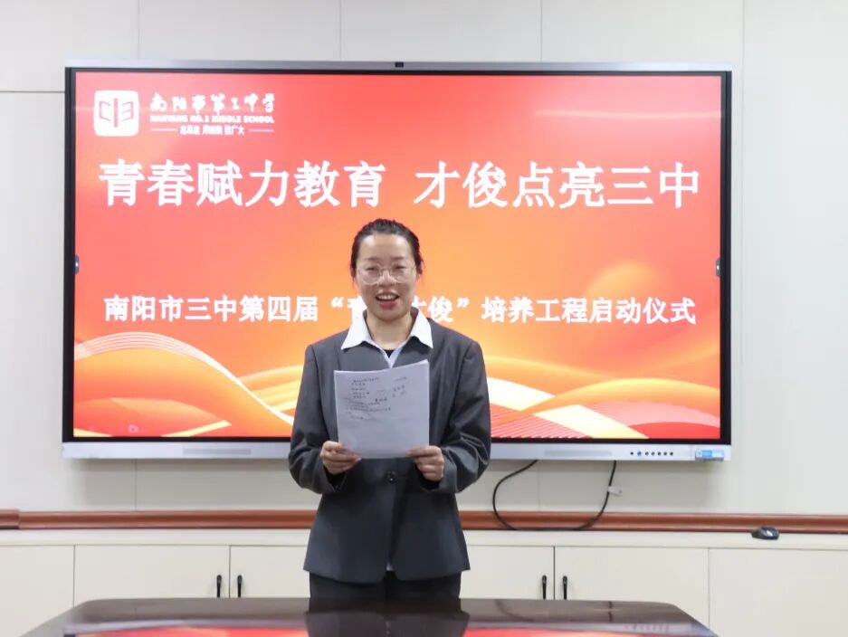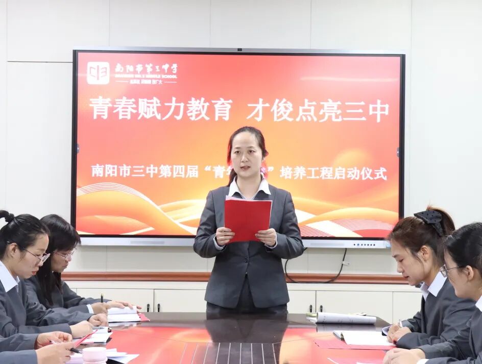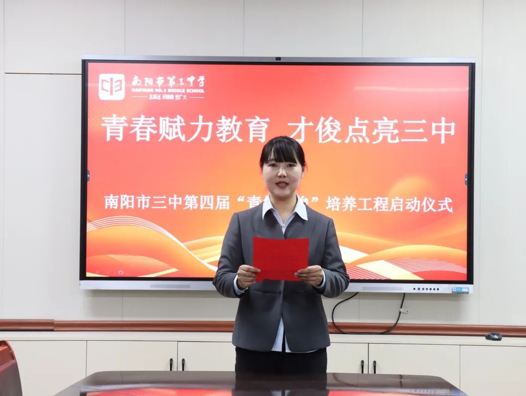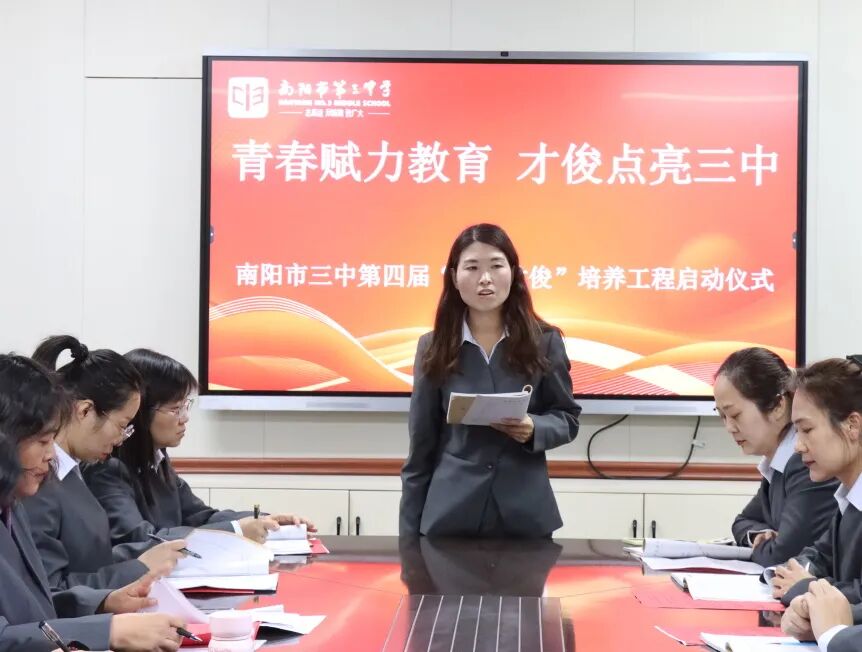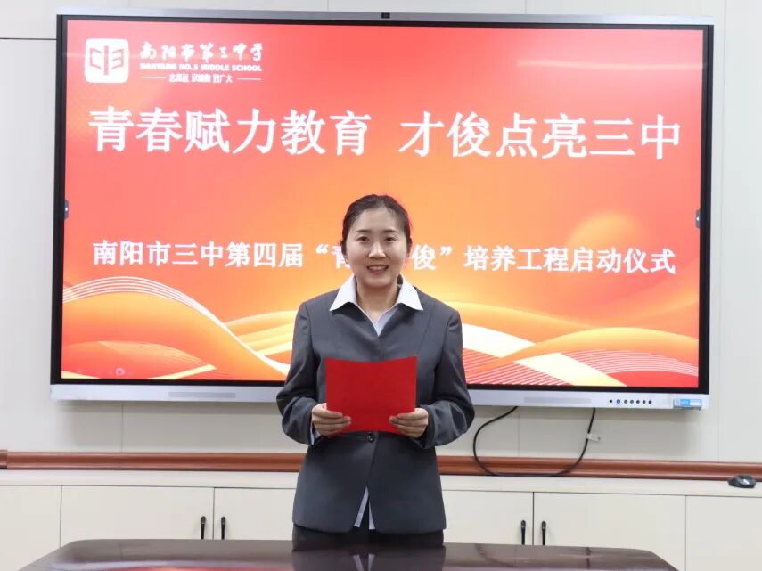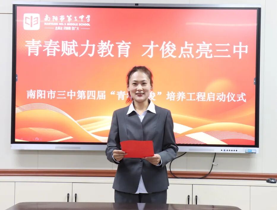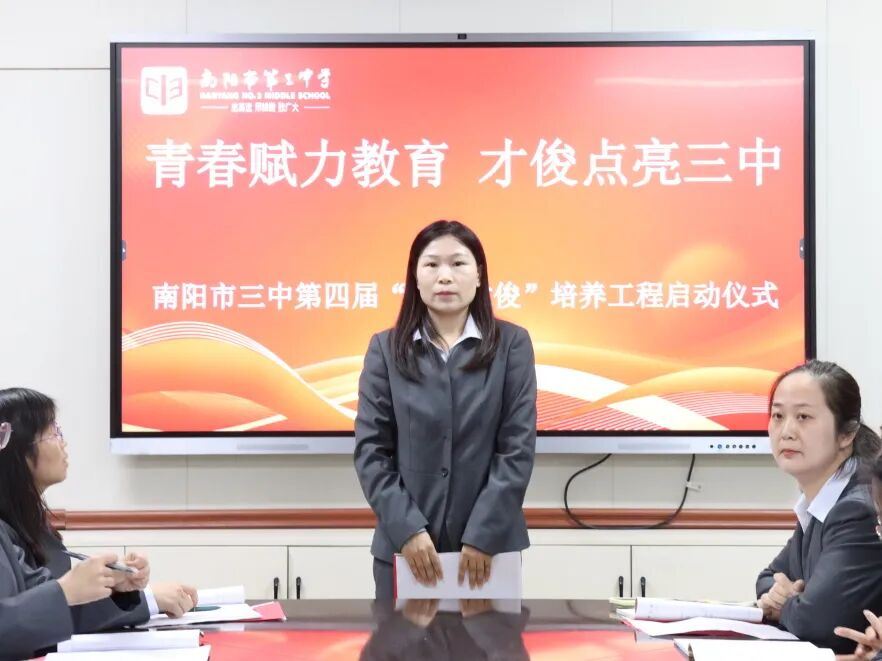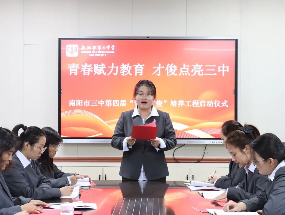 青春逢盛世,奋斗正当时。为夯实教师队伍建设根基,激活青年教师成长活力,助力青年教师快速成长为教学骨干与育人先锋。2025年11月28日下午,南阳市第三中学隆重举行了“青春赋力教育 才俊点亮三中”第四届“青年才俊”培养工程启动仪式。学校领导与20位青年教师齐聚于此,共赴使命,为学校教育高质量发展注入蓬勃动能。南阳市三中校长刘俊峰、副校长白中岐、副校长刁春瑜、年级主任曾国燕出席此次活动,由科训室主任康清主持。
