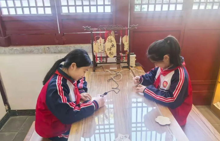 在烙画体验区,同学们手持烙铁,在木板上精心勾勒出武侯祠的标志性建筑与诸葛亮的人物剪影。高温下,木板上逐渐形成独特的焦痕艺术纹路,每一笔都饱含着同学们对传统文化的深厚情感。恰似阳光赋予万物生机,同学们的创造力在实践中得到了充分释放。整个实践过程中,大家相互帮助、共同钻研,现场洋溢着浓厚的学习氛围。
