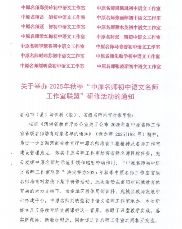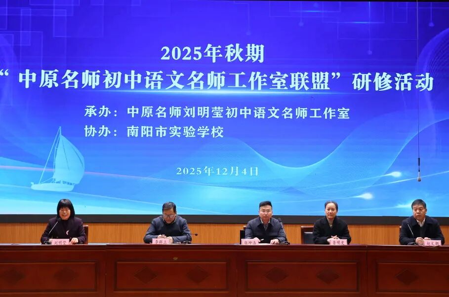 龙岗苍苍蕴文脉,南都帝乡迎宾来。为深入贯彻《河南省教育厅办公室关于公布 2025 年度中原名师工作室省级名师培育对象名单的通知》(教办师 [2025] 182 号)精神,扎实落实省级名师培育目标,充分发挥中原名师的引领辐射带动作用,2025 年 12 月 4 日至 5 日,中原名师初中语文工作室联盟秋季研修活动于南阳市实验学校圆满举办。