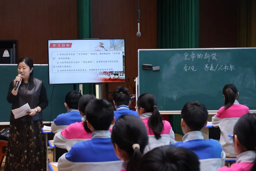 张媛老师的《皇帝的新装》教学,巧设阶梯式学习活动,实现了童话文本的深度挖掘。她从人物 “言不由衷” 的言行切入,引导学生剖析群体沉默的根源;通过角色代入探究与 AI 对话启示,深化学生对人性弱点的认知;再以孩童角色解读锚定作品的精神内核。整堂课兼顾文本解读、思辨训练与价值引领,课后的辩论赛与立场写作设计,更打通了课堂与现实的壁垒,让童话教学兼具趣味性与育人深度。