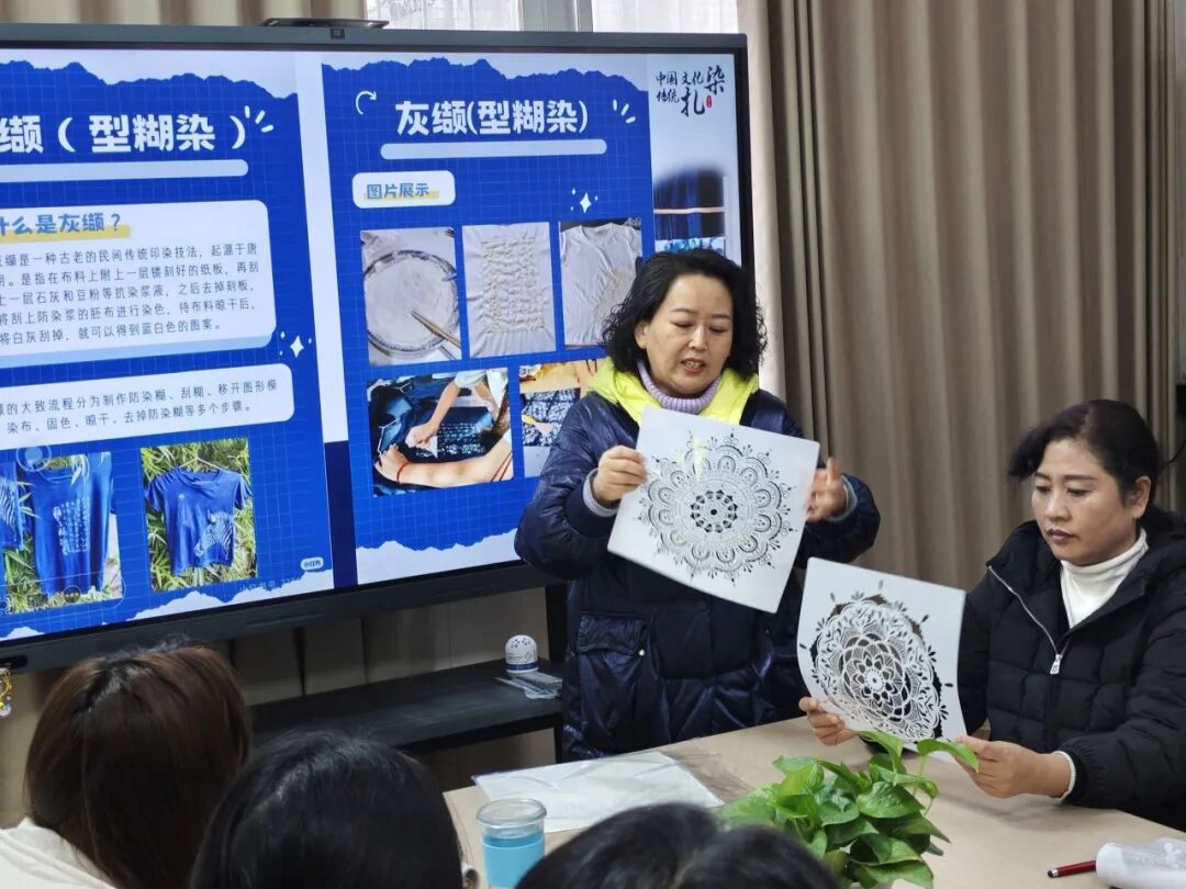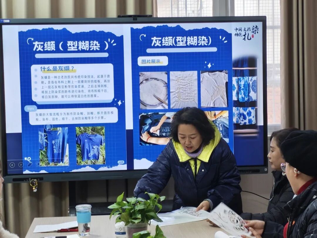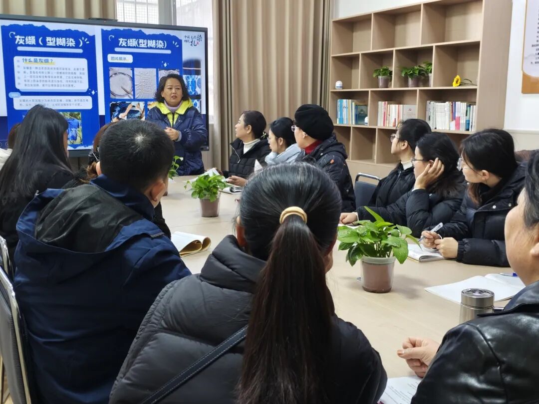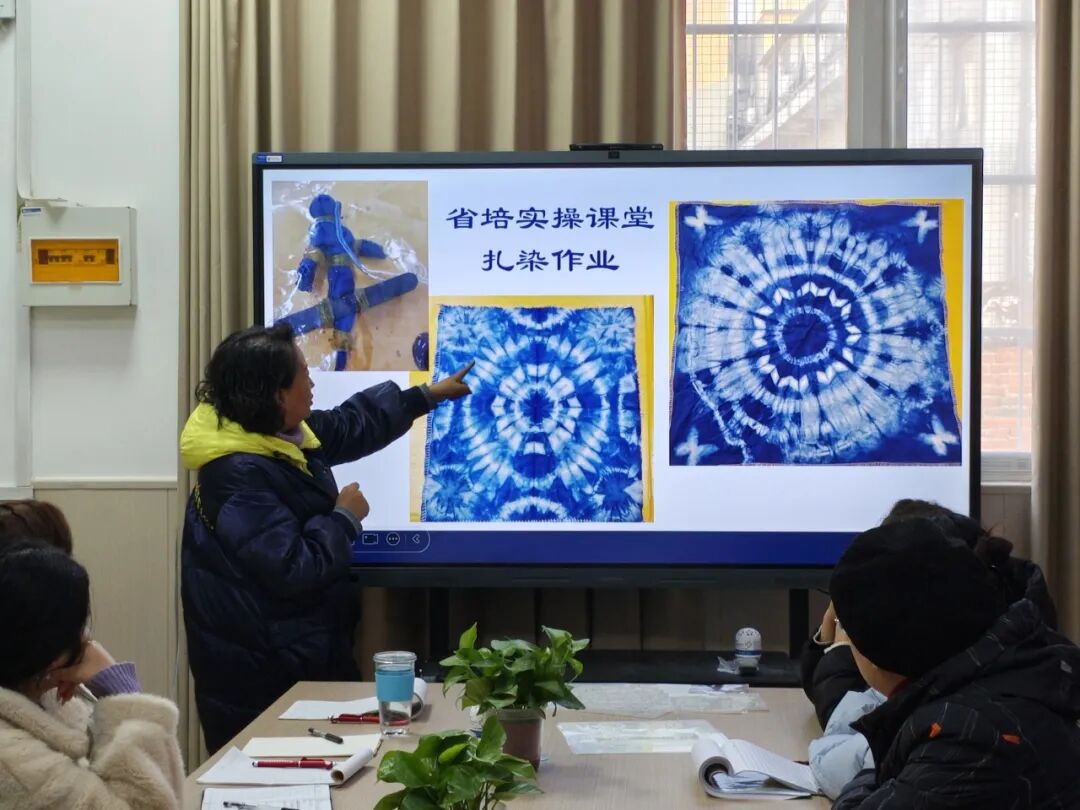 此次二次培训依托两位教师的高级别研修成果。以“成果转化+实操赋能”为核心,构建沉浸式美育学习场景。首先分享的是李静主任,她作为 2025 年河南省义务教育师资薄弱环节改善暨中小学教师素质提升工程省级骨干教师培育项目(小学美术)优秀学员及 “优秀组织工作者”,将省级培训中的非遗蓝染技能带回校园,赋能同伴。分享中,李静主任从美育视角详细解读蓝染文化核心内涵,介绍蓼蓝、菘蓝等天然染料来源,以及绞缬、蜡缬、灰缬(型糊染)等传统技法的历史传承与现代创新应用,重点分享了灰缬工艺的实用技巧要点,从防染糊涂抹、模板设计与固定技巧到刮糊力度把控、纹样呈现等环节开展细致拆解,让在场教师直观感受蓝印花布的独特美学与手工魅力。分享会后,李主任带领全体音美教师现场体验灰缬工艺,针对每一步技法要点耐心示范、精准指导,助力教师在亲手创作中深度体悟非遗技艺的精妙与传承价值。
