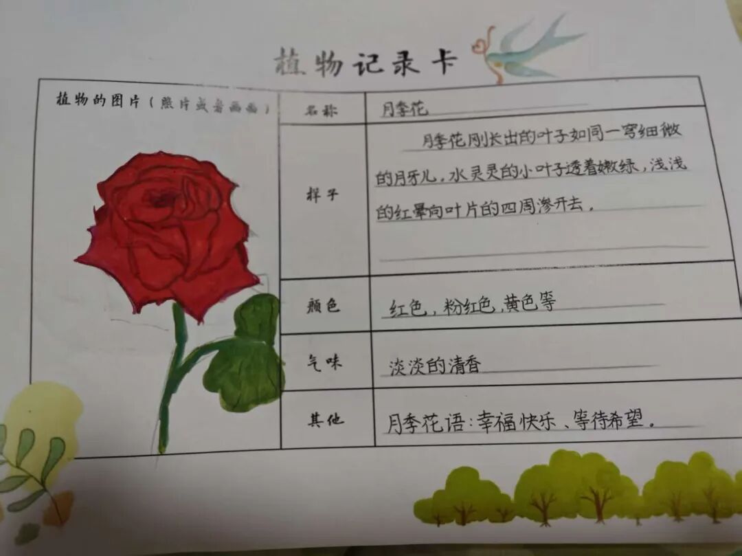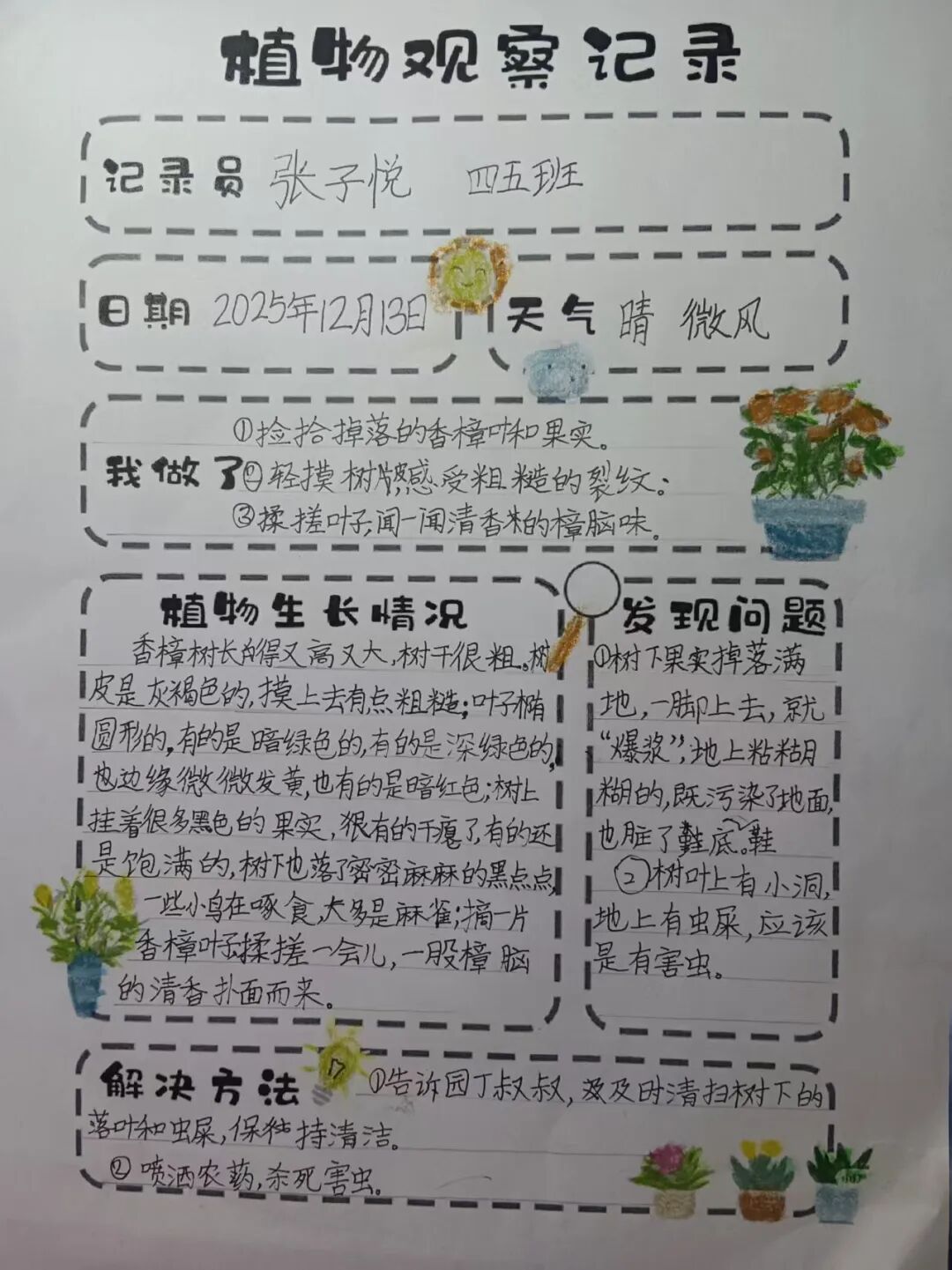 选定心仪树木,孩子们化身 “小小法布尔”,他们以多元感官对话自然,触摸树皮的粗糙纹理与细腻肌理,端详叶片的轮廓形态、叶脉纹路与边缘弧度,细嗅花朵的馥郁芬芳与果实的天然气息,辨析叶片正反面的色彩差异。分工协作间,一份份《树木观察记录表》新鲜出炉,文字描述精准生动,手绘插图形神兼备,银杏的扇形叶、鸡爪槭的红韵、桂花的四瓣花,都在孩子们的笔下焕发灵动生机。活动全程恪守 “只观察不破坏” 的准则,以敬畏之心守护草木的完整与生机。