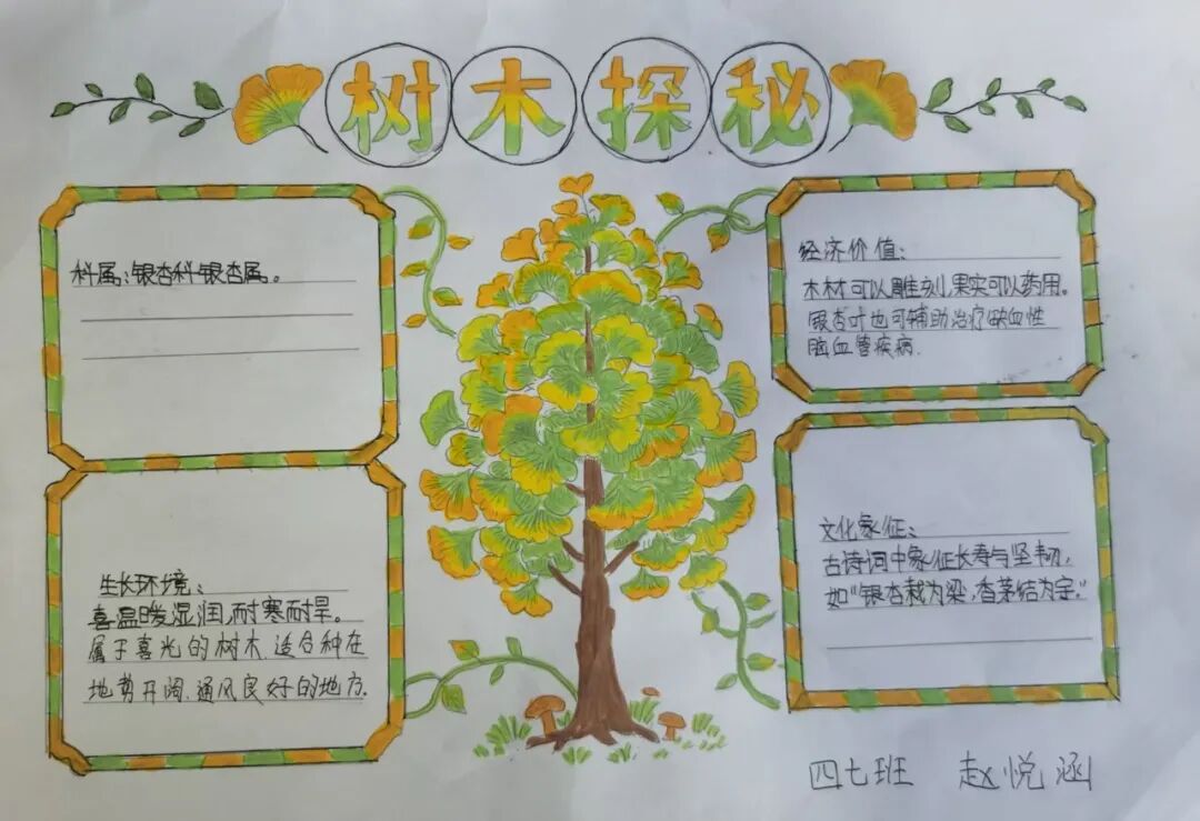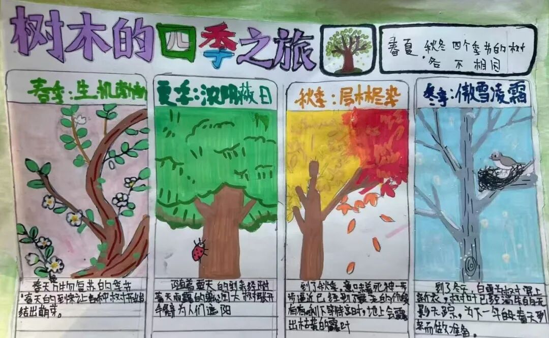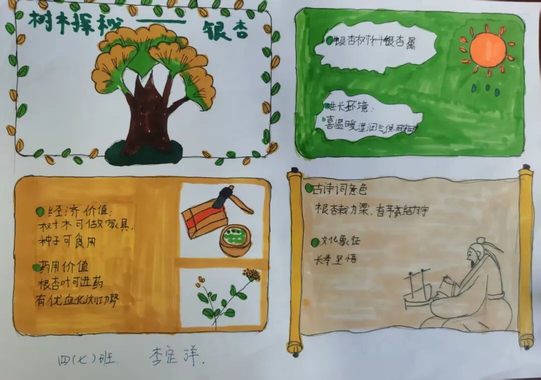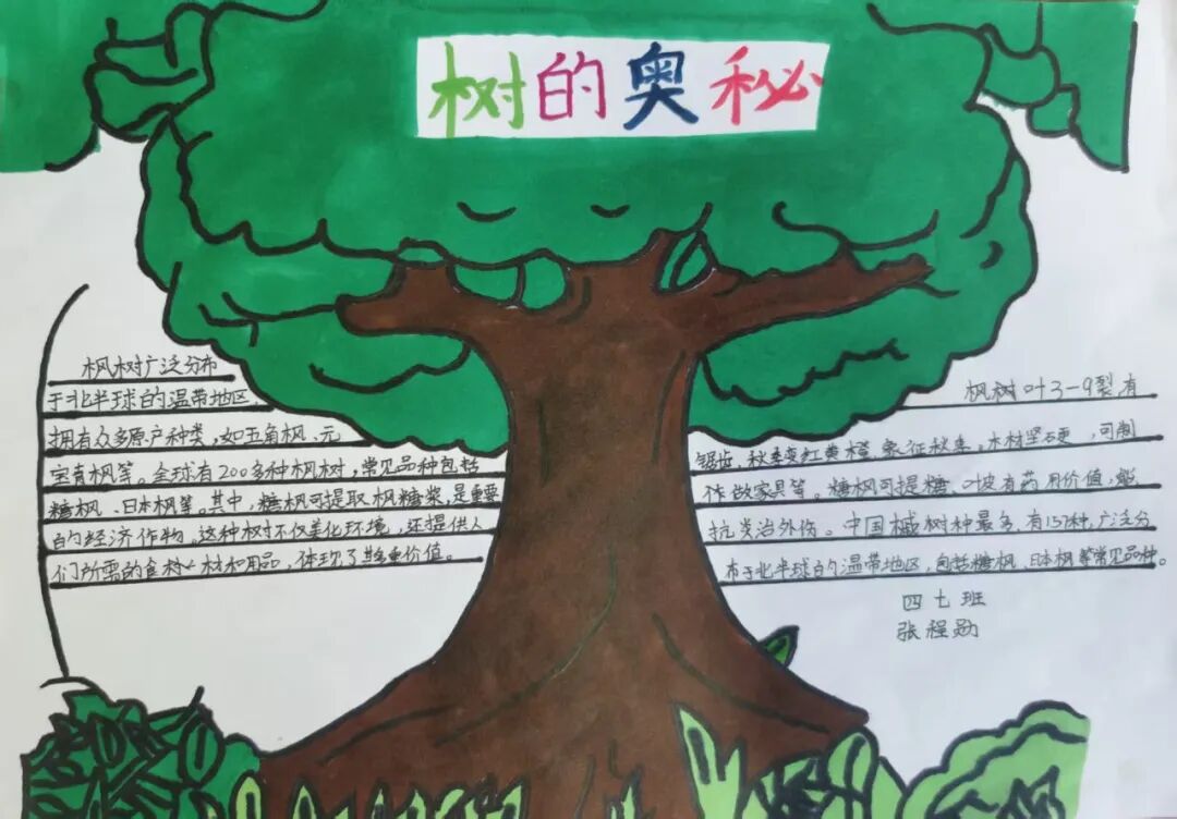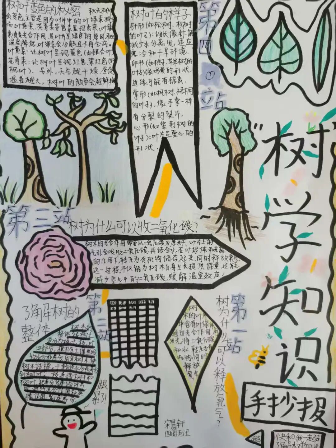 从直观感知到系统探究,孩子们开启了树木知识的深度学习。他们翻阅科普典籍,溯源树木的科属分类与生长习性;遨游网络世界,探寻树木的经济价值、药用功效与生态功用。小组合作筛选整合多元资料,精心打造 “树木探秘” 主题手抄报。版面设计兼具科学性与艺术性,图文相映、疏密有致,文字工整隽秀,插图意境悠远,每一份手抄报都是知识与创意的完美融合。