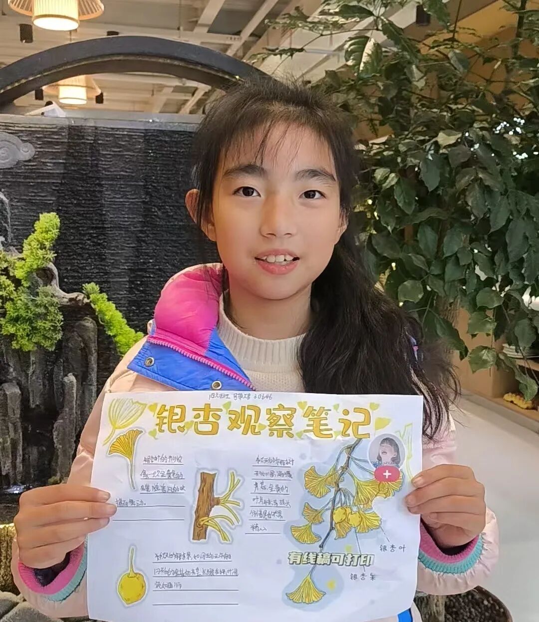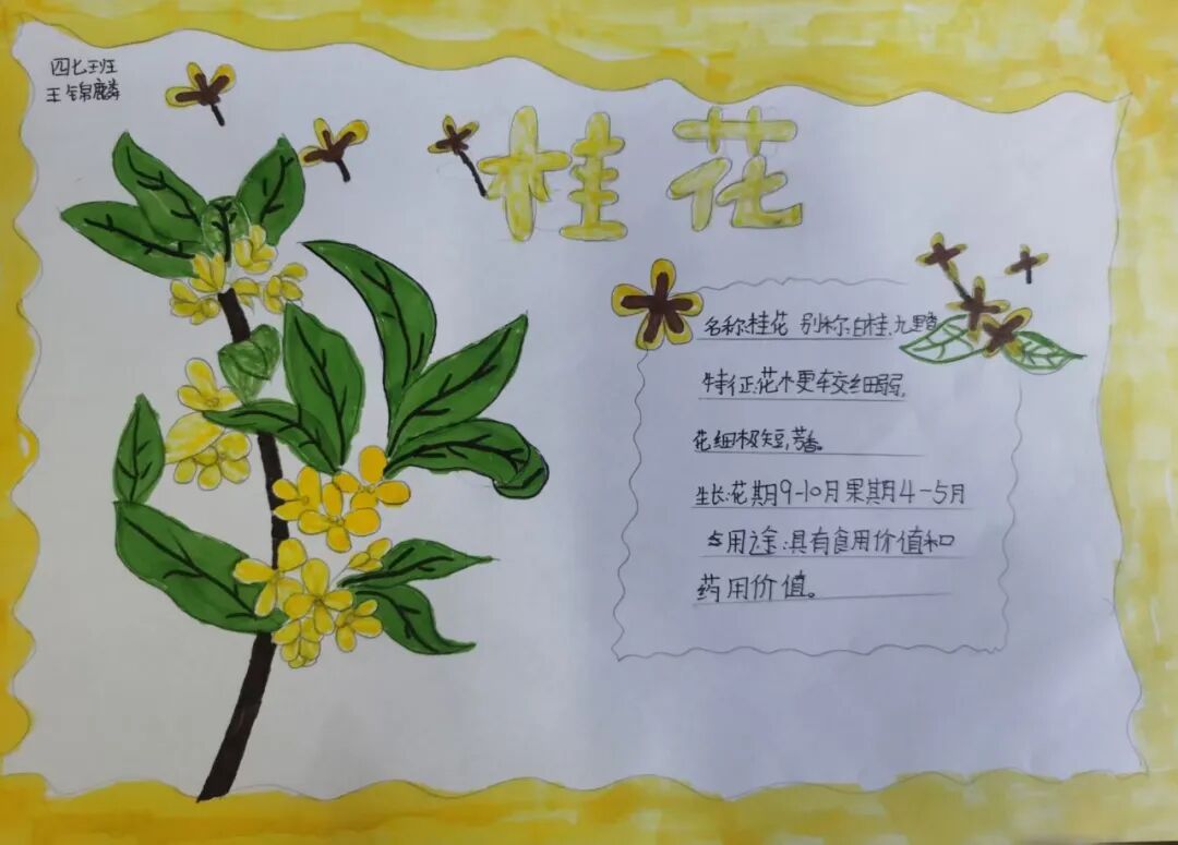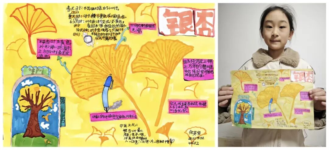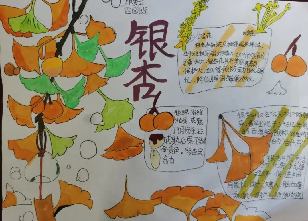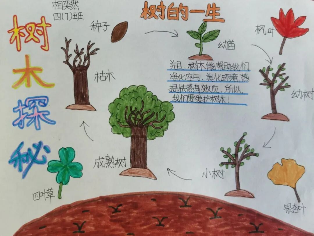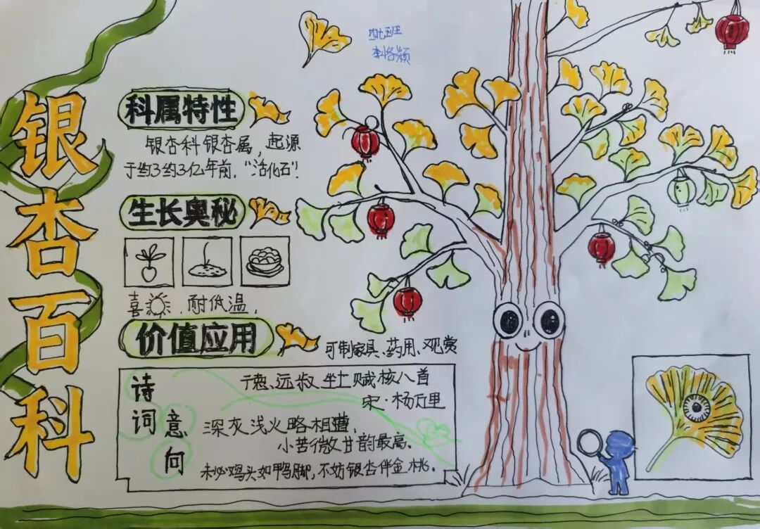 从直观感知到系统探究,孩子们开启了树木知识的深度学习。他们翻阅科普典籍,溯源树木的科属分类与生长习性;遨游网络世界,探寻树木的经济价值、药用功效与生态功用。小组合作筛选整合多元资料,精心打造 “树木探秘” 主题手抄报。版面设计兼具科学性与艺术性,图文相映、疏密有致,文字工整隽秀,插图意境悠远,每一份手抄报都是知识与创意的完美融合。
