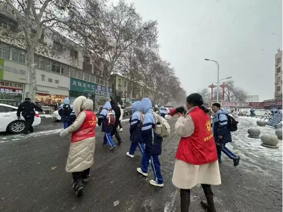 1月19日,气象部门发布暴雪预警,学生放学安全成了家长最牵挂的事。东关街道迅速启动恶劣天气应急响应,依托“街道—社区—网格”三级治理体系,联动东拐社区工作人员、辖区民警,在校园周边织密安全防护网,把“护学岗”打造成让师生安心、家长放心的“安全岗”。按照网格化分工,工作人员和民警提前抵达校园门口及周边关键路口,顶着刺骨寒风和纷飞雪花坚守岗位。“孩子们,来这边排队,等我们拦停车辆再一起过马路!”社区支部书记的声音在风雪中格外清晰。大家一边引导接送车辆有序停放、依次通行,避免造成拥堵;一边组织学生排队过马路,反复提醒司机减速慢行、保持安全车距;同时及时清理路口积雪、排查安全隐患,用忙碌的身影筑起一道坚实的安全屏障。