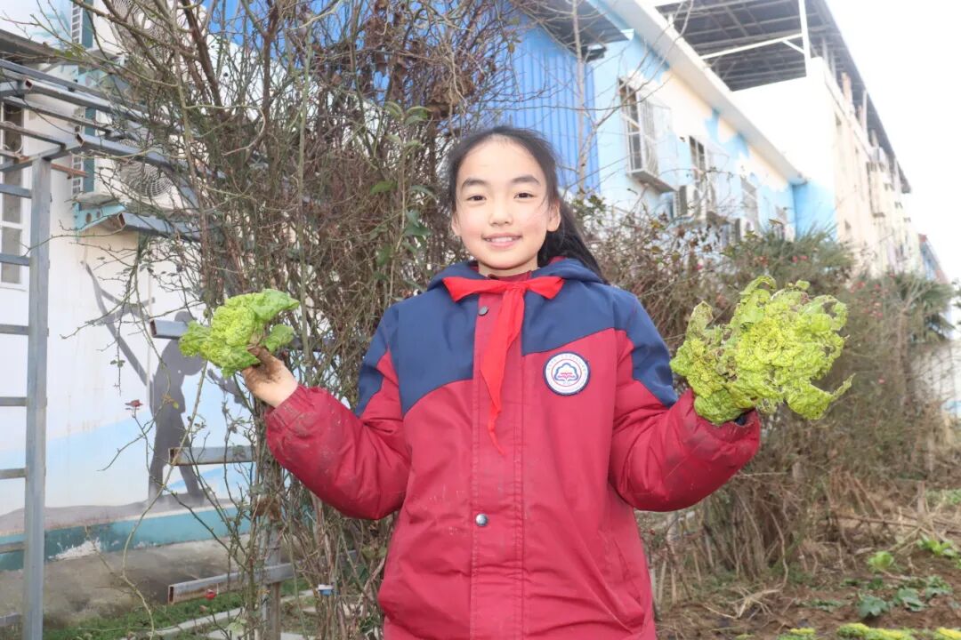 一颗颗青菜从泥土中连根拔起,叶片上还凝着晶莹的晨露,冬日清晨的微凉挡不住孩子们脸上漾开的丰收笑意。