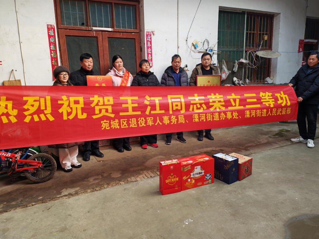近日,南阳市宛城区退役军人事务局双拥办主任曾庆岑一行专程前往溧河街道邢庄村现役军人王江家中开展走访慰问,为其家属送上王江在部队荣立三等功的喜报和诚挚的节日问候。