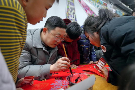 活动现场,红纸铺展,墨香四溢。书法爱好者们为师生们挥毫书写蕴含吉祥寓意的春联和“福”字,南阳市博物院知府衙门博物馆讲解员庞勐分享了年俗故事,全国最美志愿者、宛城区“百姓宣讲团”团长梁海磊进行“我们的节日·春节”微宣讲。