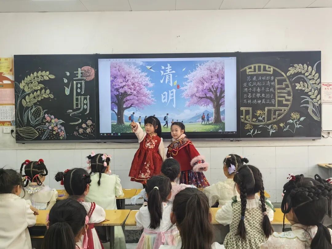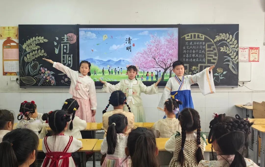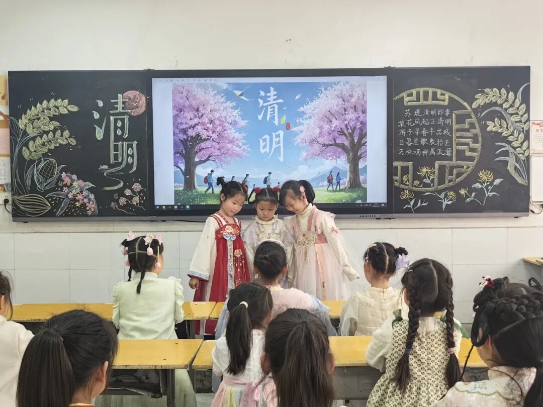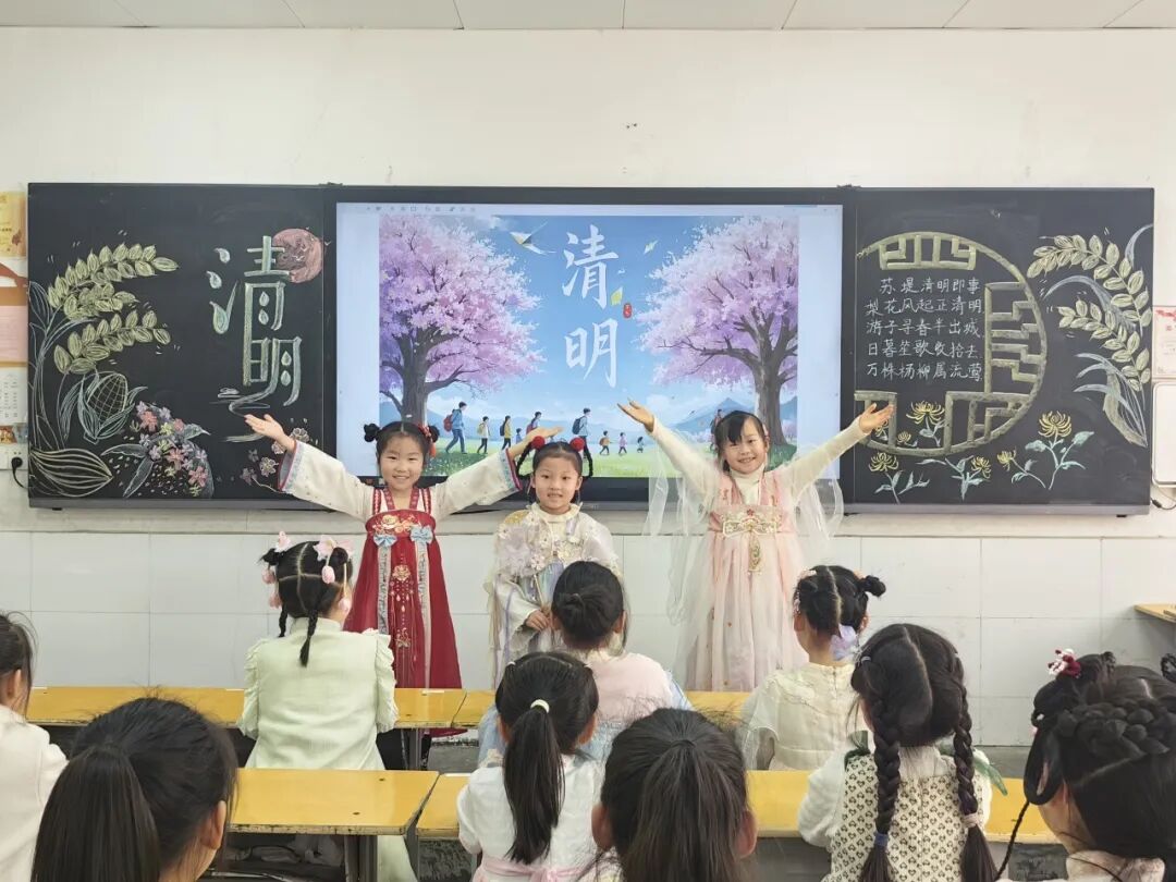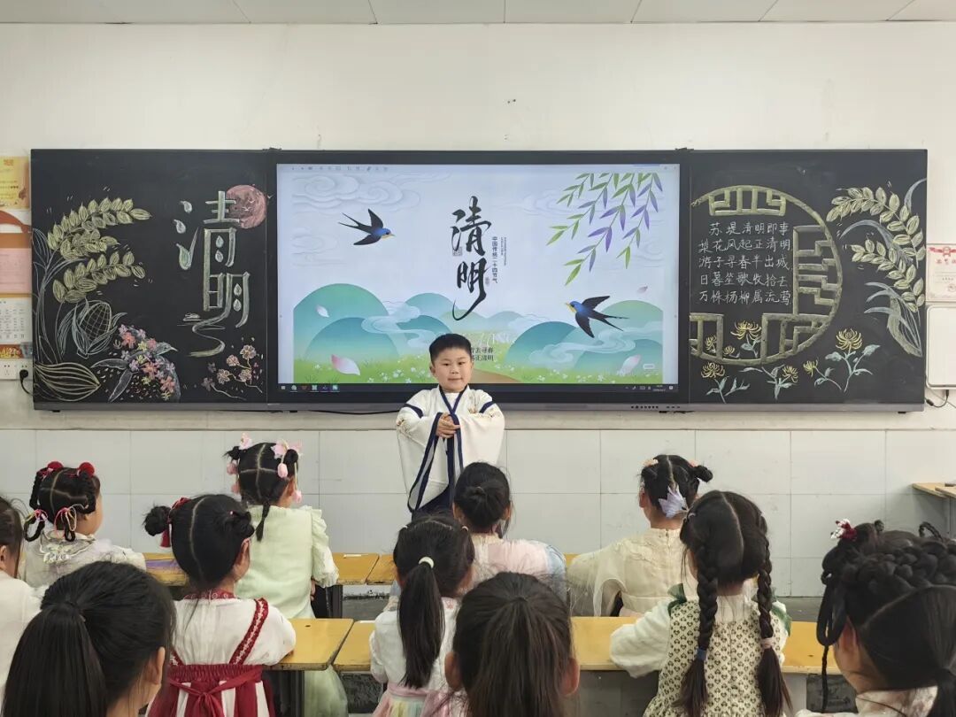 中华优秀传统文化是民族之根、育人之魂。低年级的同学们身着特色汉服亮相校园,衣袂翩跹、古韵盎然。孩子们将清明节气文化与中华服饰文化、礼仪文化深度融合,在沉浸式体验中感受传统节日的深厚底蕴,《清明》《清明即事》《春思》等诗词在吟诵中格外动听。通过这场兼具仪式感与文化感的展示,同学们直观领略了中华优秀传统文化的独特魅力。