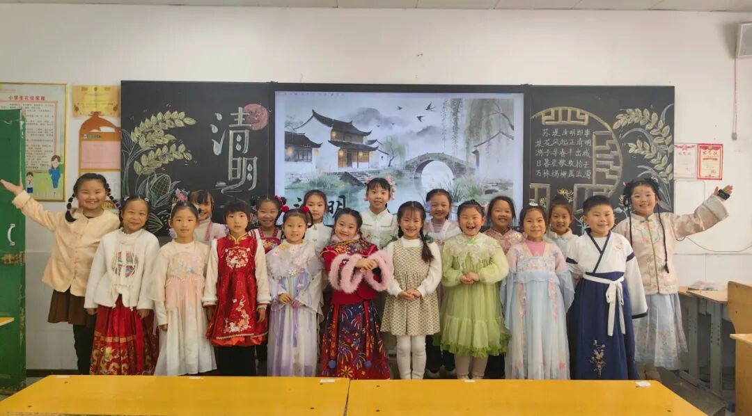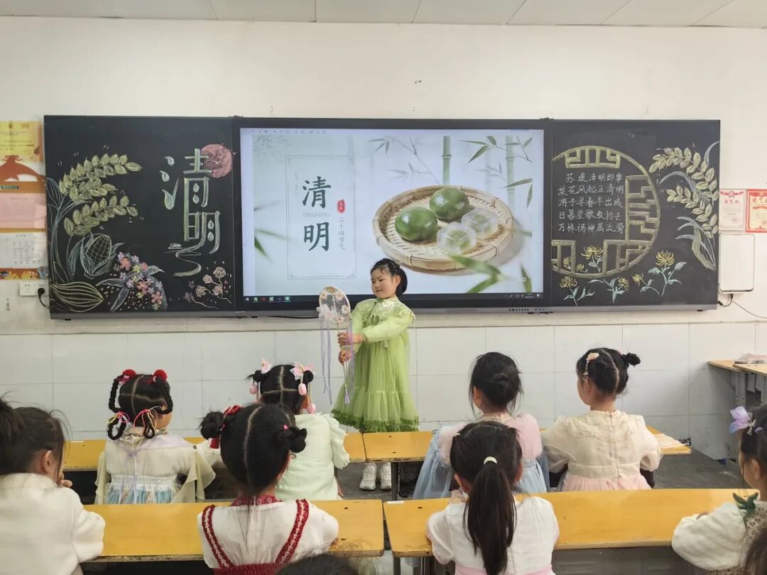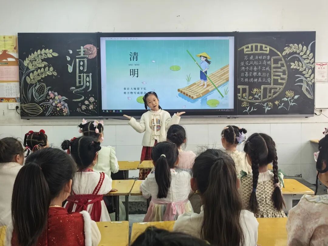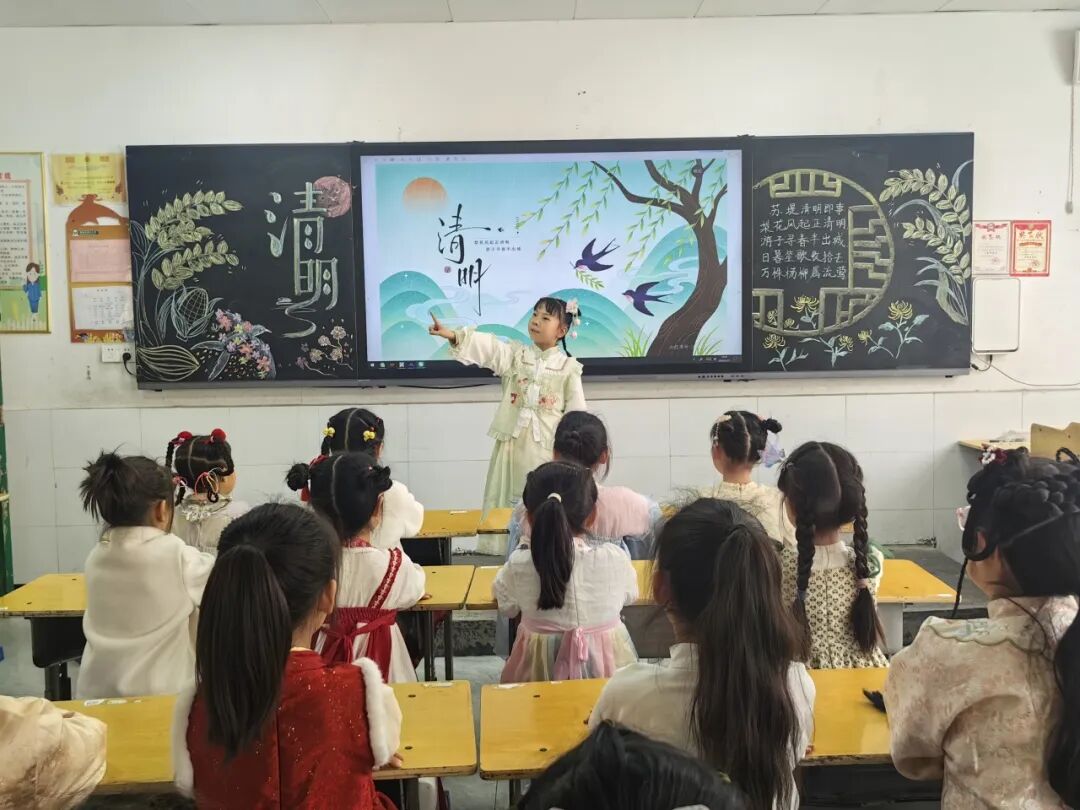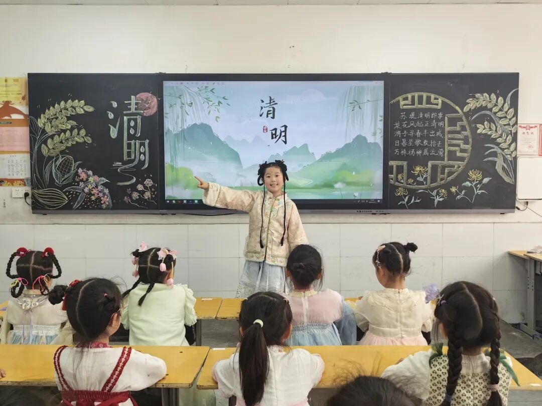 中华优秀传统文化是民族之根、育人之魂。低年级的同学们身着特色汉服亮相校园,衣袂翩跹、古韵盎然。孩子们将清明节气文化与中华服饰文化、礼仪文化深度融合,在沉浸式体验中感受传统节日的深厚底蕴,《清明》《清明即事》《春思》等诗词在吟诵中格外动听。通过这场兼具仪式感与文化感的展示,同学们直观领略了中华优秀传统文化的独特魅力。