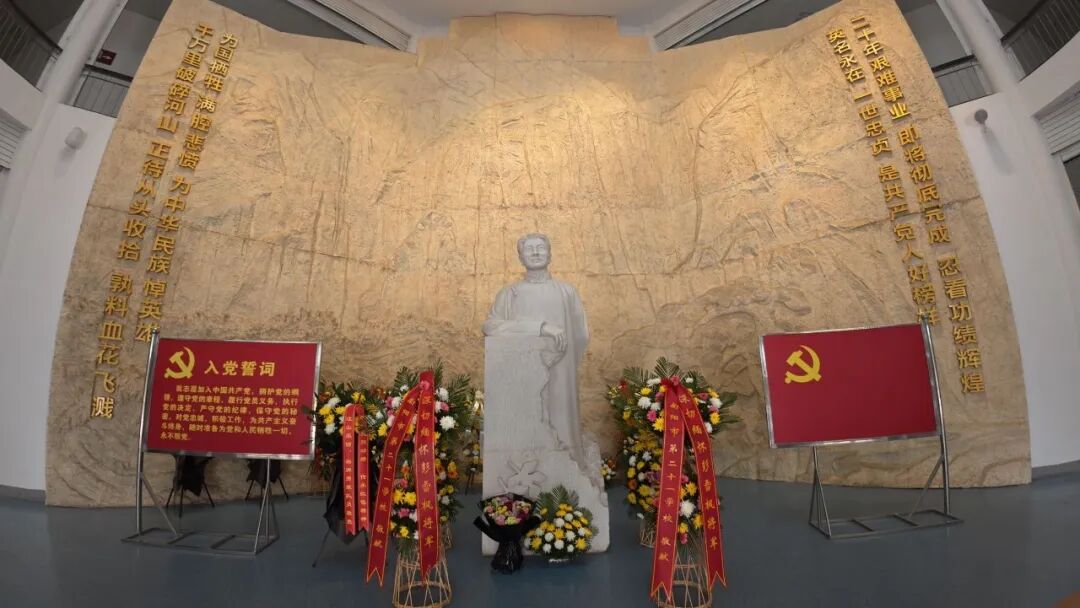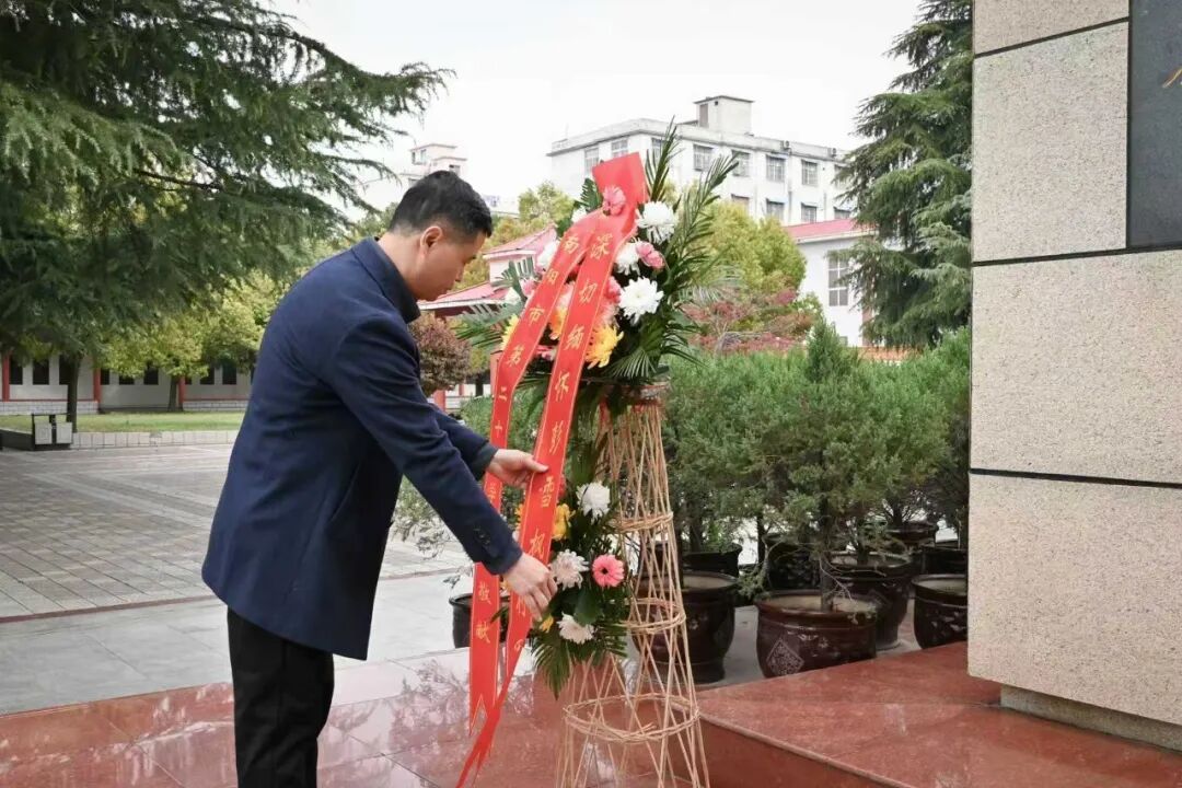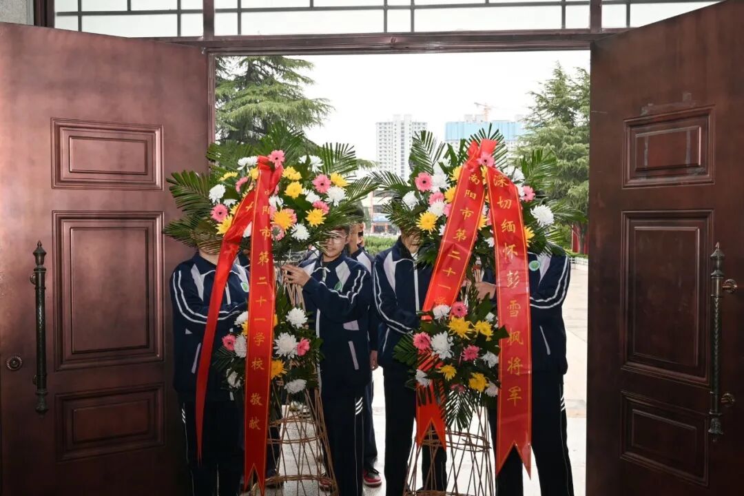 青山埋忠骨,白花祭英魂。学生代表手捧花篮,缓步走向彭雪枫烈士雕像,将承载着全体师生无限崇敬与深切缅怀的花篮轻轻敬献。花篮静静伫立,诉说着对革命先烈的追思,寄托着对英雄先辈的敬意。