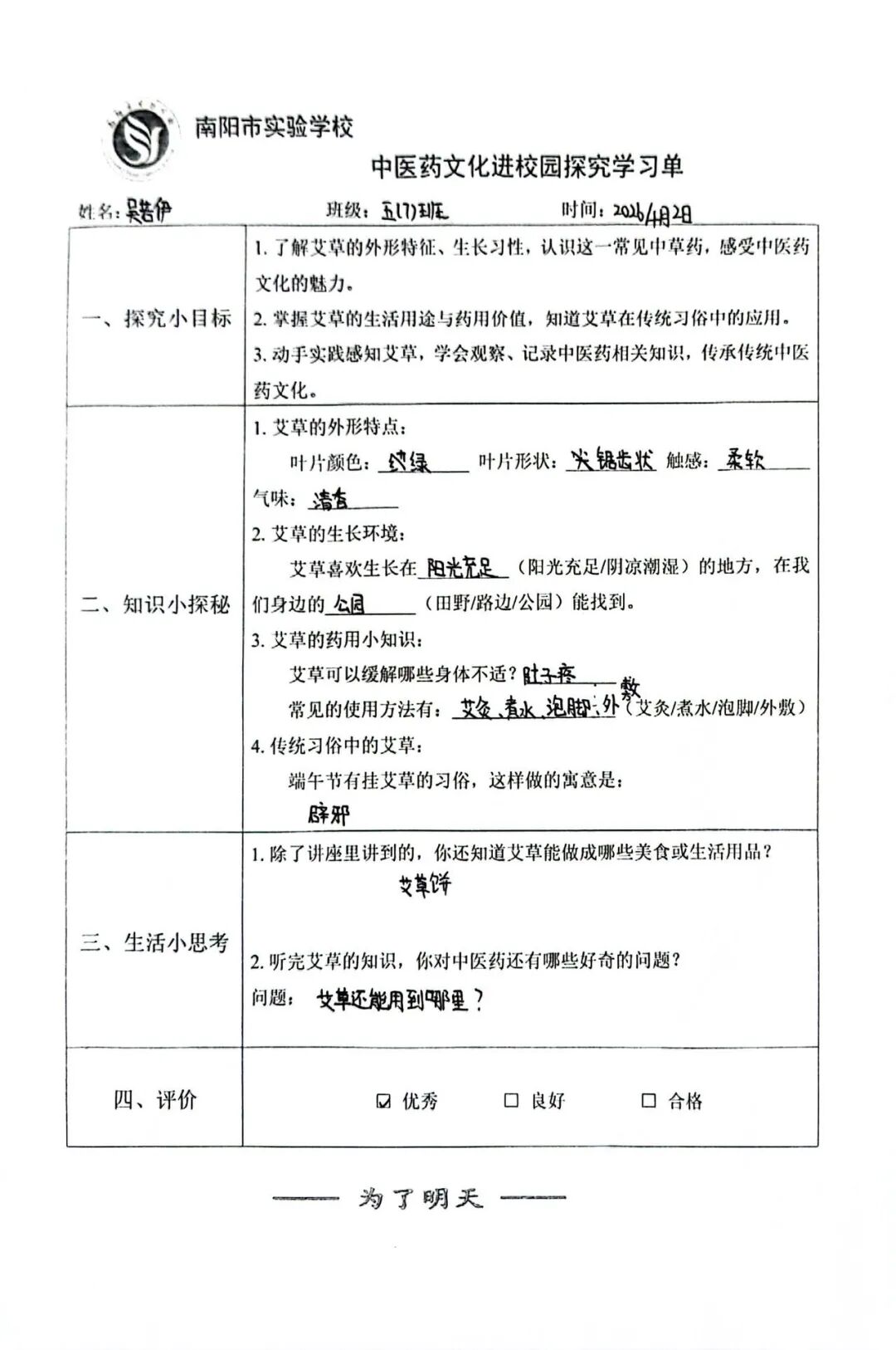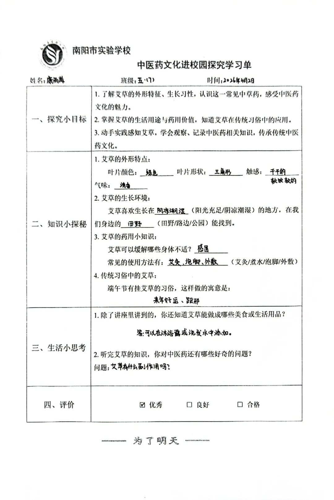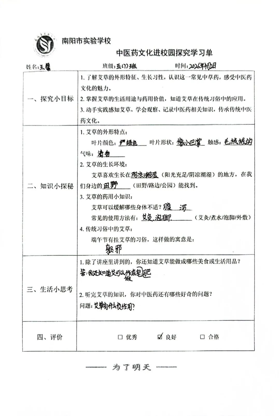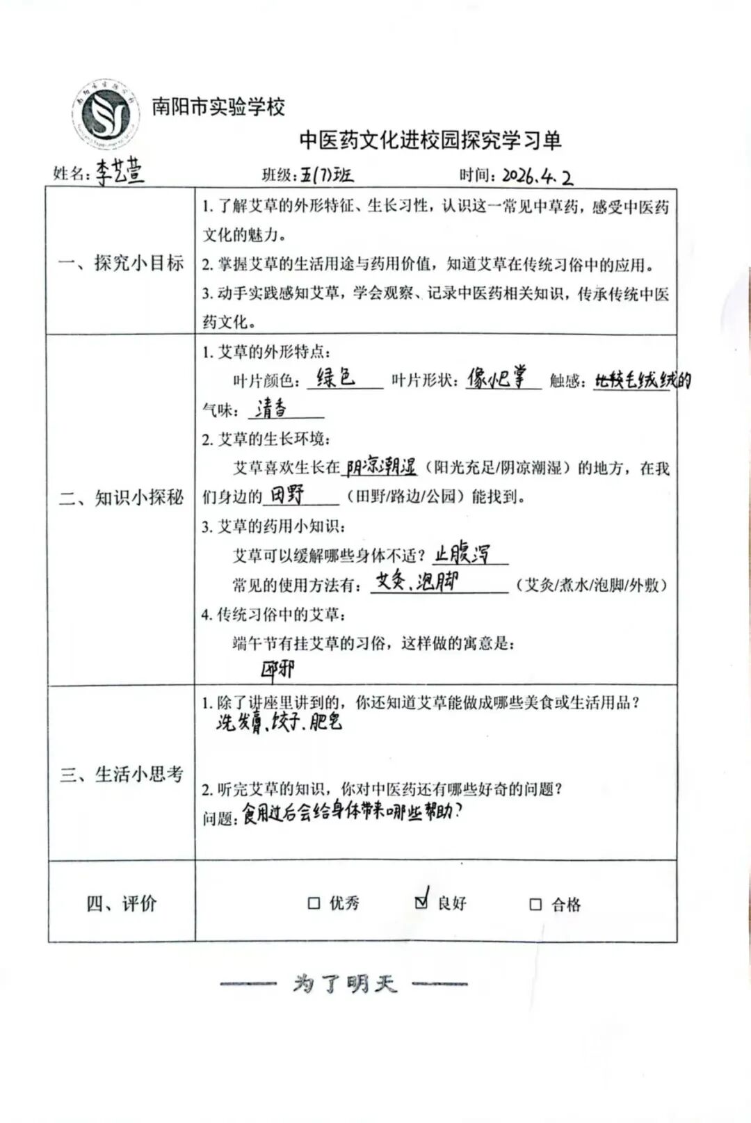 学生们全神贯注,认真聆听马老师的讲解,并积极参与互动环节,就艾草的药理特性与日常应用踊跃提问。课后,大家还用心完成了相关实践作业,展现出对中医药文化的浓厚兴趣与求知热情。