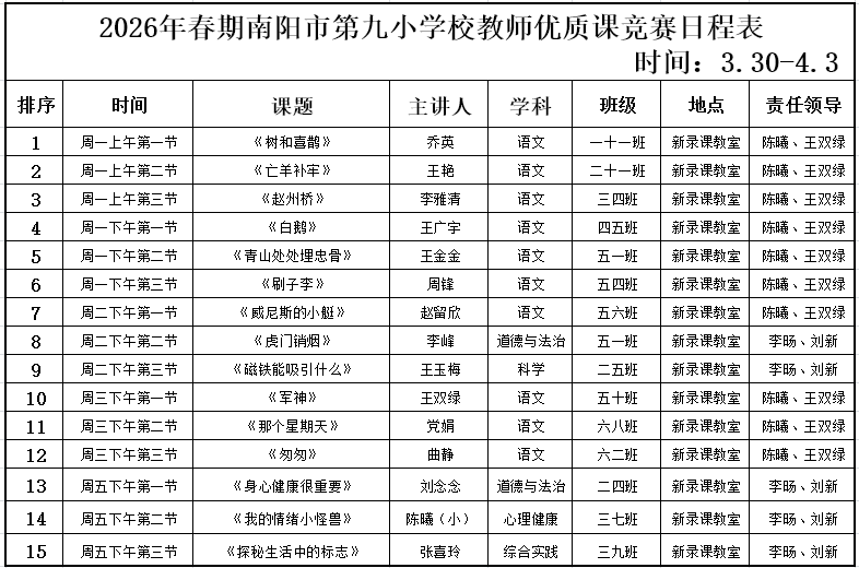 春日启新序,教研正当时。为深化课堂教学改革,锤炼育人本领,提升教师专业素养,南阳市第九小学春期教师优质课竞赛活动如期启幕。全体教师以匠心深耕课堂,以竞技助力成长,让优质教学在融融春光中绽放光彩。