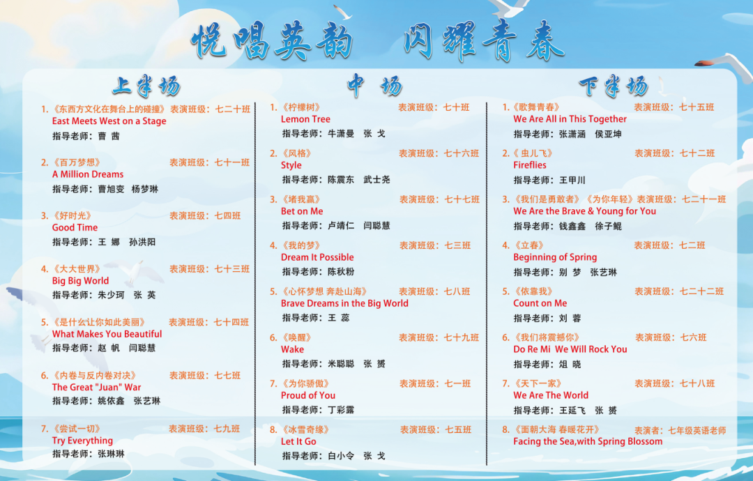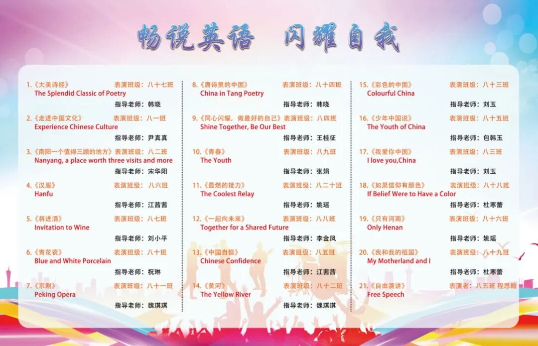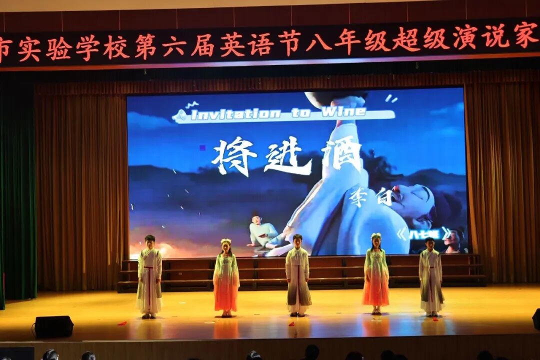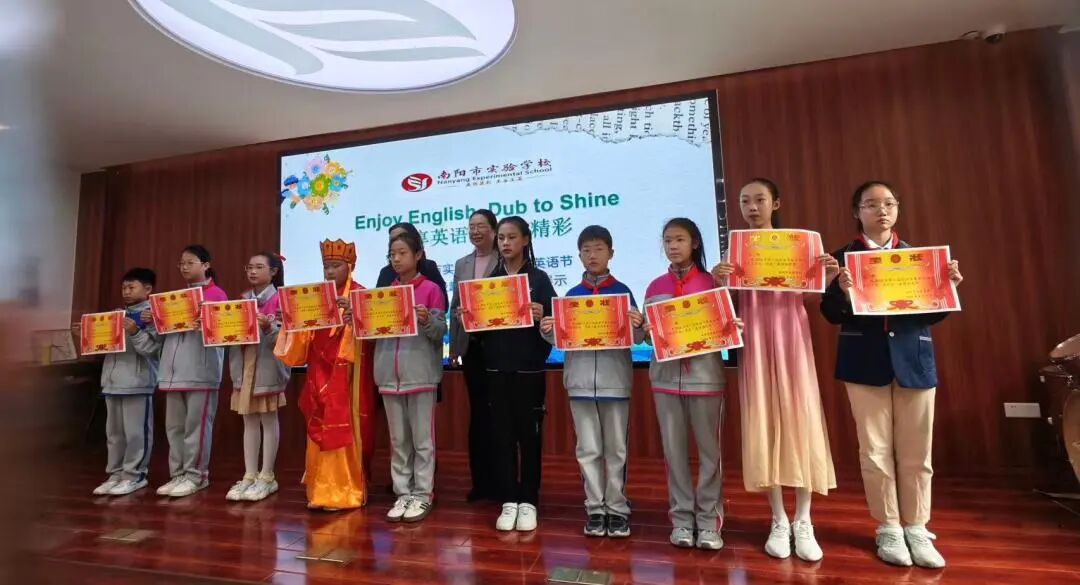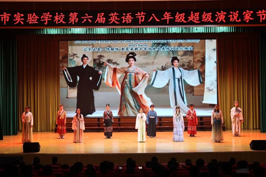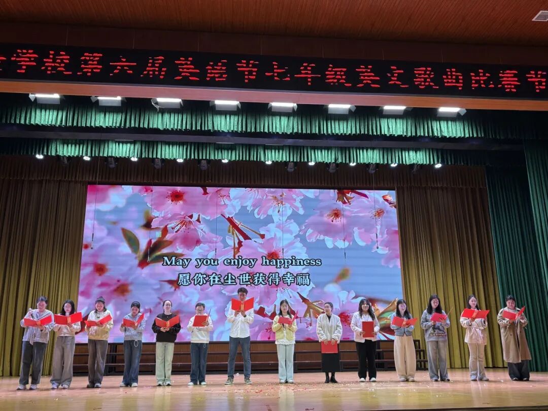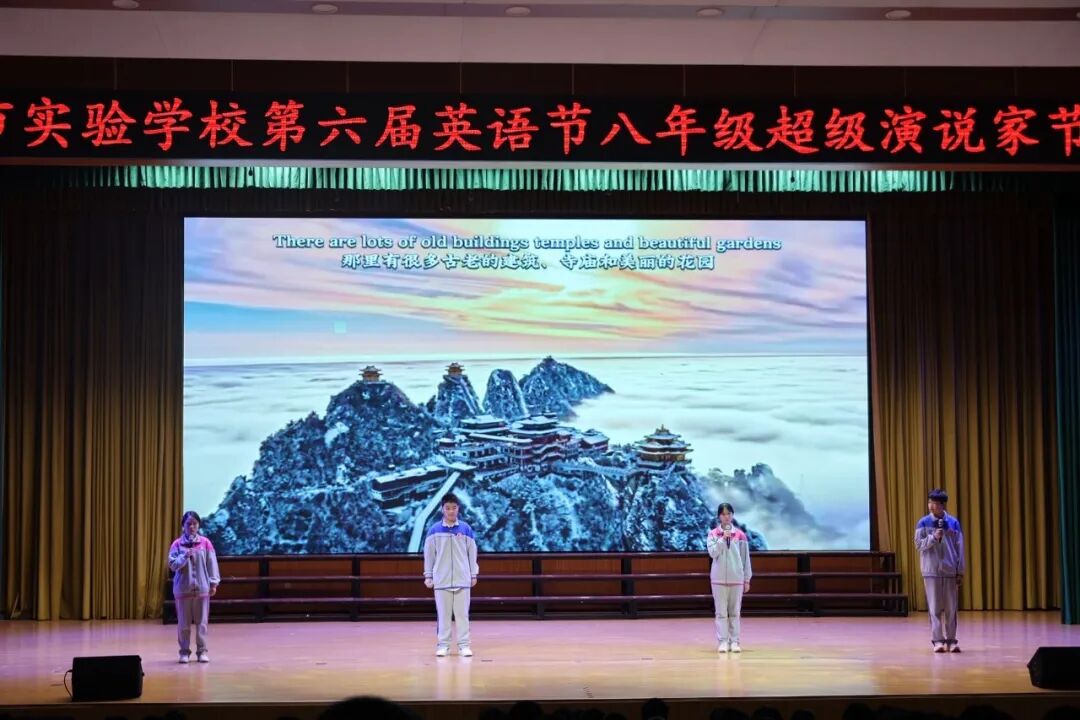 为进一步丰富校园文化,激发学生学习英语热情,引领更多学生在传播中国文化的舞台上展现青春风采,4月7日—10日,南阳市实验学校以“悦享英语,闪耀自我 Enjoy English,Shine Yourself”为主题,开展第六届英语节活动。孩子们用歌声、朗诵、戏剧和欢笑,感受英语的魅力。 Opening Ceremony 4月7日早上,孩子们踏着欢快的歌声,在老师们和卡通人物的英语问候中走进校园,第六届英语节拉开了帷幕。 Watch for fun 一二年级以“悦享英影,快乐成长”为主题,开展了趣味英文动画观影活动。同学们在精彩的影片中聆听地道发音,在生动的故事里感受英语魅力,让经典动画成为打开英语世界的小钥匙。在欢笑与沉浸中体验学习乐趣,既收获了童真与快乐,也营造了轻松愉悦的英语学习氛围。 Draw for fun 三年级以“趣绘英语,字母焕彩”为主题,开展了创意字母画展示活动。同学们用灵动的色彩、巧妙的构思与丰富的想象,将英文字母与趣味图案巧妙结合,让单调的字母变得鲜活生动。在绘画与创作中感受英语乐趣,既展现了童真创意,也营造了活泼浓郁的英语学习氛围。 Act for fun 四年级以“悦享英语,演绎精彩”为主题,带来了一场精彩的英语舞台剧专场展演。同学们精心编排剧目,用流利自然的口语、自信大方的表演,将英语学习与舞台艺术完美结合,充分展现了扎实的语言功底与蓬勃的少年朝气,营造出浓郁的校园英语文化氛围。 Dub for fun 五年级以“悦享英语,配出精彩”为主题,献上了一场精彩纷呈的英语配音展演。同学们选取经典影视片段,用纯正流畅的口语、生动传神的演绎,将语言学习与艺术表达巧妙融合,尽显英语魅力与少年风采,为校园增添了浓厚的英语文化氛围。 Share for fun 六年级开展了一场别开生面的“英语一般将来时·周末/暑假计划”手抄报创作活动。同学们化身小小设计师,用画笔与英文书写对未来的美好期许!孩子们用心构思周末休闲、暑假出行、成长规划等内容。同学们创意满满,手抄报既具知识性,又有独特的艺术美感。充分展现了扎实的英语基础与丰富的想象力。当英语遇见创意,学习便变得更有乐趣!学生在乐中学、在学中用,全面提升了英语素养! Sing for fun 七年级以“悦唱英韵,闪耀青春”为主题开展了英语歌唱比赛。每一个班级的节目都创意十足、精彩纷呈。同学们用歌声拥抱英语,用风采展示自我,充分展现出七年级学子朝气蓬勃、积极向上的精神风貌,也让大家在欢乐的氛围中感受英语魅力,体会学习乐趣。整场比赛气氛热烈、秩序井然,掌声与喝彩不断。最后,老师们深情朗诵,为整场活动献上了一场精彩的视听盛宴。 七二十班《东西方文化在舞台上的碰撞》 East Meets West on a Stage 七四班《好时光》 Good Time 七十一班《百万梦想》 A Million Dreams 七十三班《大大世界》 Big Big World 七十四班《是什么让你如此美丽》 What Makes You Beautiful 七九班《尝试一切》 Try Everything 七七班《内卷与反内卷对决》 The Great "Juan" War 七十班《柠檬树》 Lemon Tree 七十六班《风格》 Style 七三班《我的梦》 Dream It Possible 七十七班《堵我赢》 Bet on Me 七八班《心怀梦想 奔赴山海》 Brave Dreams in the Big World 七十九班《唤醒》 Wake 七五班《冰雪奇缘》 Let It Go 七一班《为你骄傲》 Proud of You 七十九班《唤醒》 Wake 七十五班《歌舞青春》 We Are All in This Together 七二十一班《我们是勇敢者》《为你年轻》 We Are the Brave & Young for You 七十二班《虫儿飞》 Fireflies 七二班《立春》 Beginning of Spring 七二十二班《依靠我》 Count on Me 七年纪英语教师歌曲串烧 七六班《我们将震撼你》 Do Re Mi We Will Rock You Speak for fun 八年级以“畅说英语,闪耀自我”为主题,开展了“超级演说家”英语演讲比赛。舞台上,八年级学子们自信登场、从容表达,用流利纯正的口语诉说青春感悟,用铿锵有力的演讲传递心中热爱,每一段精彩的演说都尽显扎实的英语功底与昂扬的少年朝气。同学们在勇敢发声中突破自我、锻炼表达,在思想碰撞中收获成长、收获自信,不仅感受了英语语言的独特魅力,更在舞台上尽情绽放属于自己的闪耀光彩,书写了青春最动人的成长篇章! 八一班 情景剧 Experience Chinese Culture《走进中国文化》 八三班 演讲 I love youChina《我爱你中国》 八七班 演讲 Invitation to Wine《将进酒》 八九班 演讲 The Youth《青春》 八二十班 演讲 The Coolest Relay《最燃的接力》 八五班 演讲 Chinese Confidence《中国自信》 八二班 演讲 Nanyang, a place worth three visits and more《南阳一个值得三顾的地方》 八八班 情景剧Together for a Shared Future 《一起向未来》 八六班 演讲 Hanfu《汉服》 八十七班 情景剧 The Splendid Classic of Poetry《大美诗经》 八十一班 演讲 Peking Opera《京剧》 八十三班 演讲 Colourful China《彩色的中国》 八十九班 演讲 My Motherland and I《我和我的祖国》 八十五班 演讲 The Young China 《少年中国说》 八十二班 演讲 The Yellow River《黄河》 八十八班 演讲 If Belief Were to Have a Color《如果信仰有颜色》 八十六班 演讲 Only Henan《只有河南》 八十班 演讲 F Blue and White Porcelain《青花瓷》 八十四班 演讲 F China in Tang Poetry《唐诗里的中国》 八四班 演讲 Shine Together, Be Our Best《同心闪耀,做最好的自己》 Award Ceremony 本届英语节活动精彩纷呈、形式多样,覆盖面广,同学们在活动中尽显个人才华与团队协作精神,传承中华优