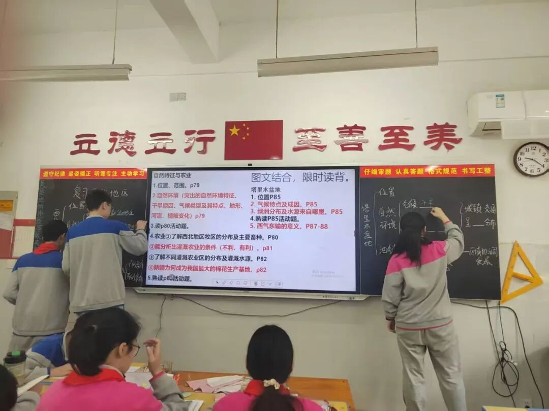 十九中魏静老师、南泰路校区张聪老师,分别围绕本课课程标准解读与课堂落地实施展开深入交流研讨。本节课以问题为核心导向,融合限时读背、知识梳理归纳、当堂限时训练等多元教学形式,搭建起 “自然特征 — 农业生产 — 区域协同” 的完整复习框架,整体逻辑清晰、重难点鲜明,贴合学生认知规律与复习学情。
