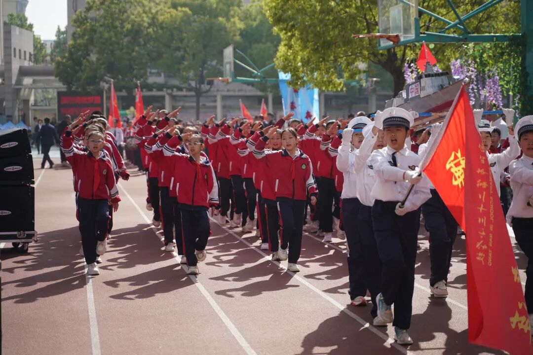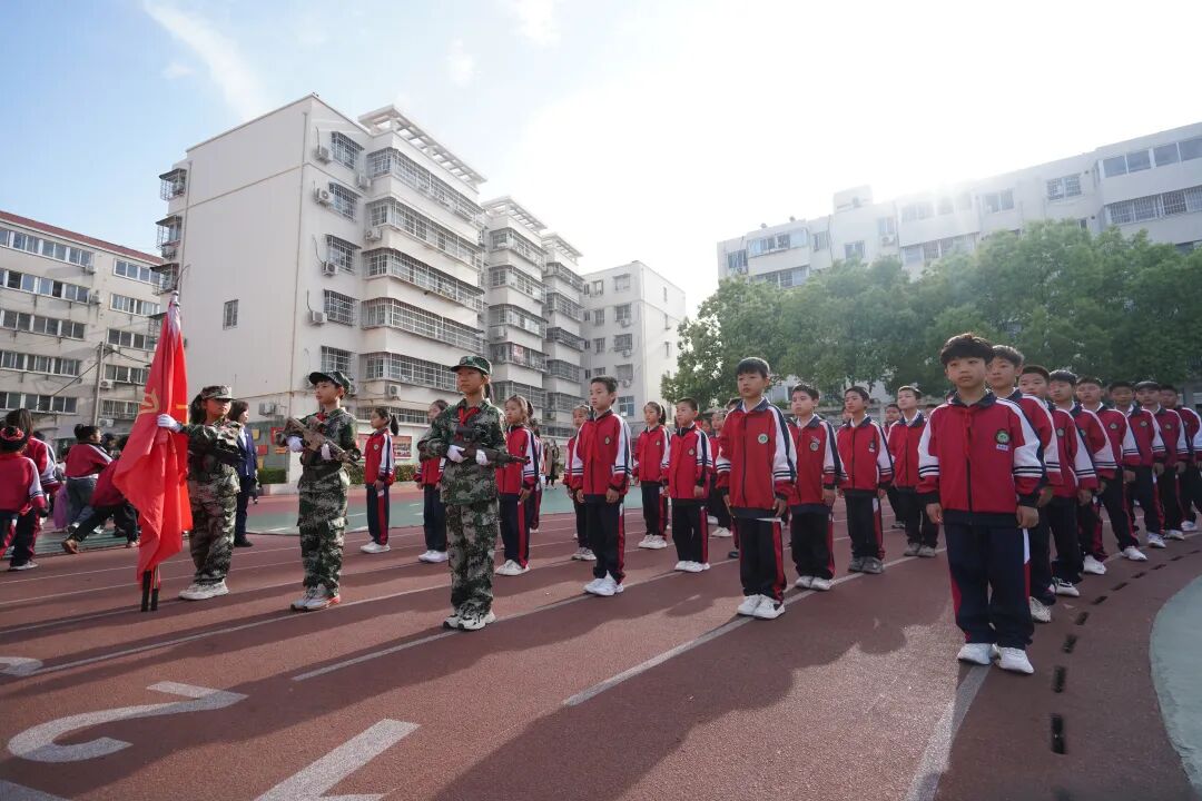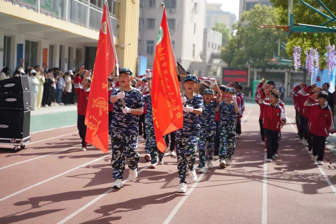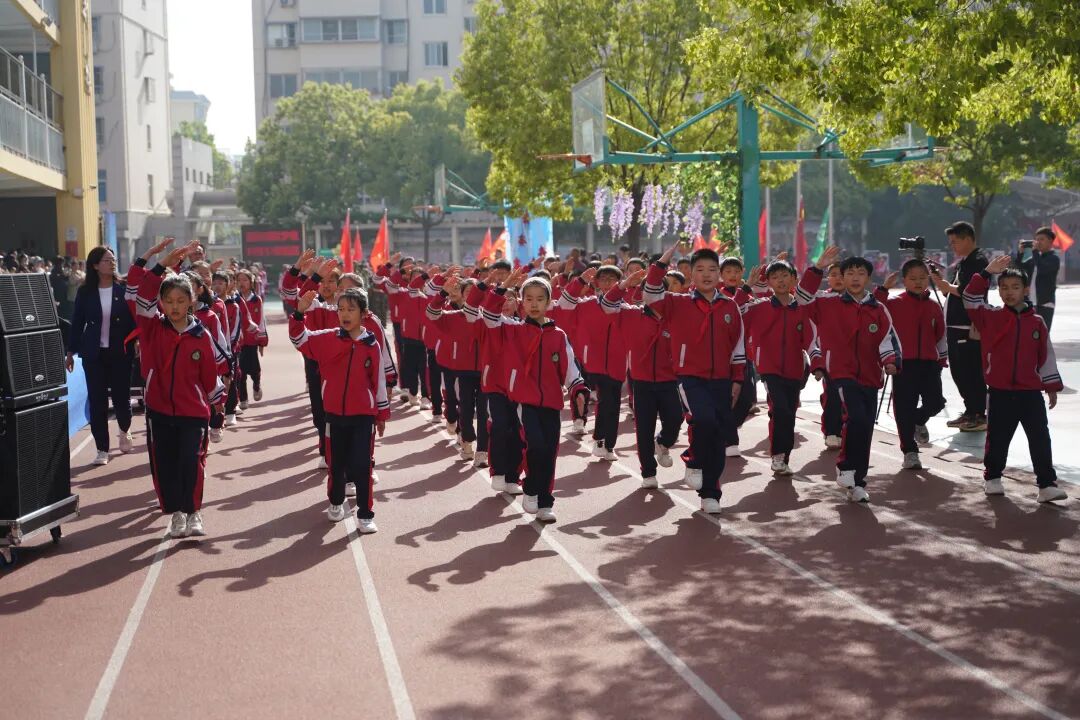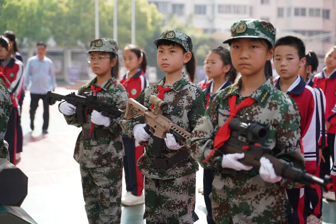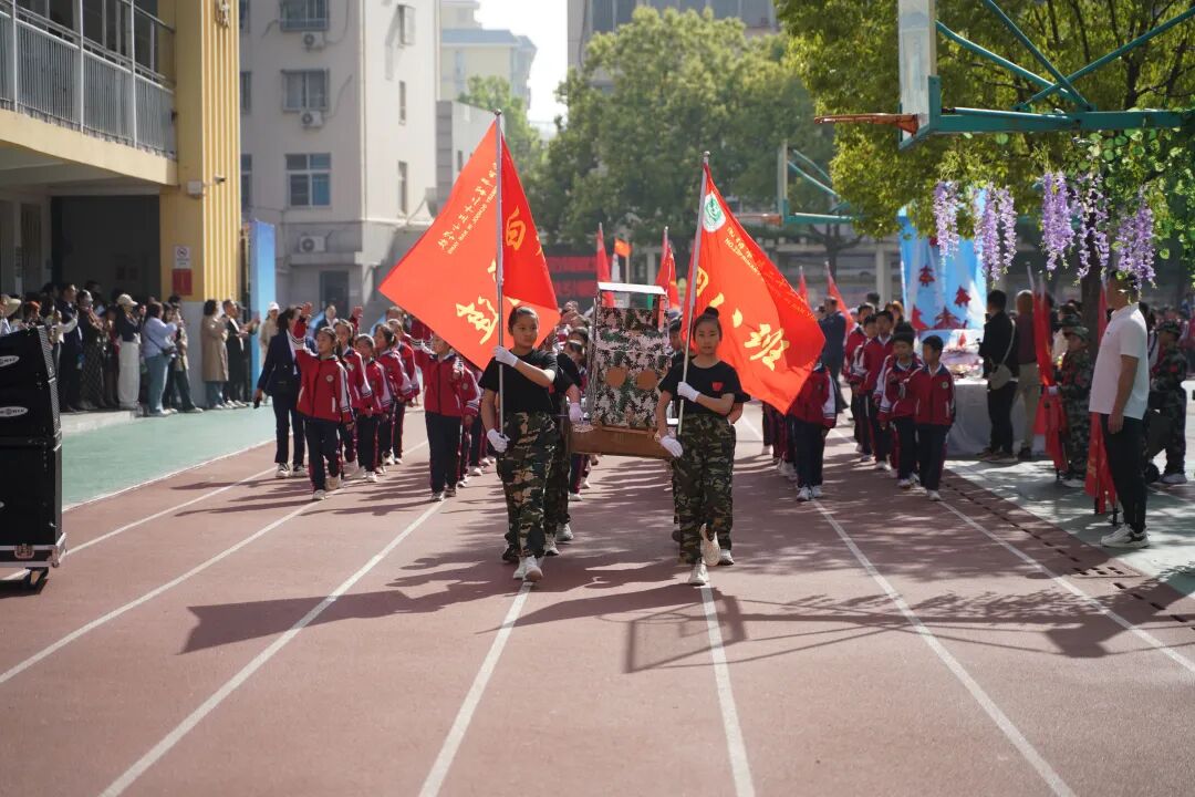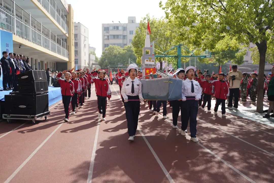开幕式现场国旗飘扬,方阵震撼,四、五年级学生组成“黄继光连”“狼牙山五壮士连”“刘老庄连”“蓝天利刃方阵”“王海大队”“神炮连”“白老虎连”“海空雄鹰连队”“东风第一旅”等特色方阵,手持自制航模、战斗机模型,创意造型、口号嘹亮,30秒特色展示赢得阵阵掌声。