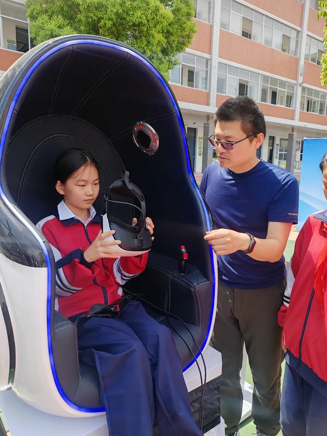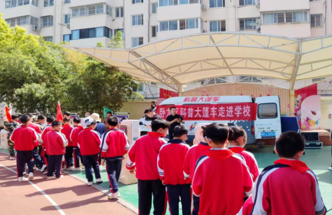 在操场一角,区科技馆“科普大篷车”携VR体验、奇趣教具进校园,馆校合作,大手与小学牵手,共同点燃科学梦想。